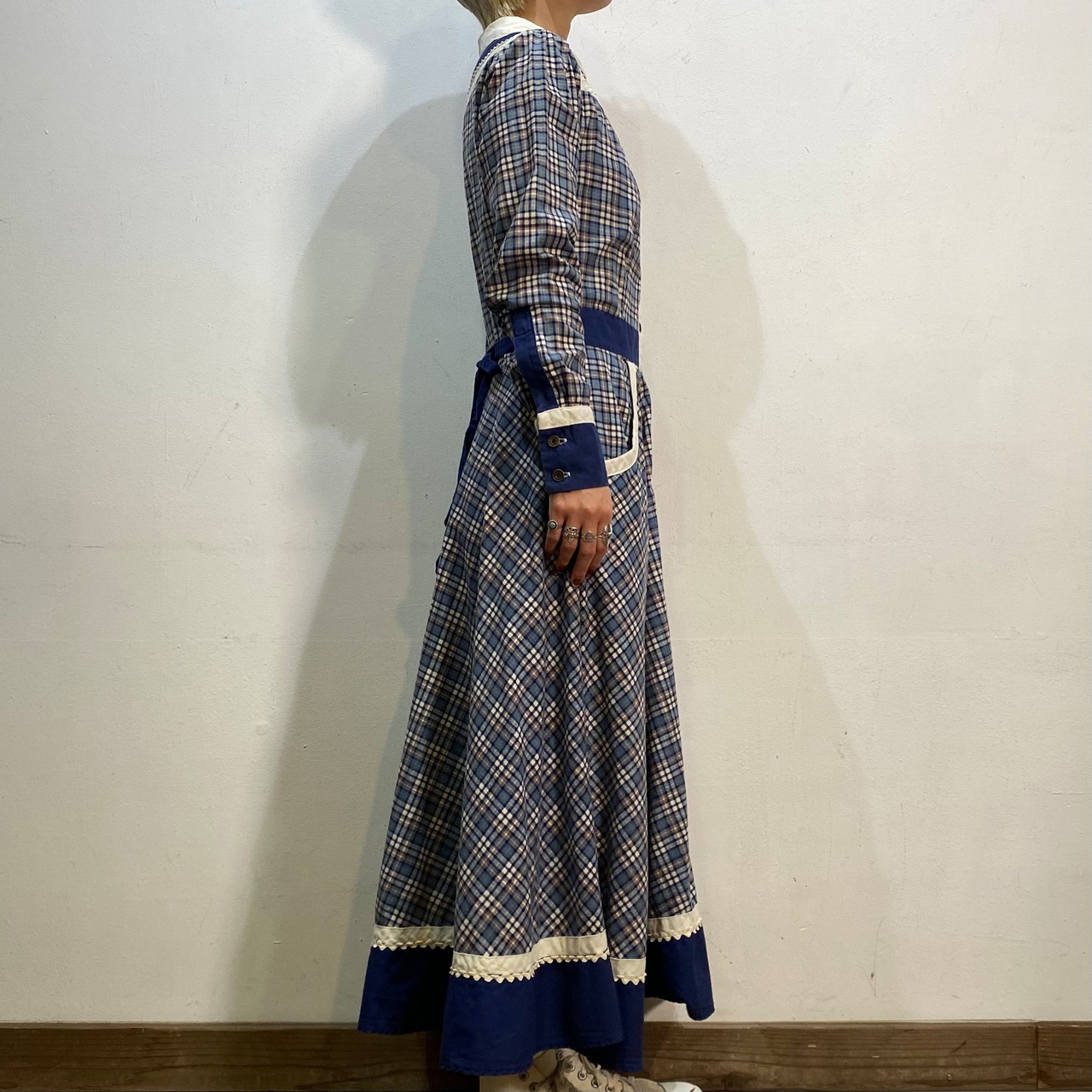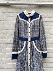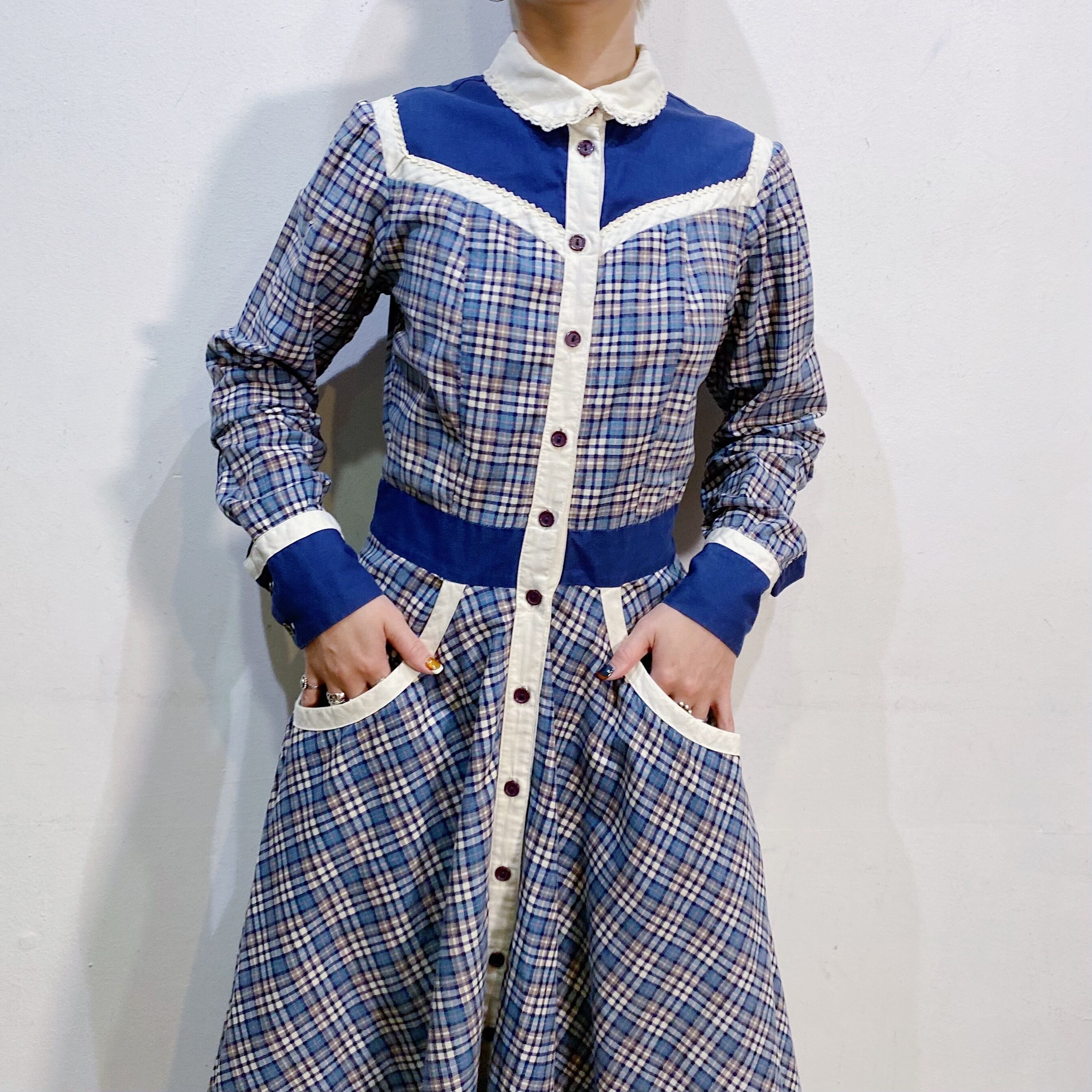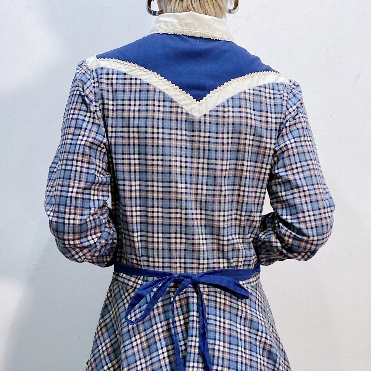 70s blue plaid cotton dress(maybe GUNNESAX but no tag)