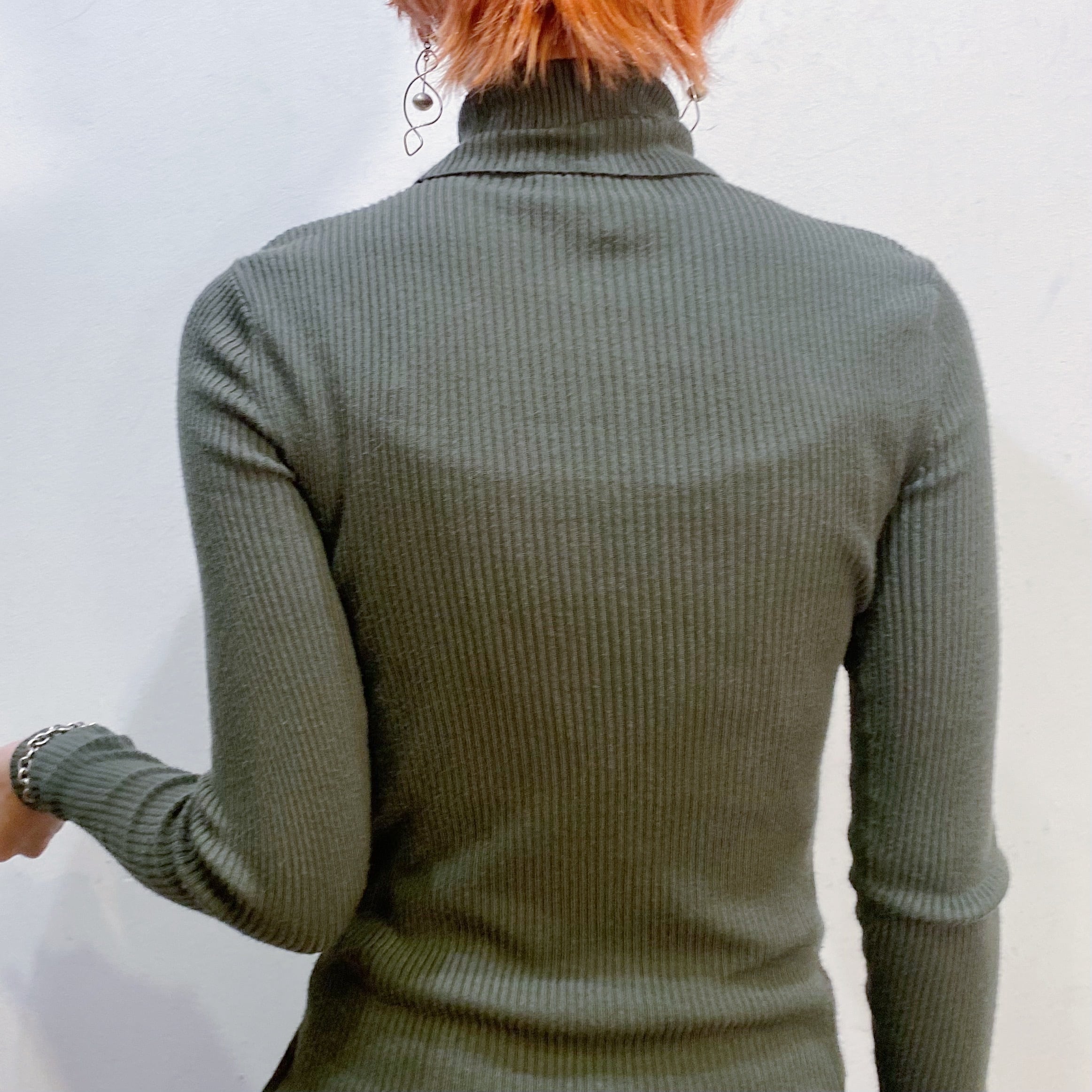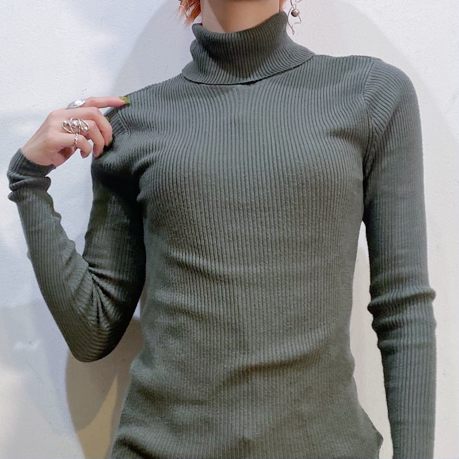 カーキカラーで使い勝手のいい、タートルネックニットです。
