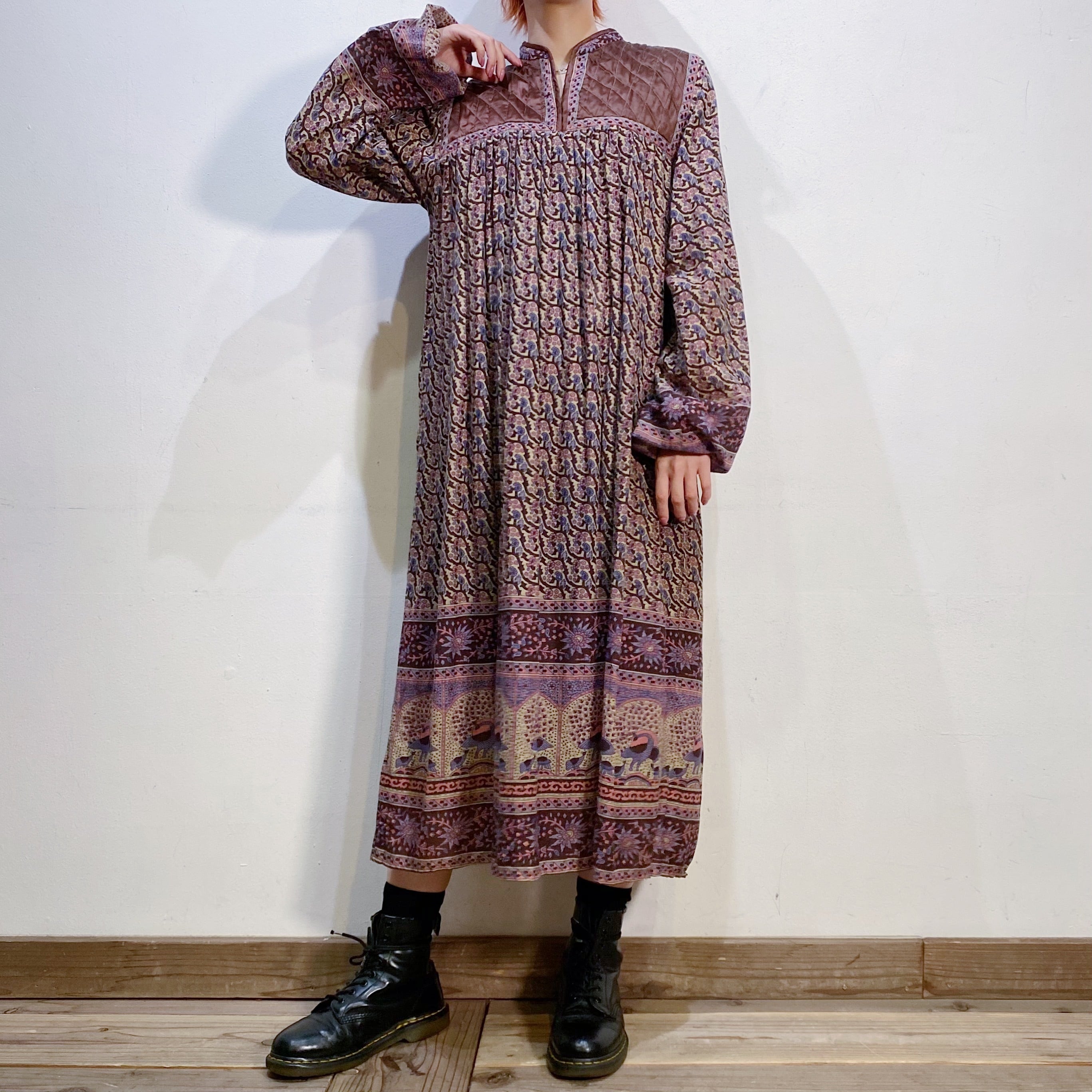 ブラウン・ピンク・パープルの色合いが大人可愛い、70年代のインド綿ロングワンピースです。