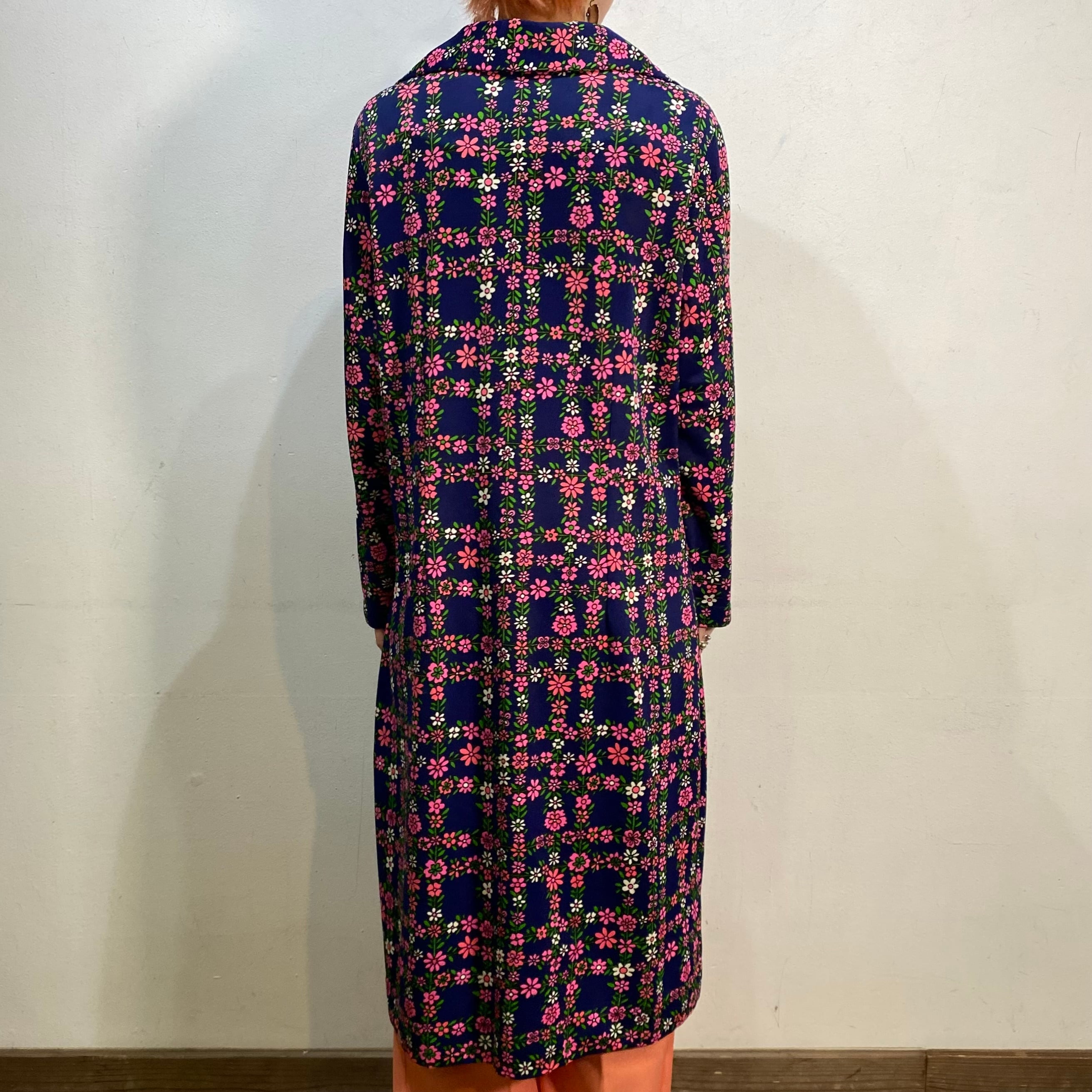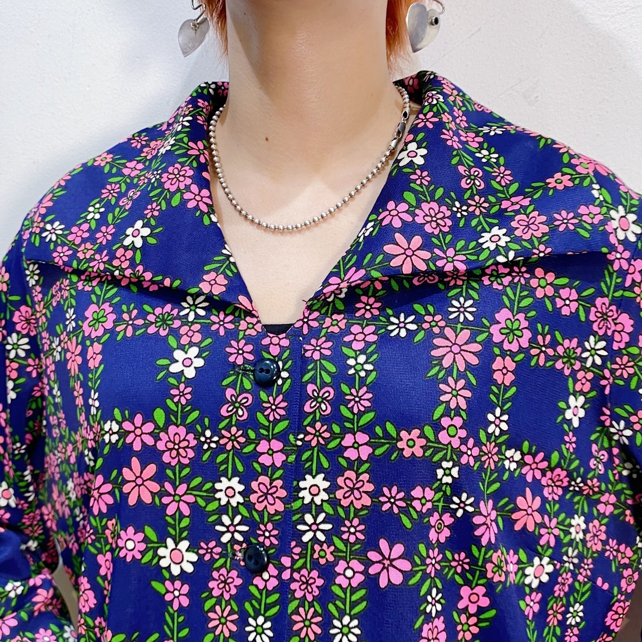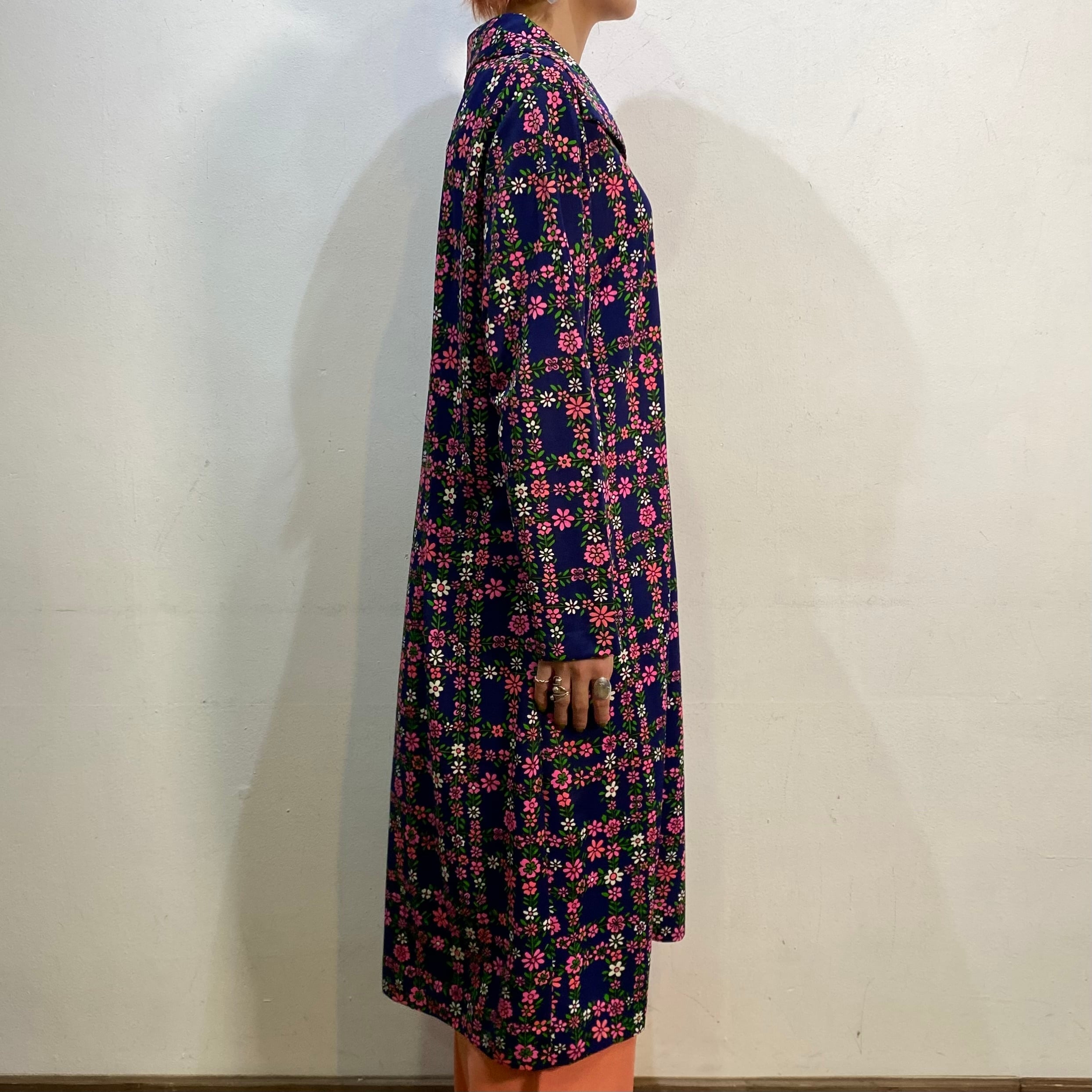 ネイビーべースにピンクの花柄が可愛い、70年代のワンピースです。