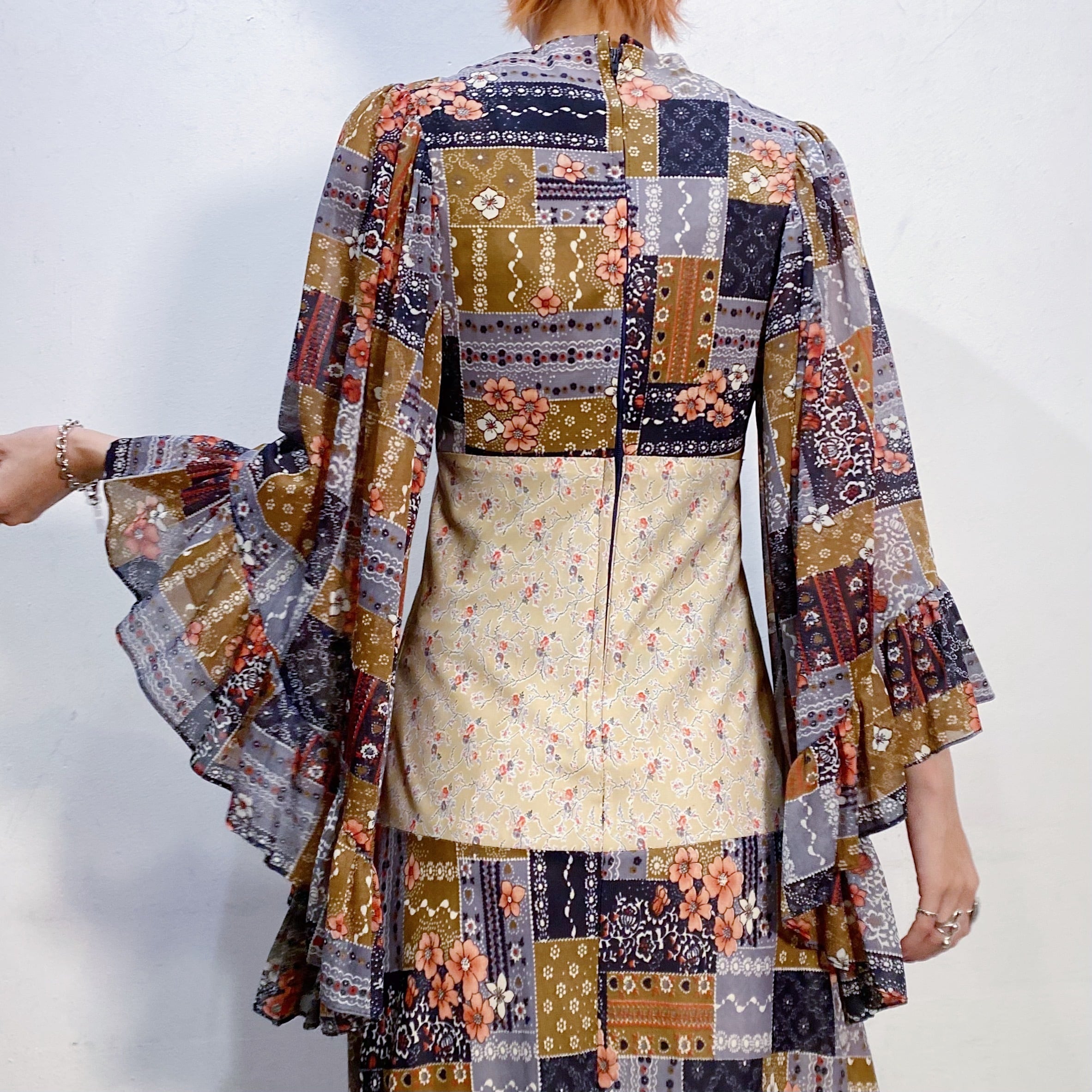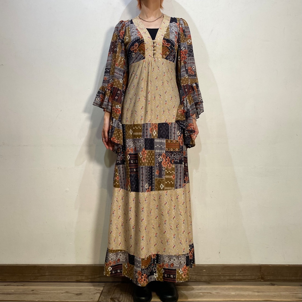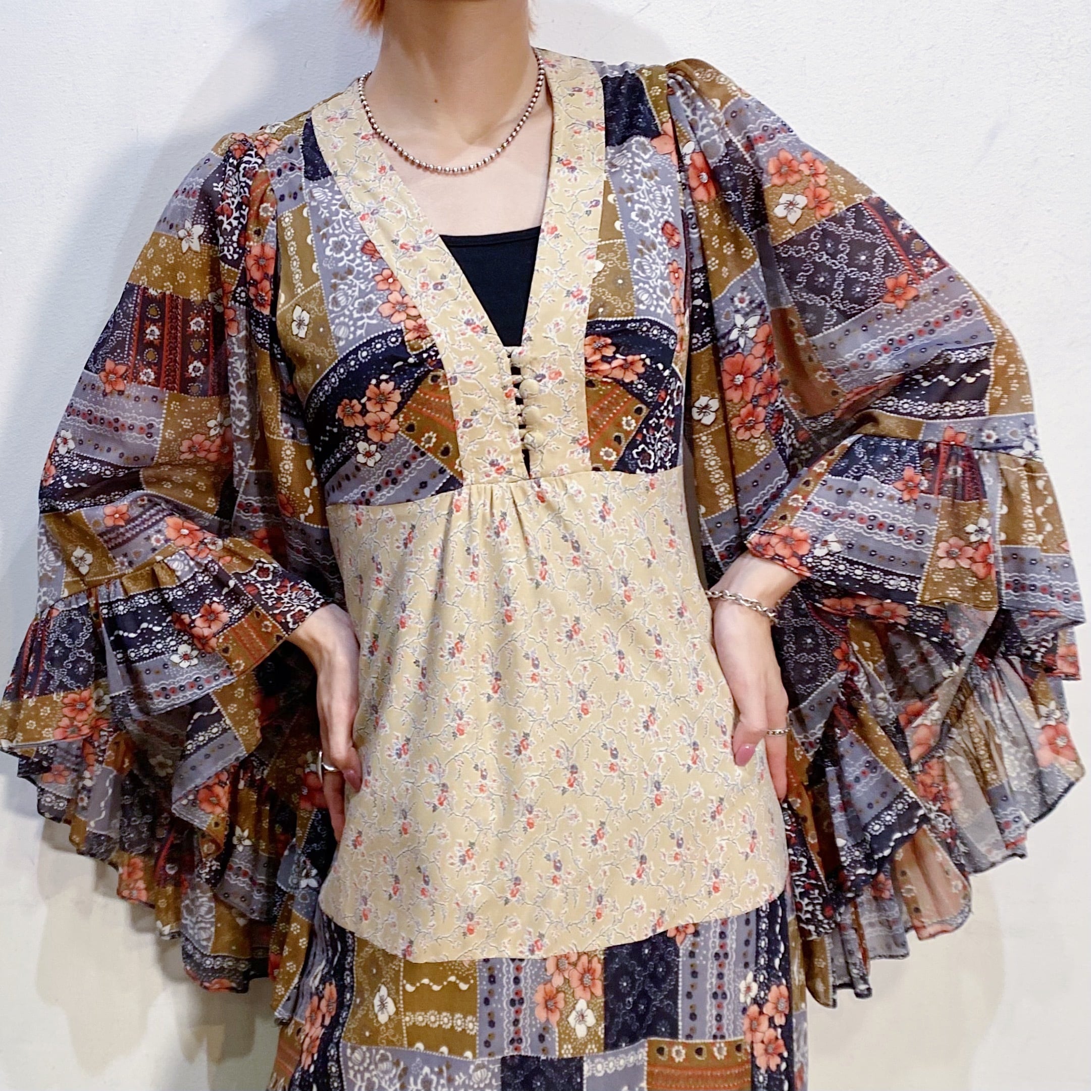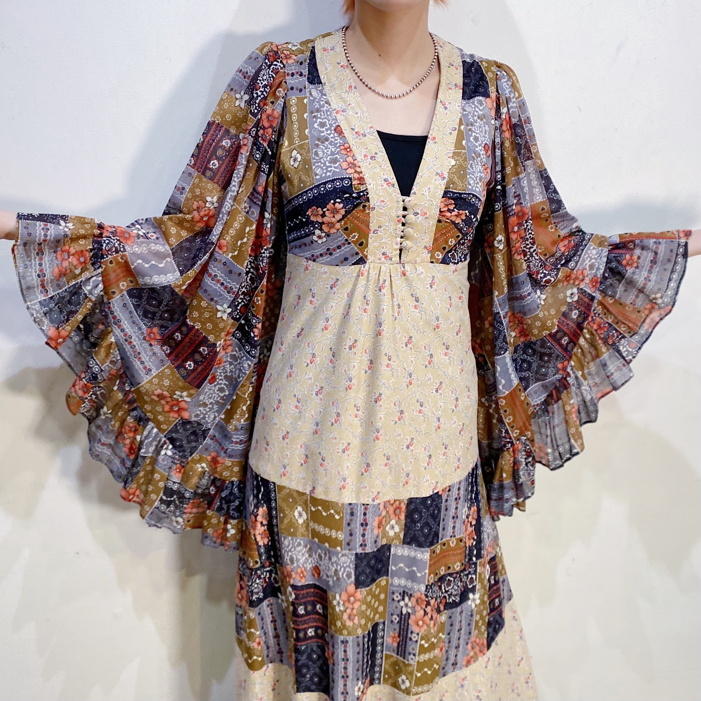 70sらしい綺麗なフレアスリーブとパッチワークプリントがとっても可愛い、ワンピースです。