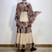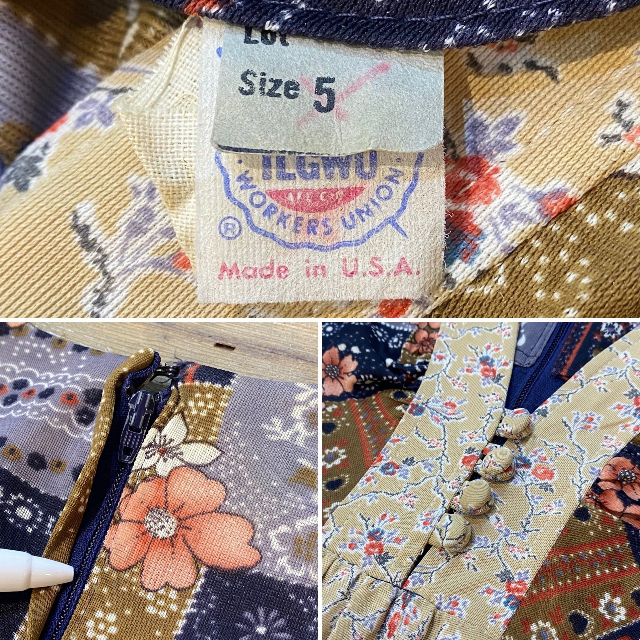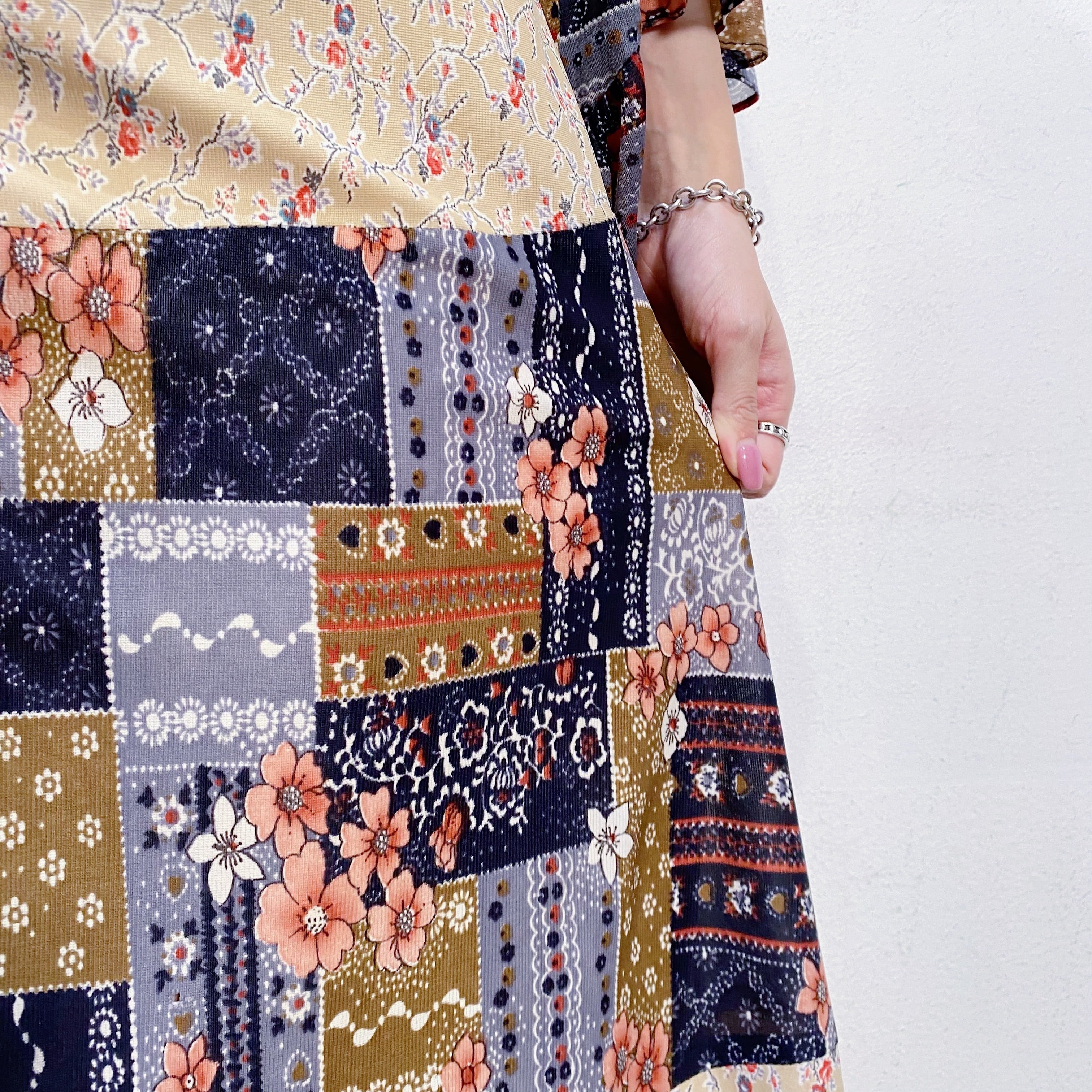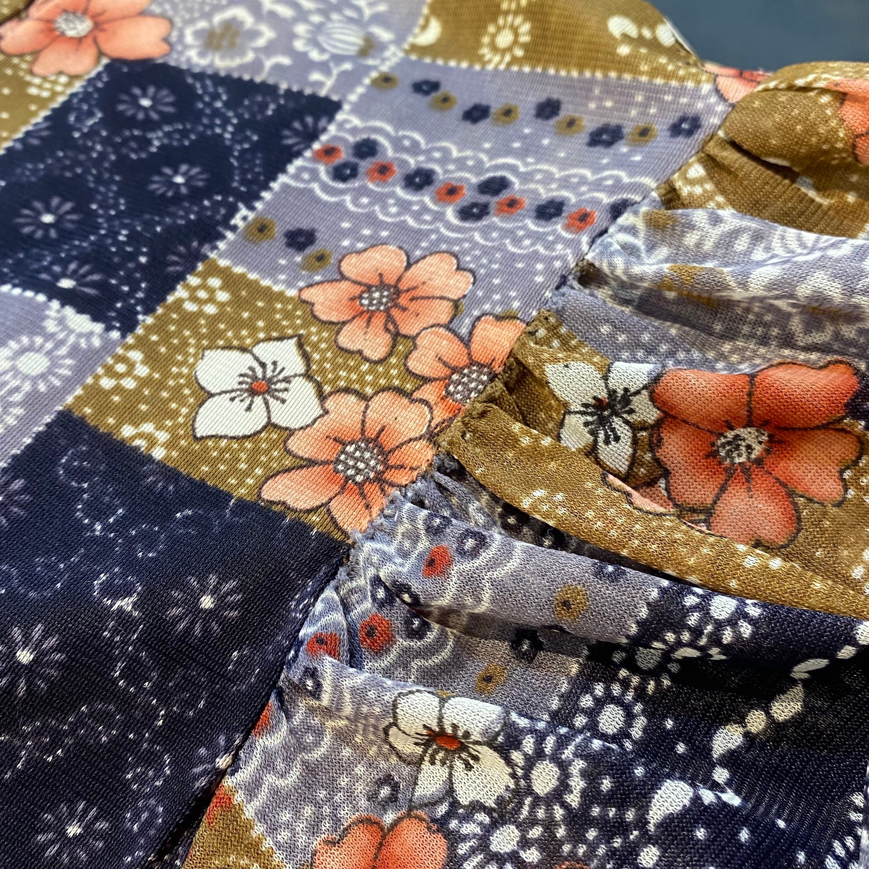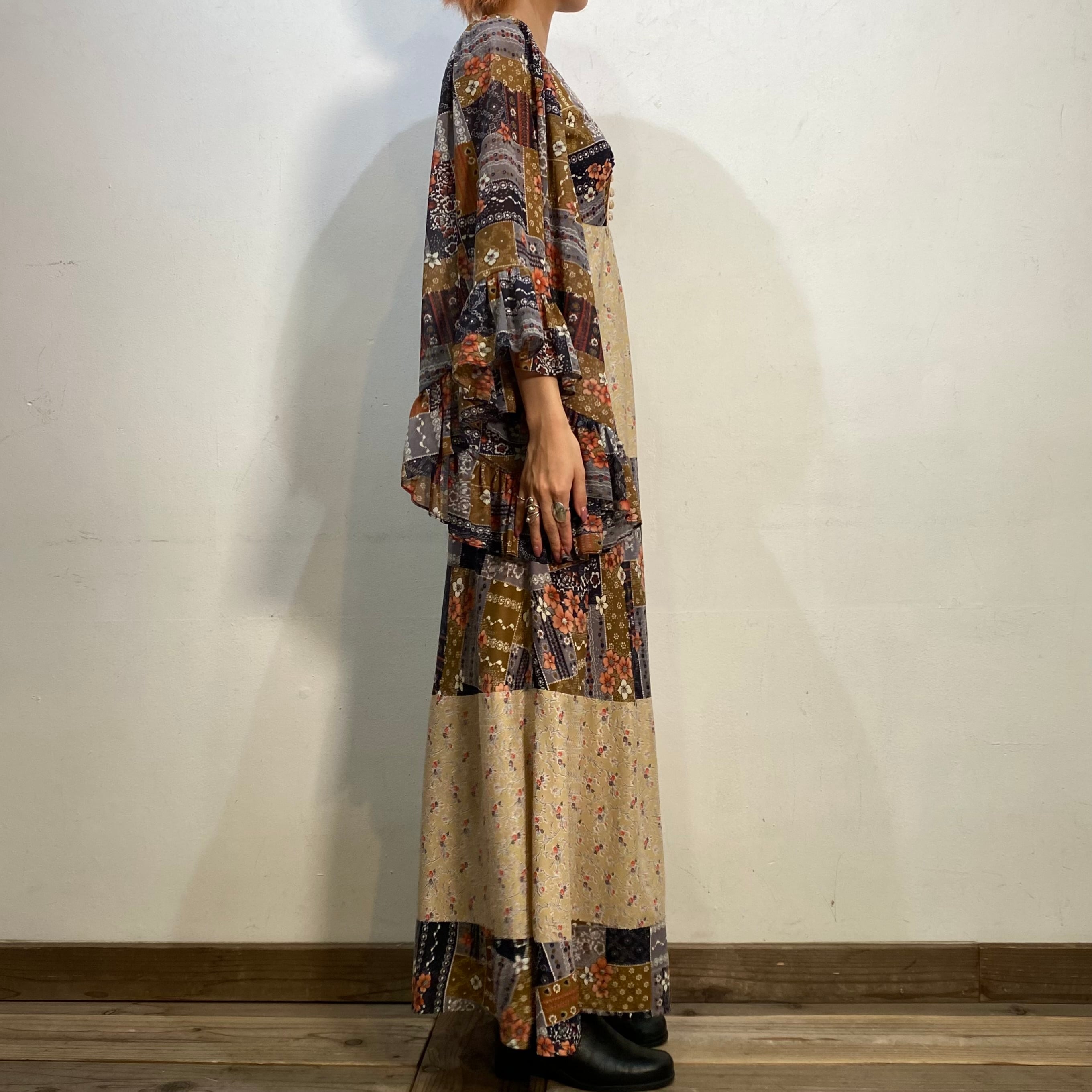 70sらしい綺麗なフレアスリーブとパッチワークプリントがとっても可愛い、ワンピースです。