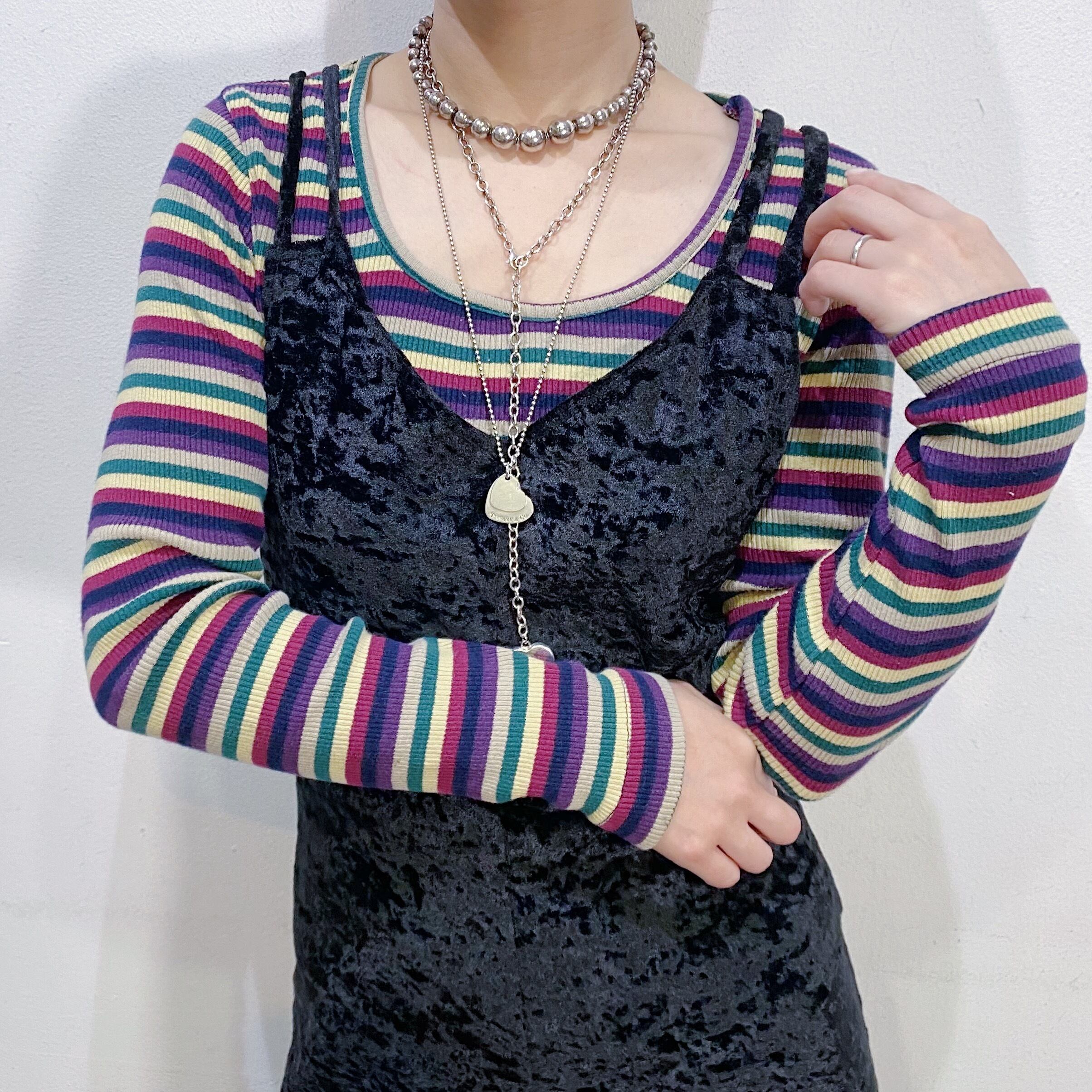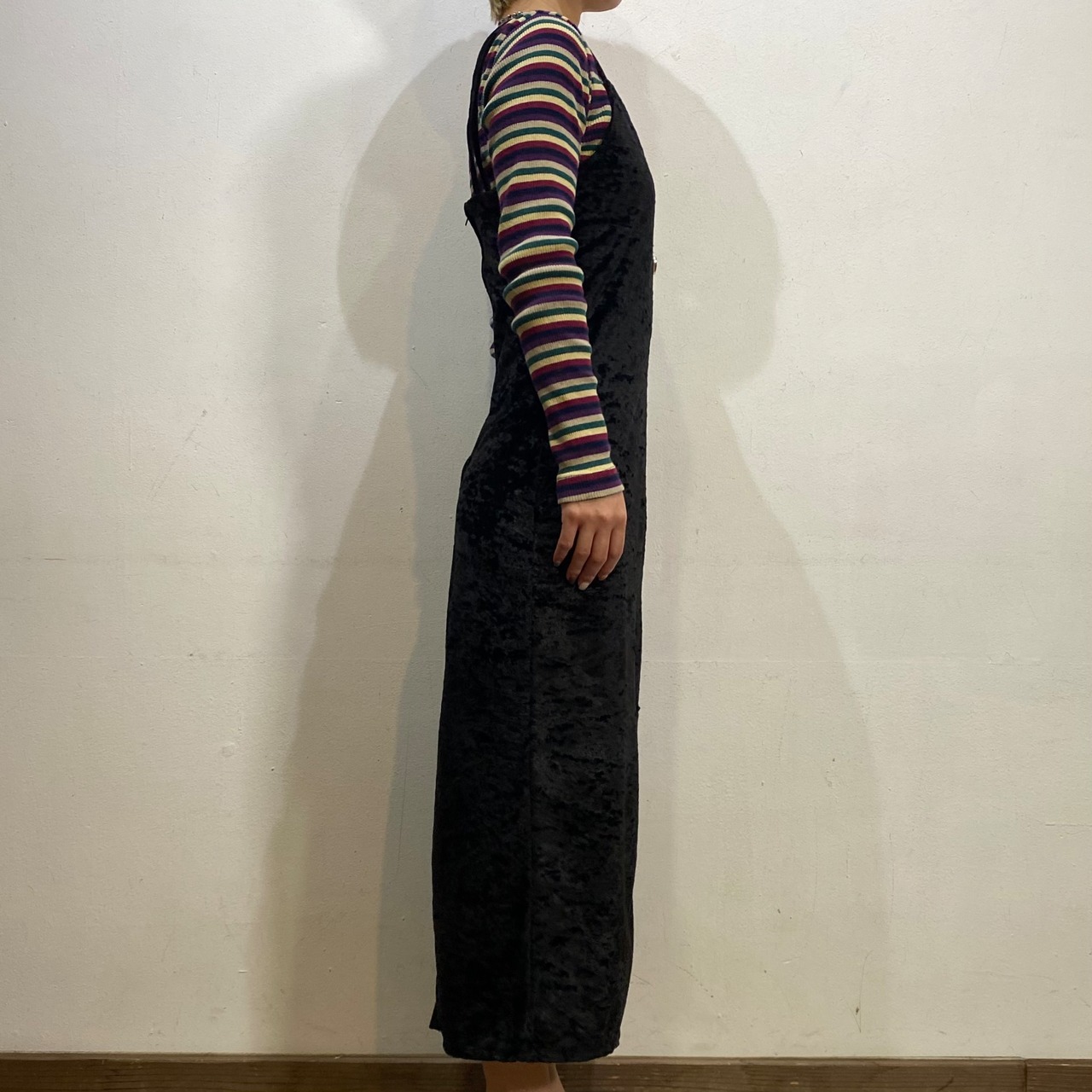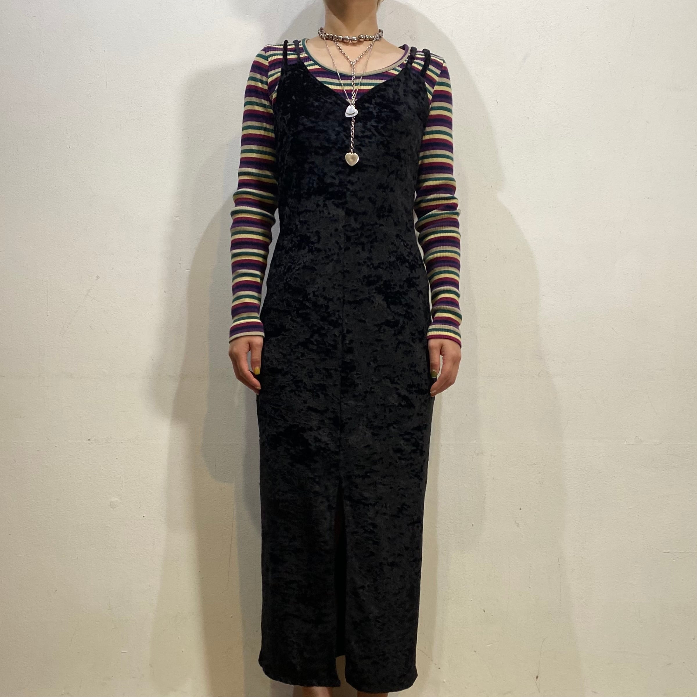 ブラックベースで大変使い勝手の良い、ベロア素材のキャミワンピースです。