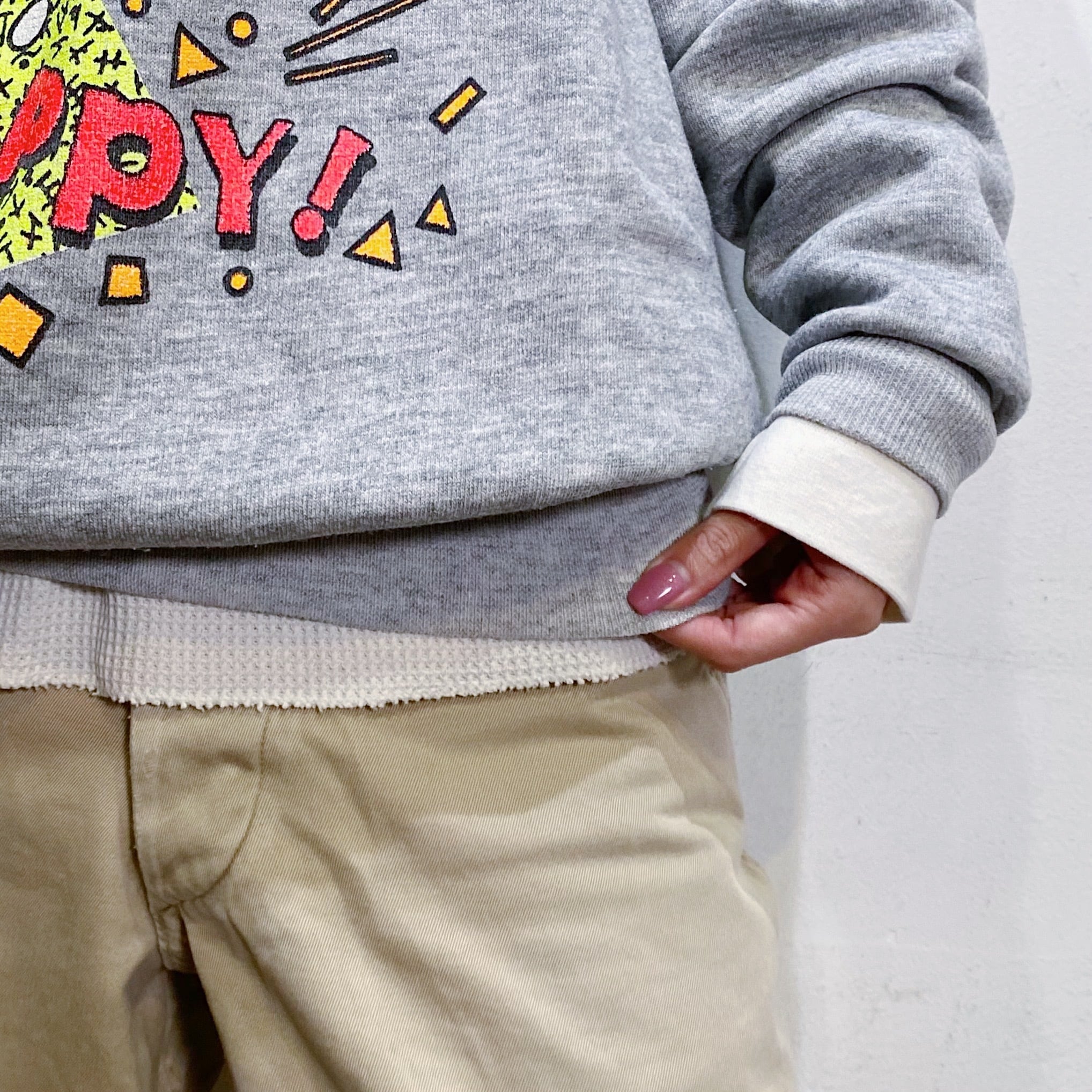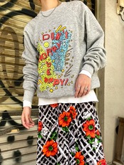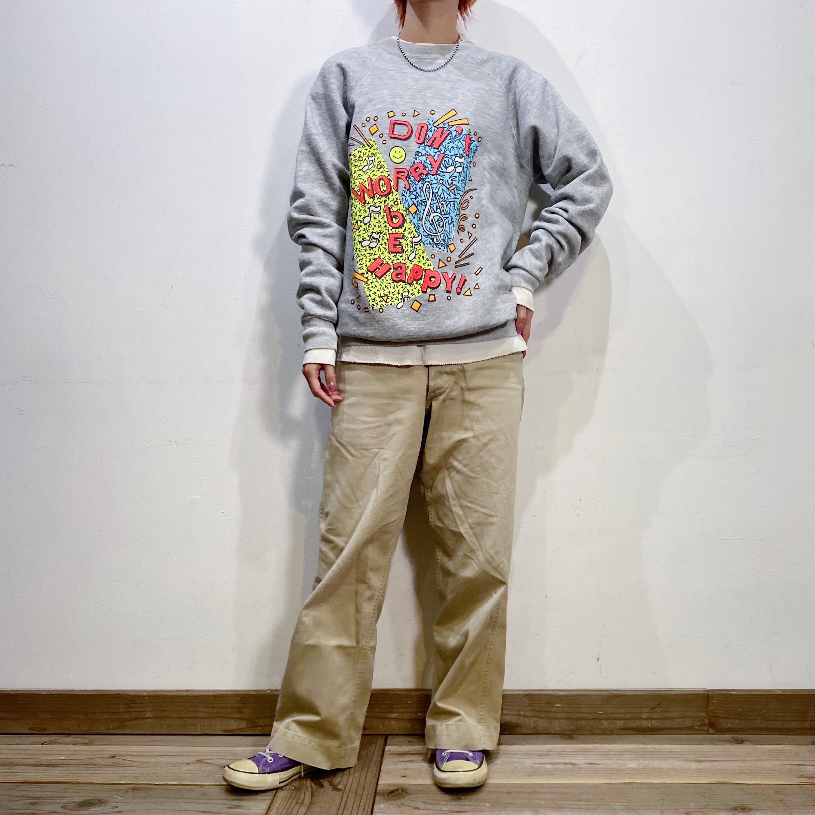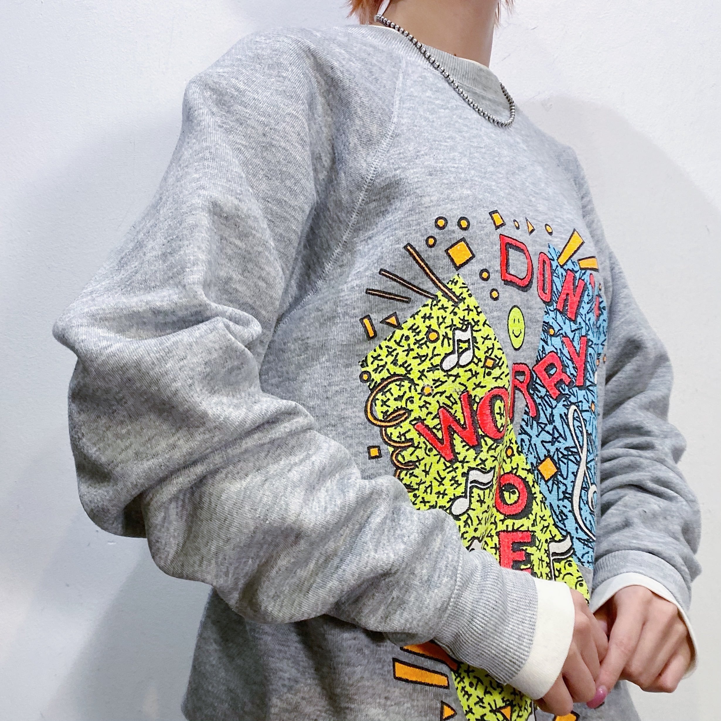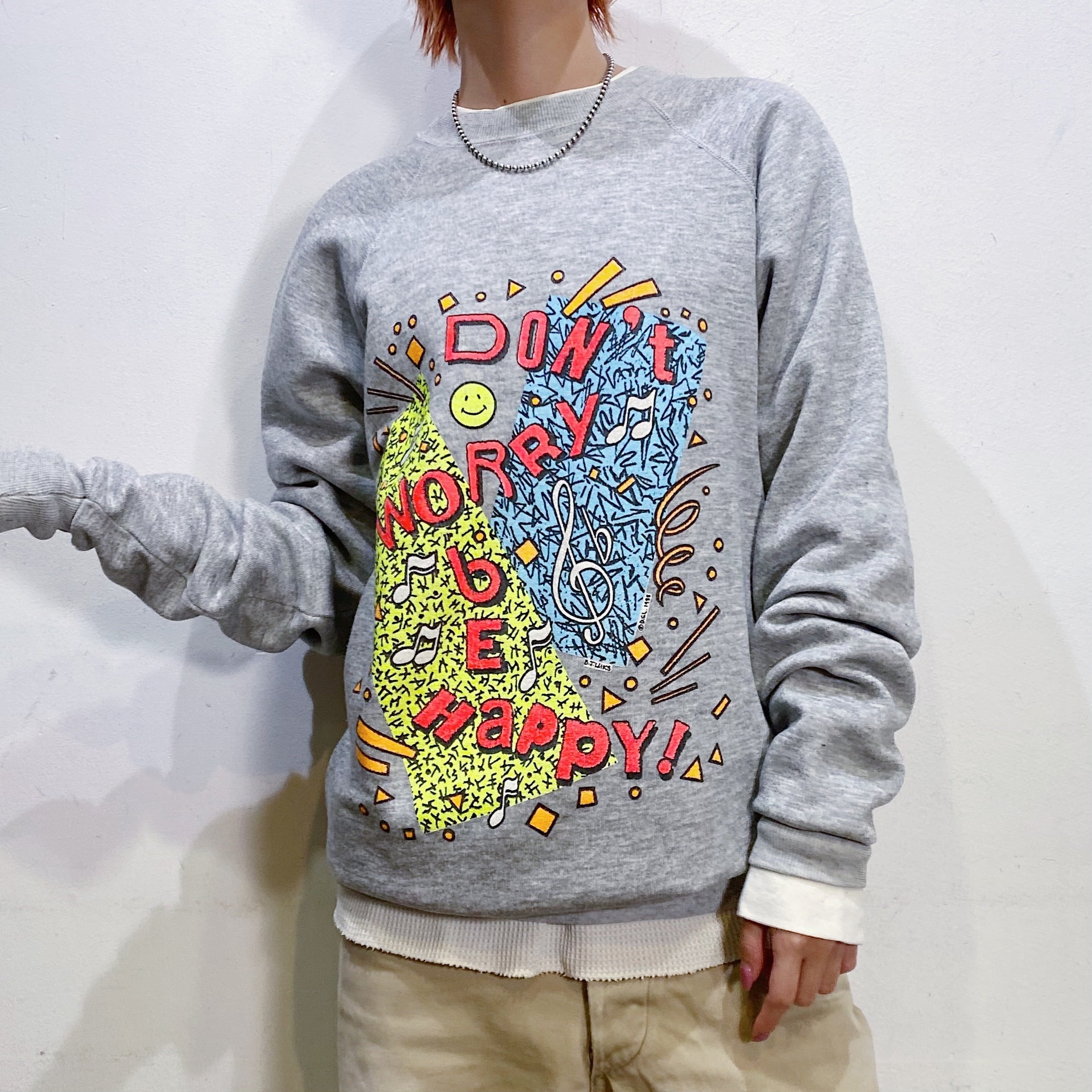 カラフルなプリントと“Don’t worry Be happy”のメッセージが可愛い、80年代のスウェットです。
