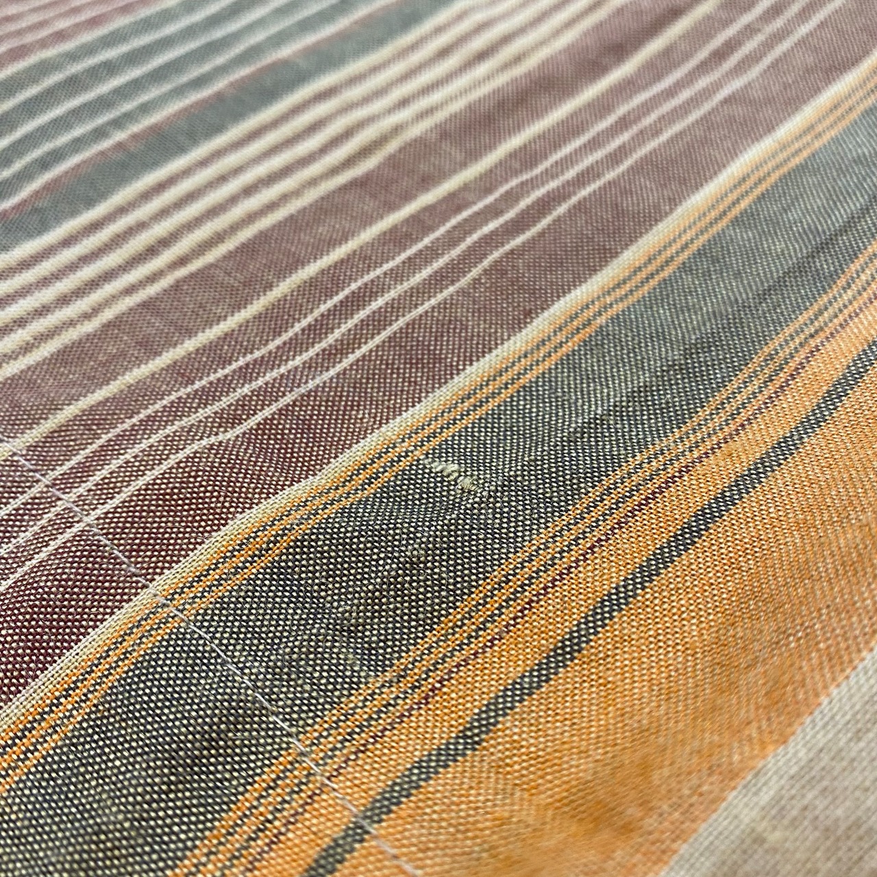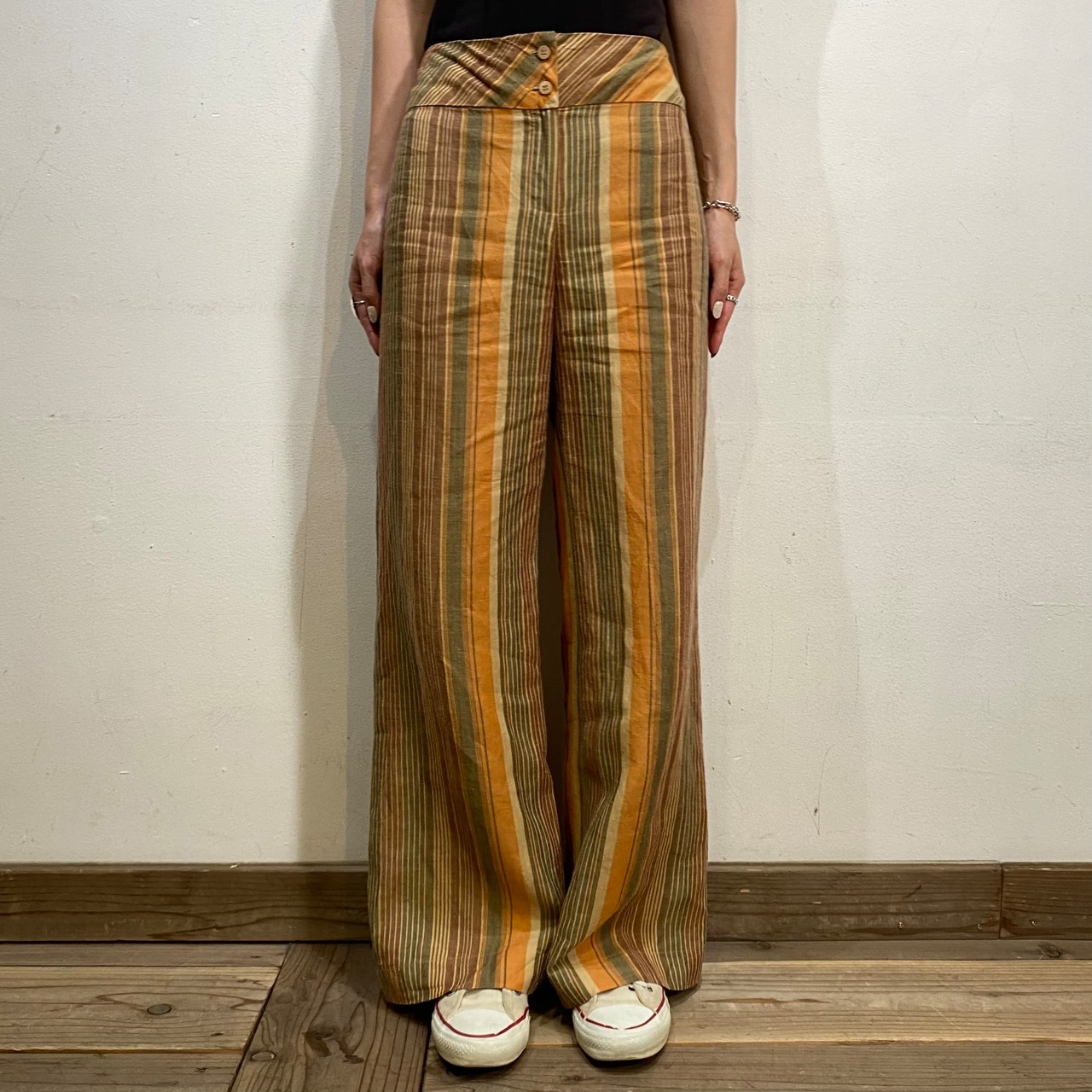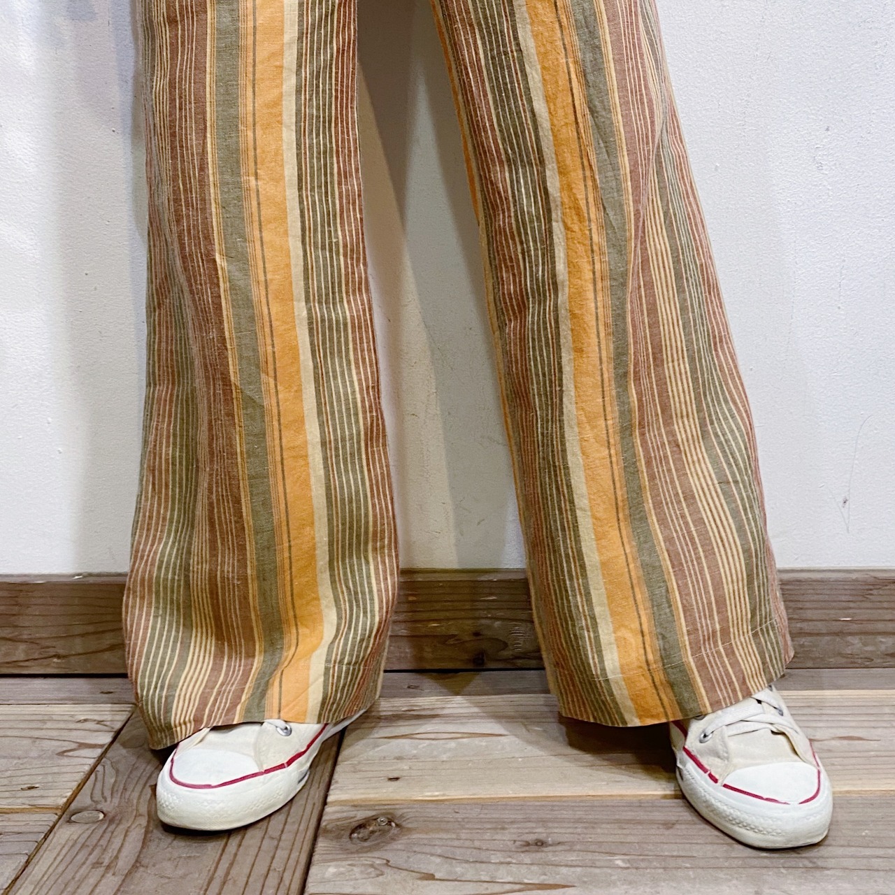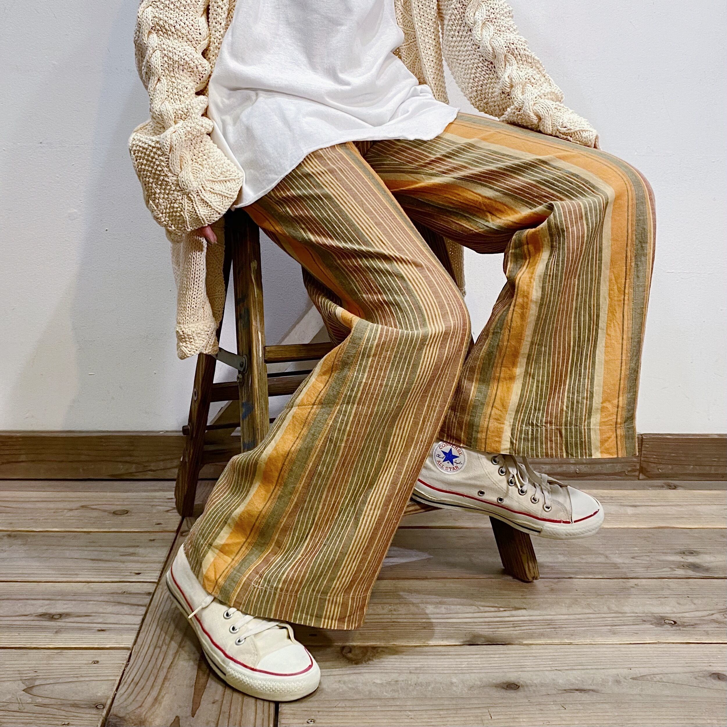 オレンジやグリーン、ブラウンなどの色合わせが可愛い、ストライプのパンツです。