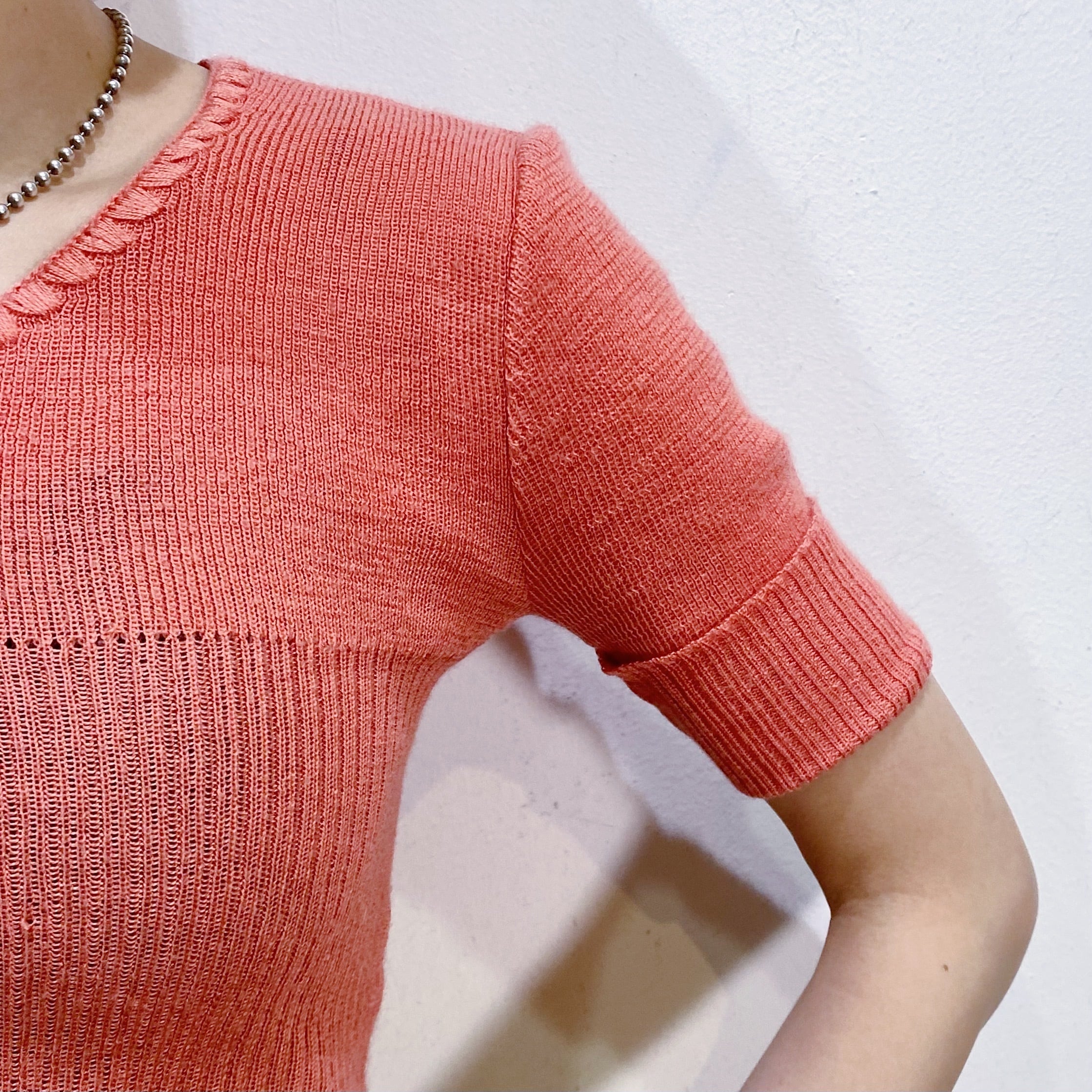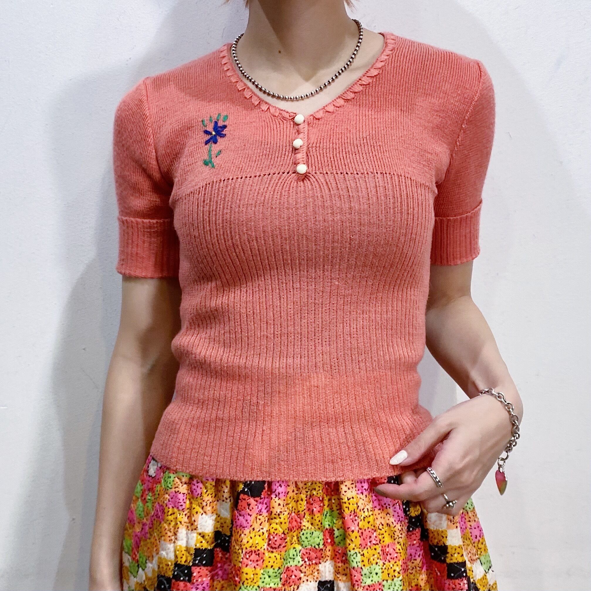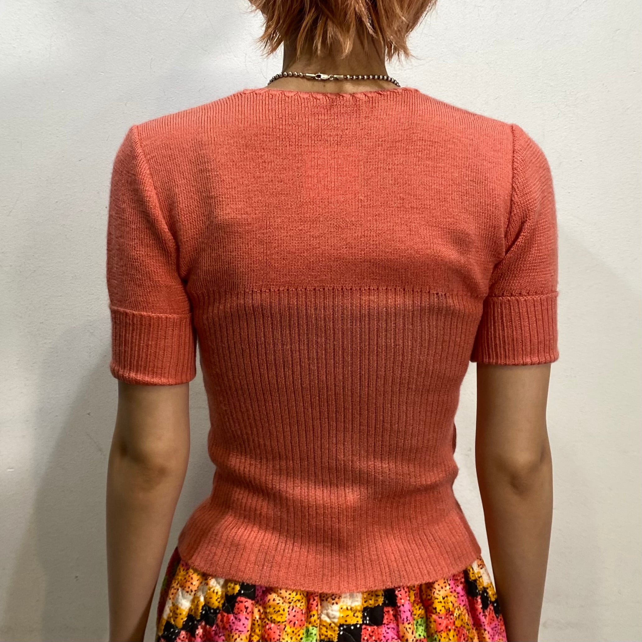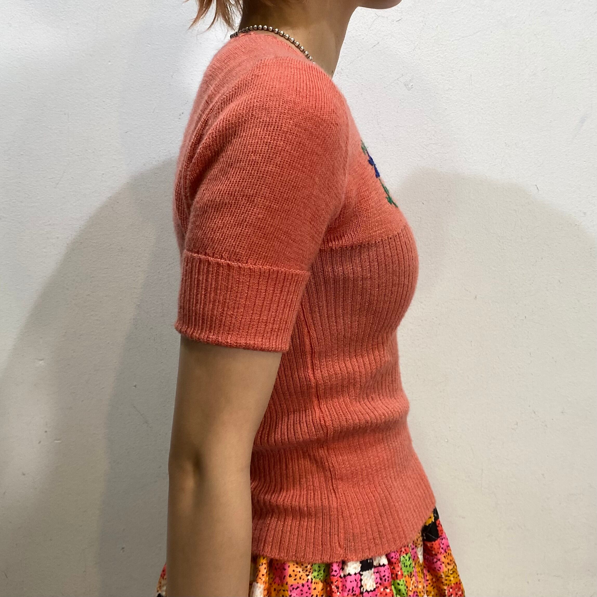 サーモンピンクの色合いが可愛い、70年代の半袖ニットです。
