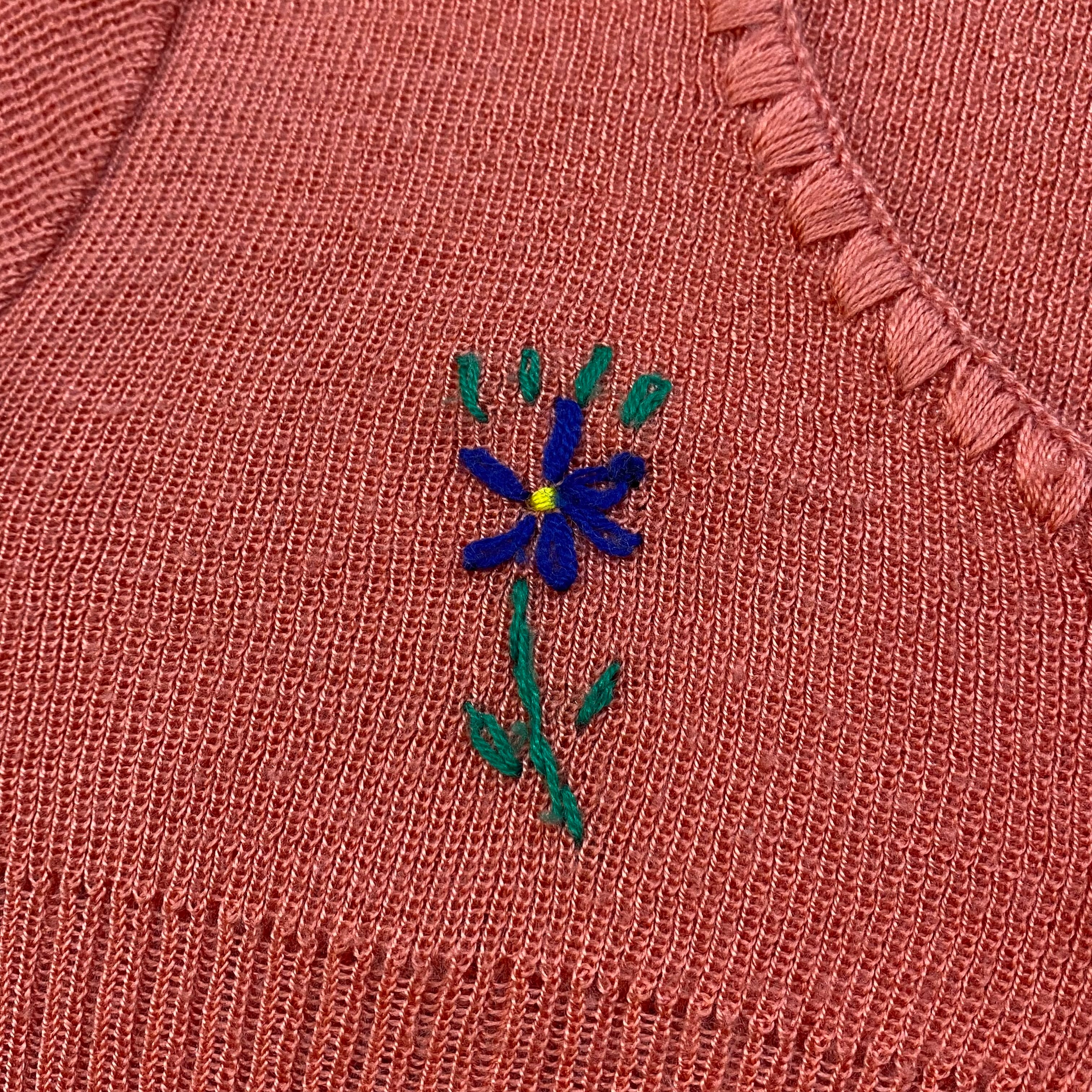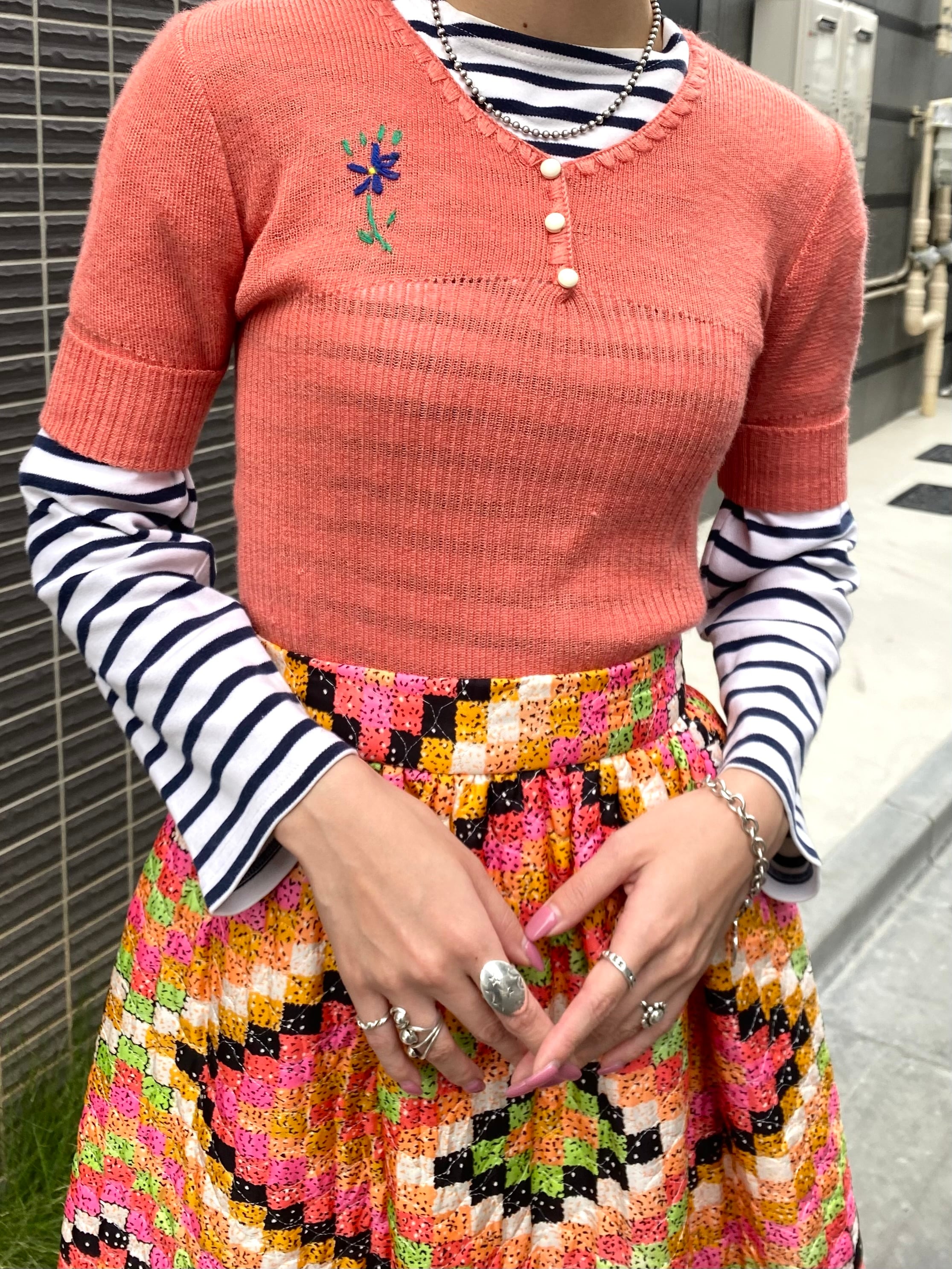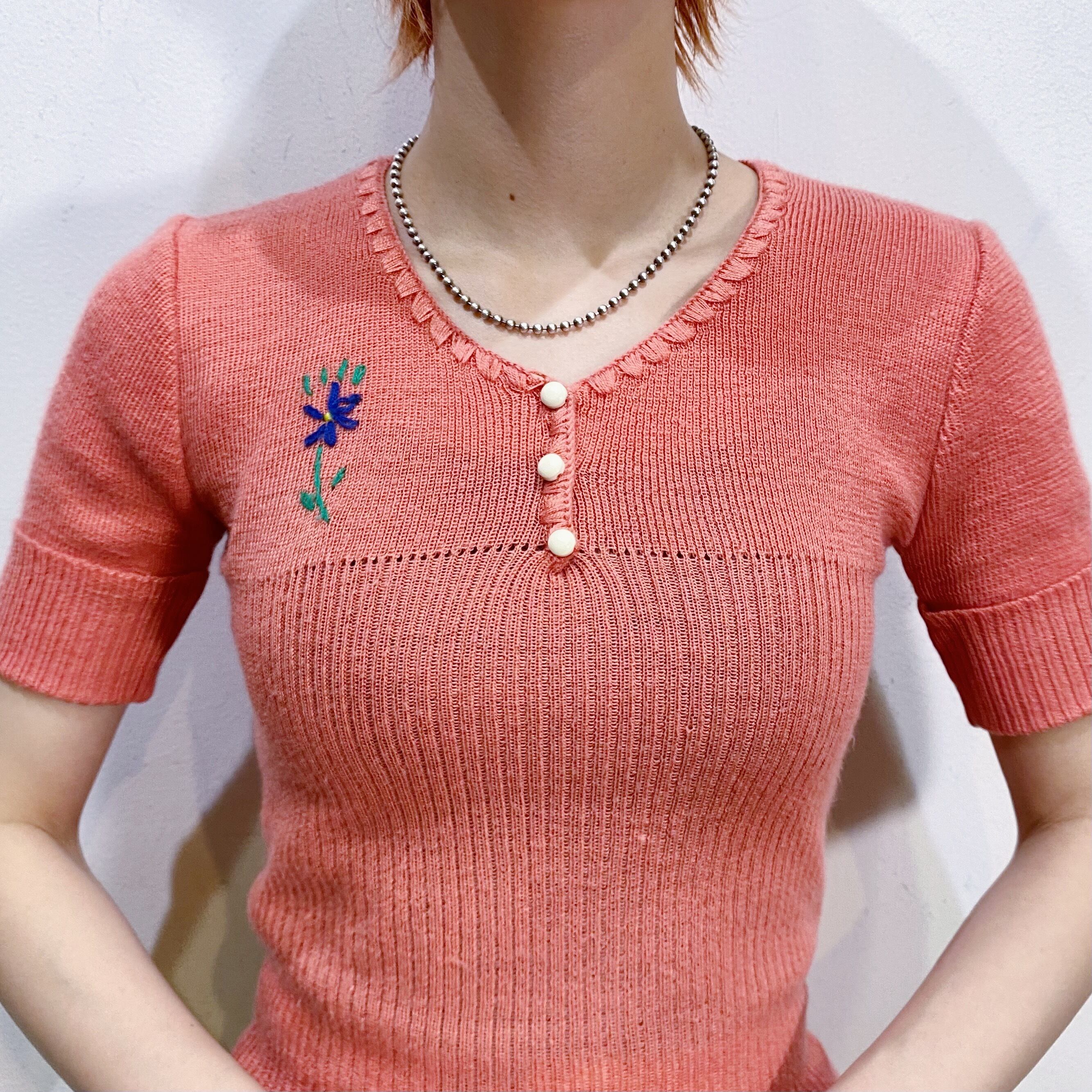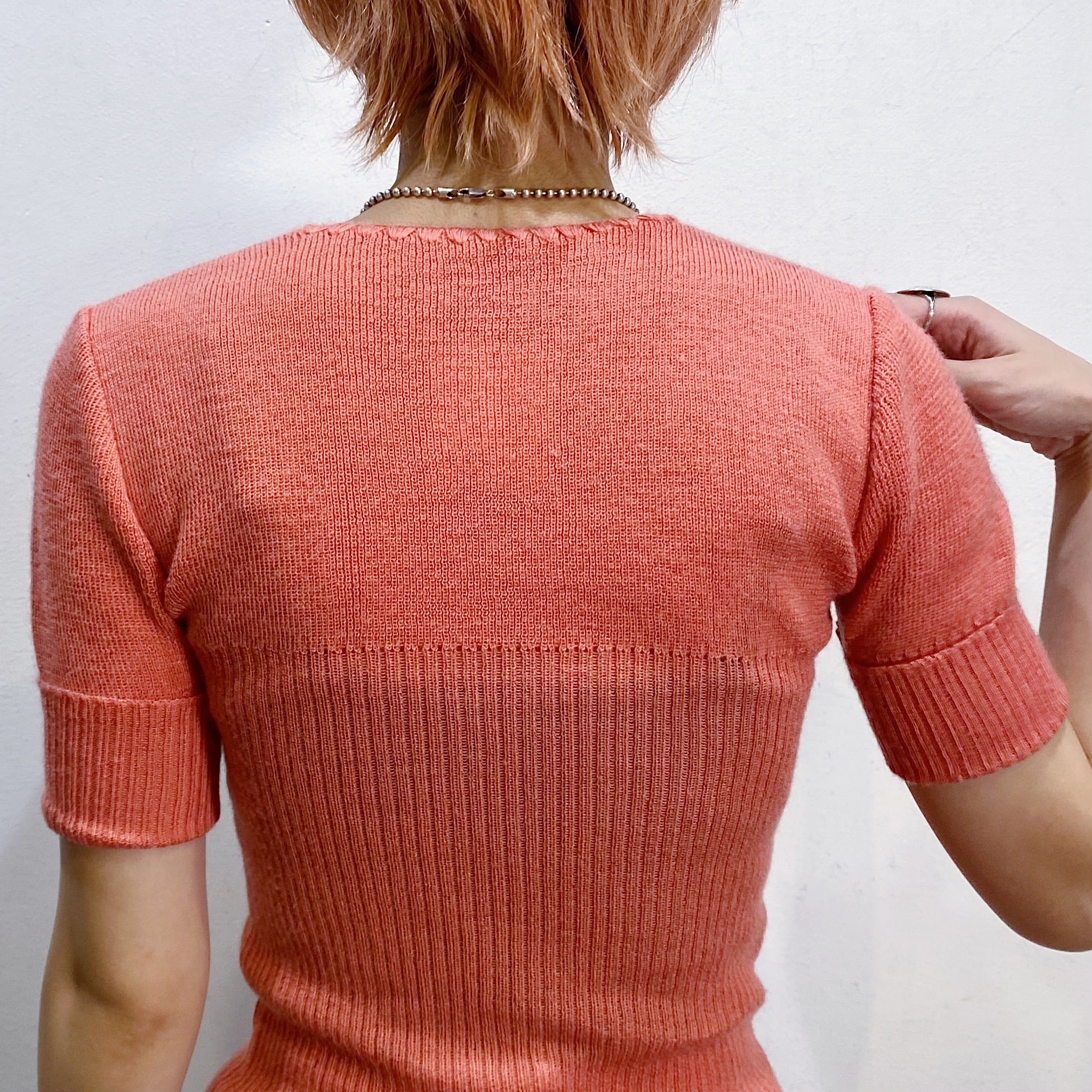 サーモンピンクの色合いが可愛い、70年代の半袖ニットです。