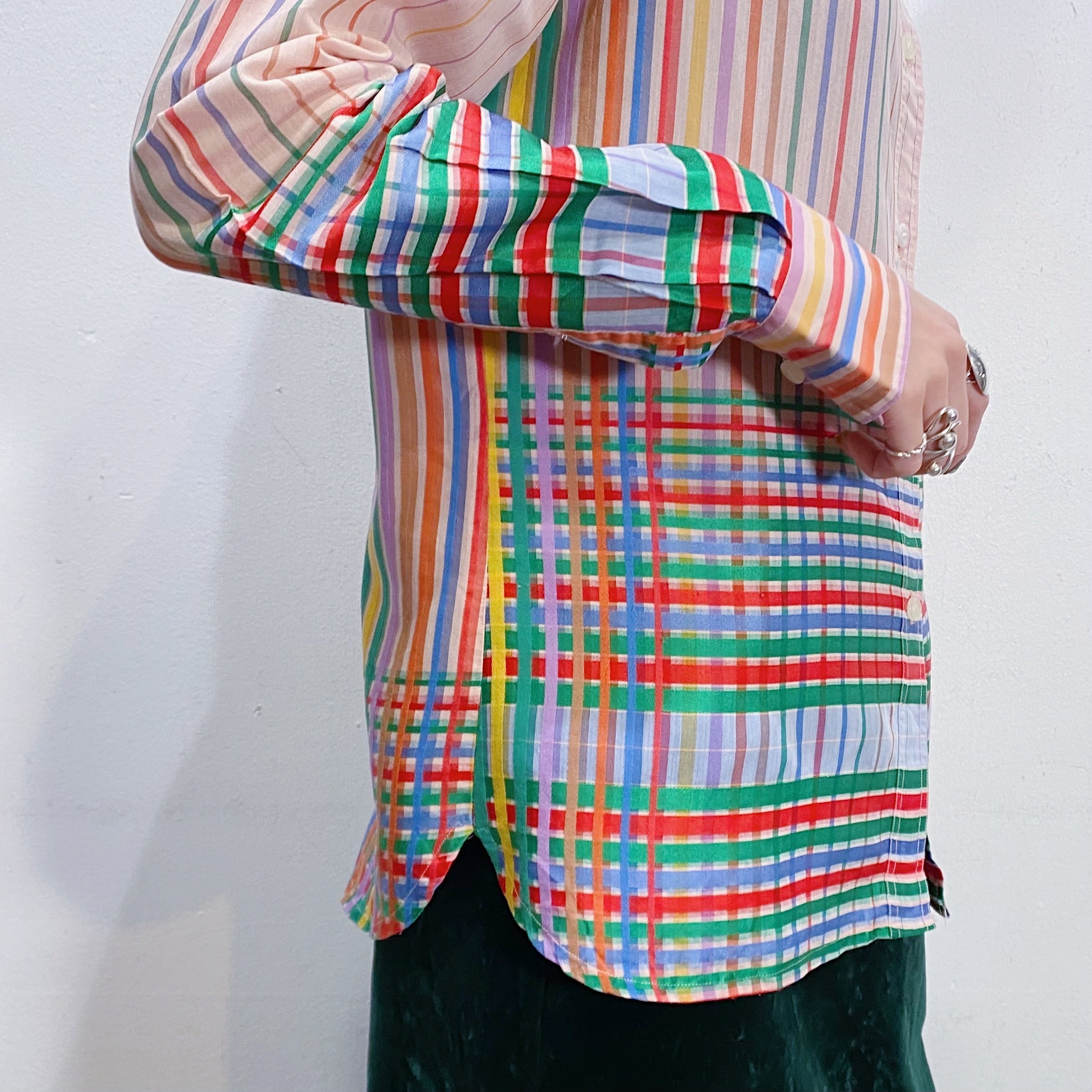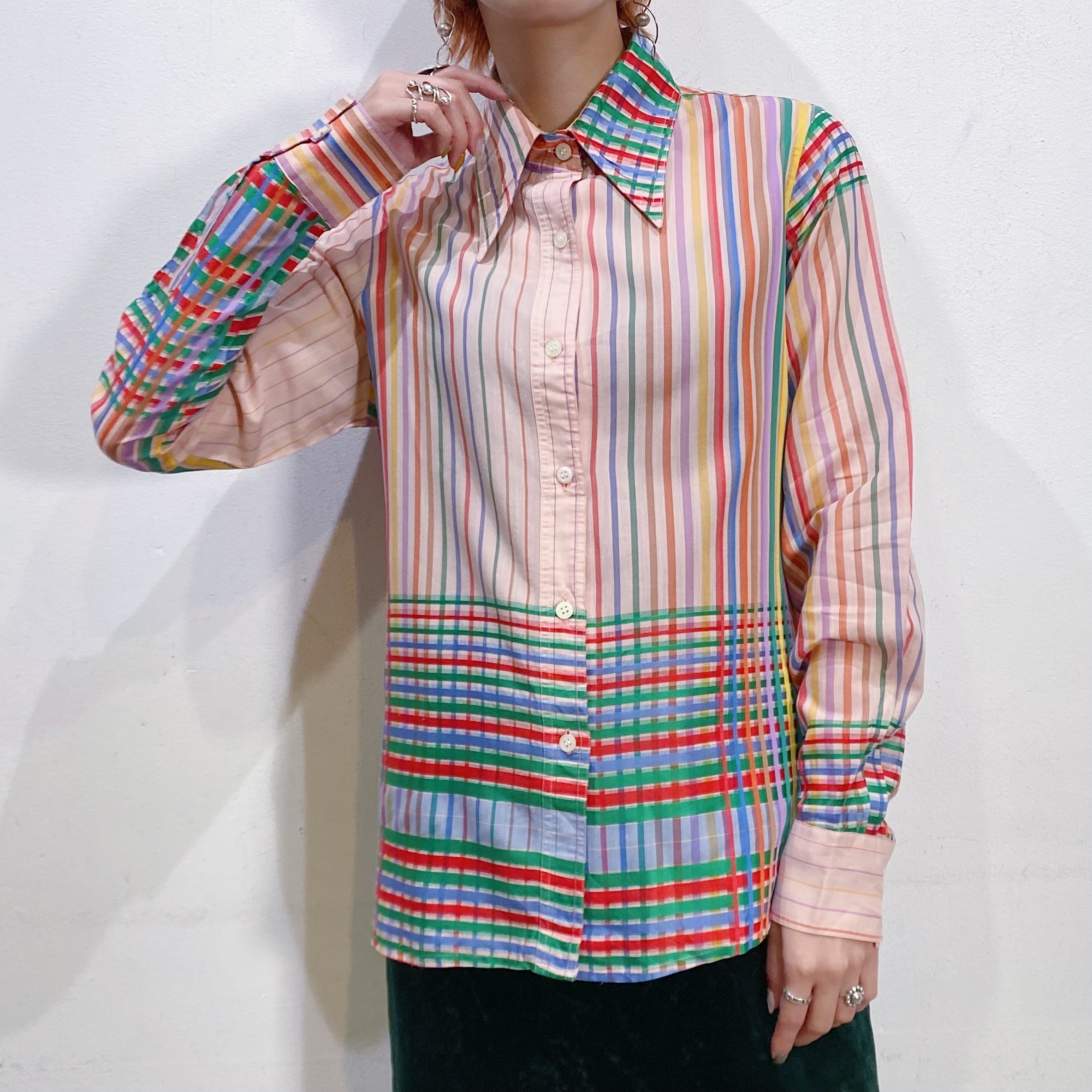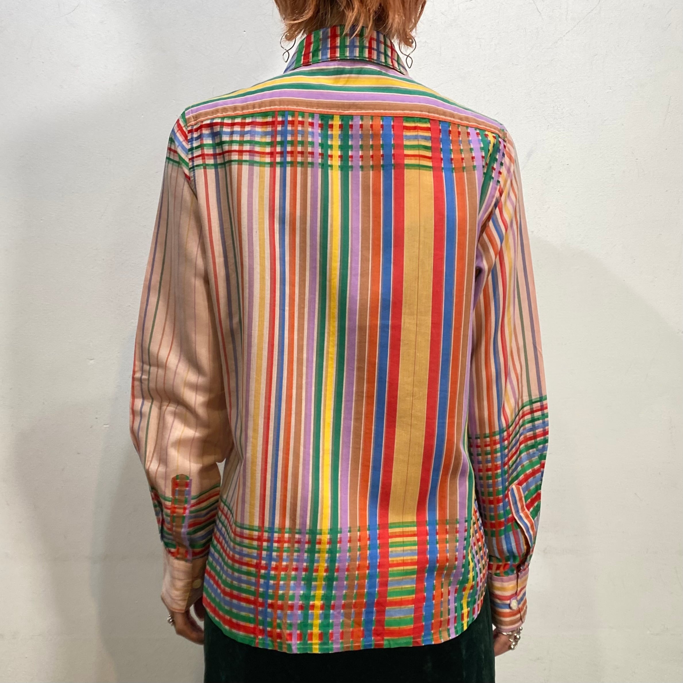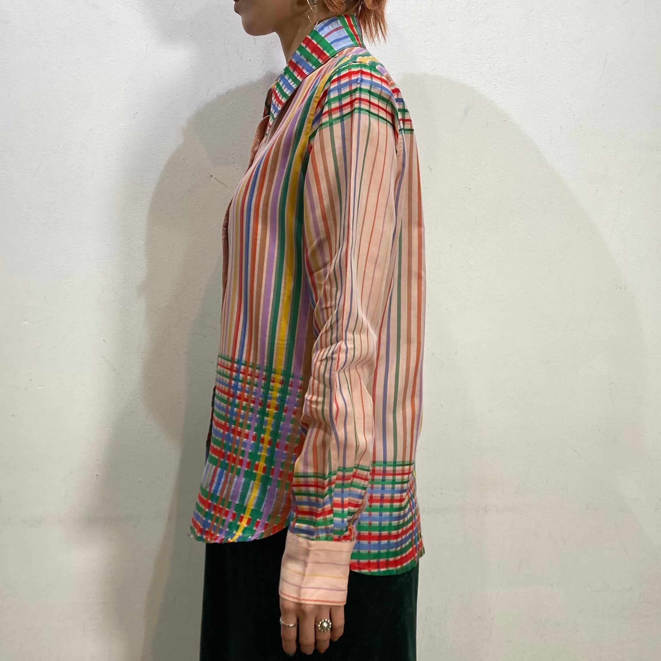 カラフルなレインボーストライプ×チェック柄がとっても可愛い、70年代の長袖シャツです。