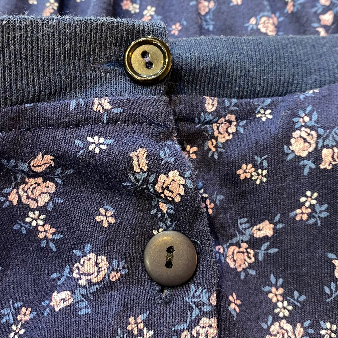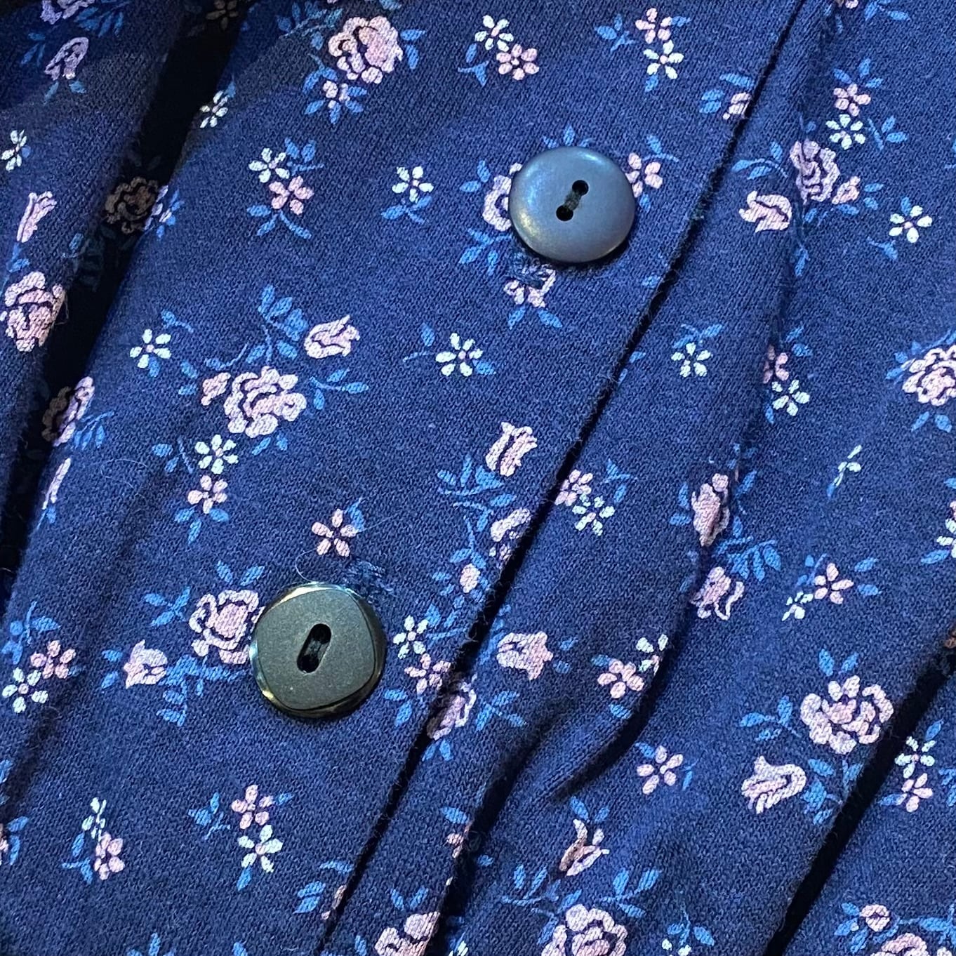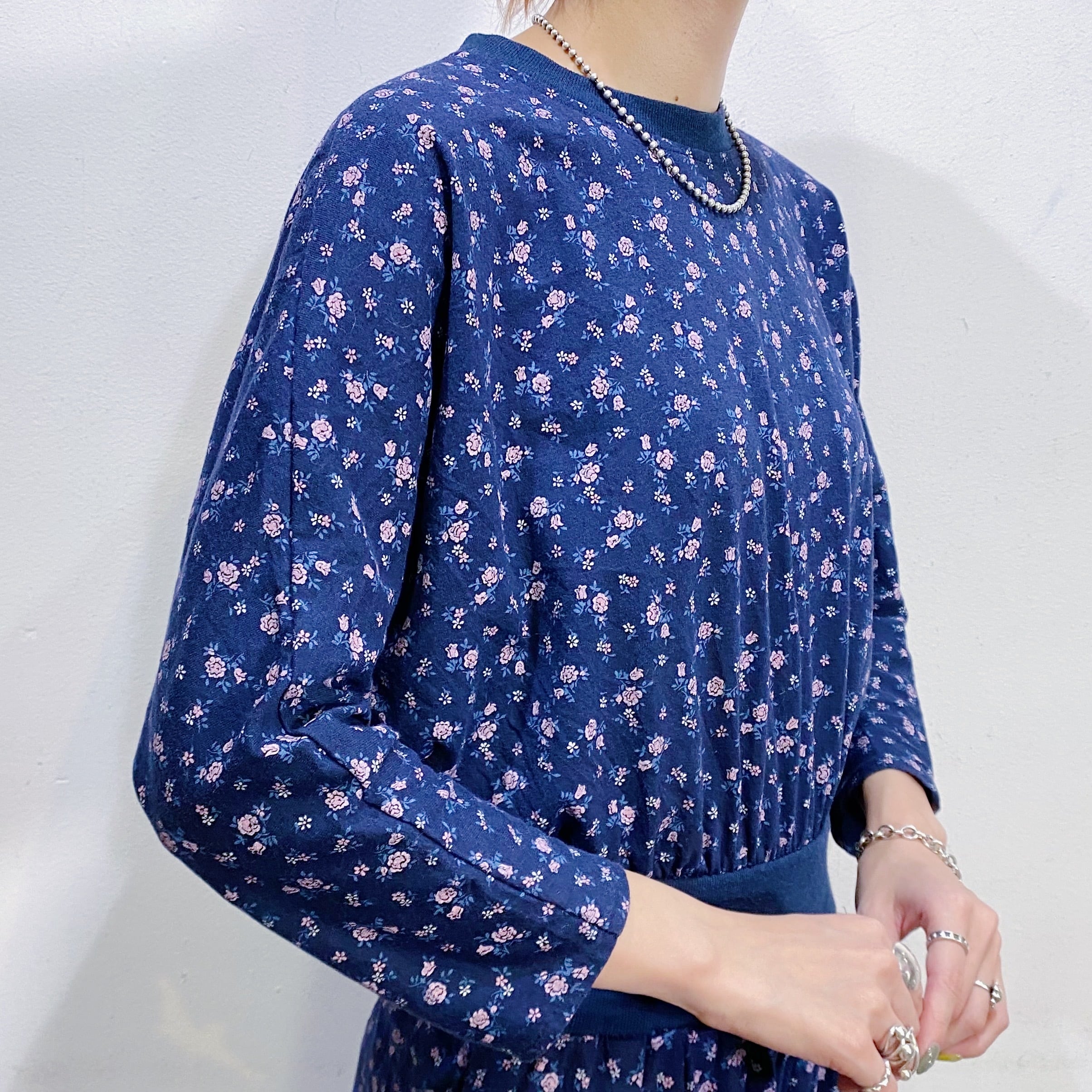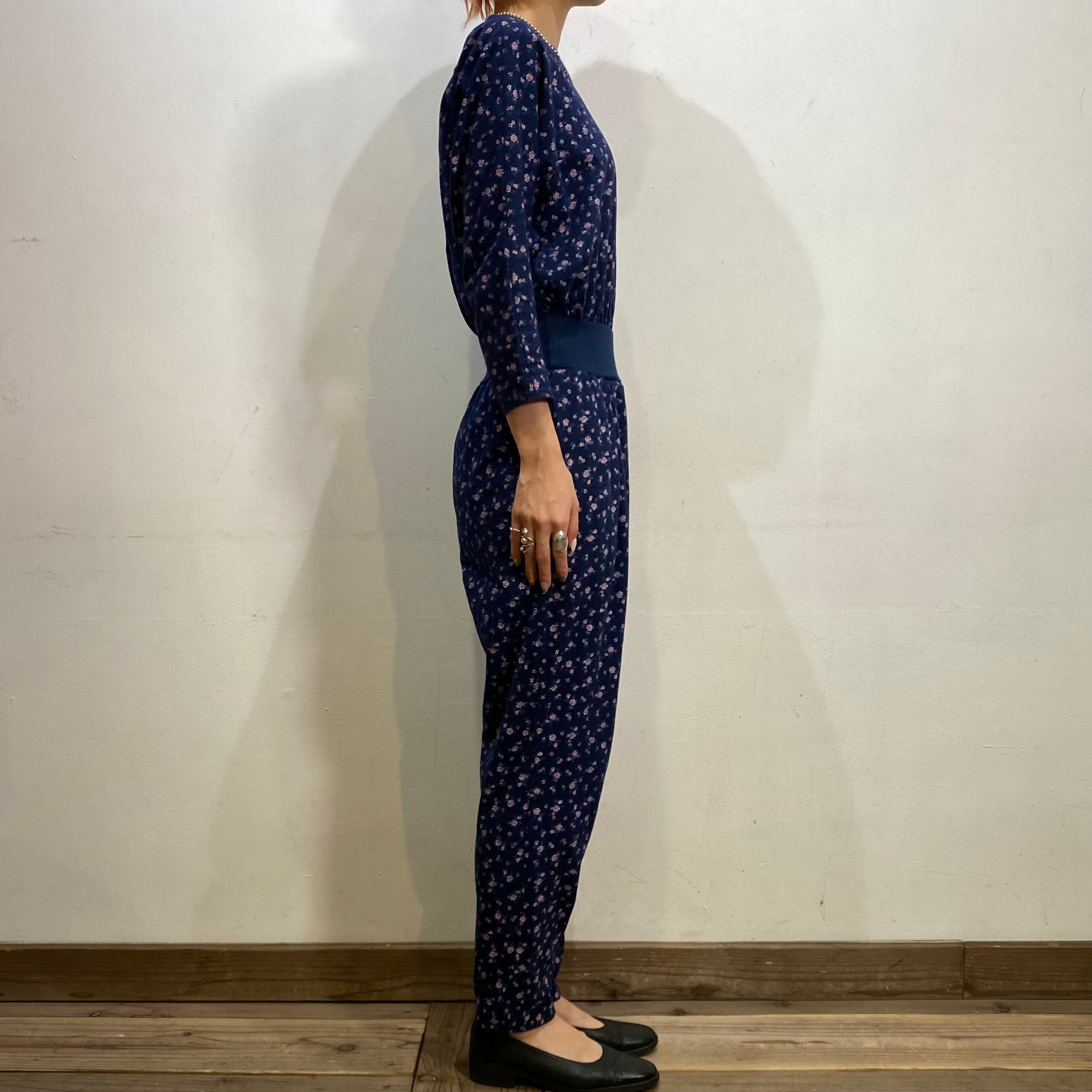 ネイビーベースにピンクの小花柄が可愛い、80年代のジャンプスーツです。
