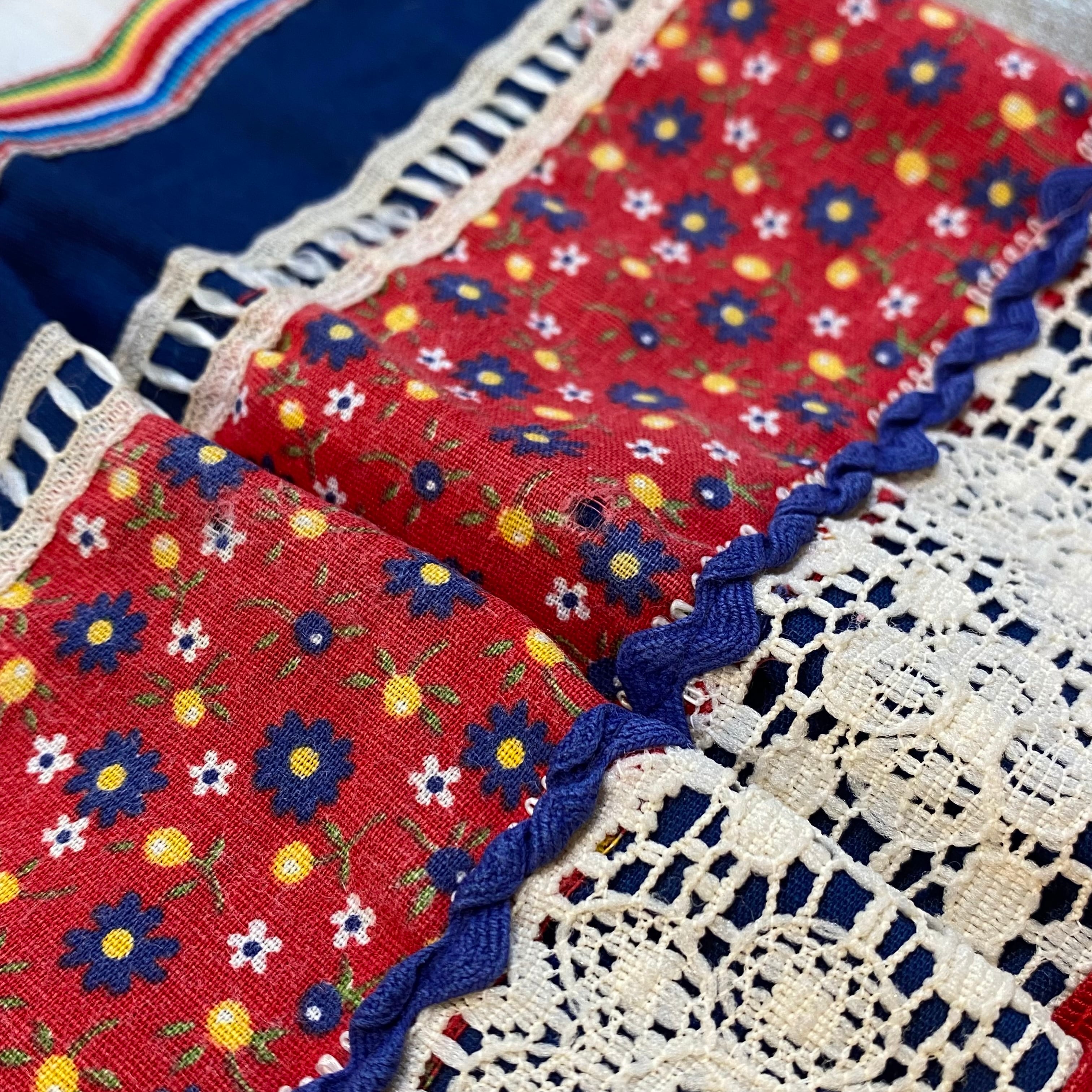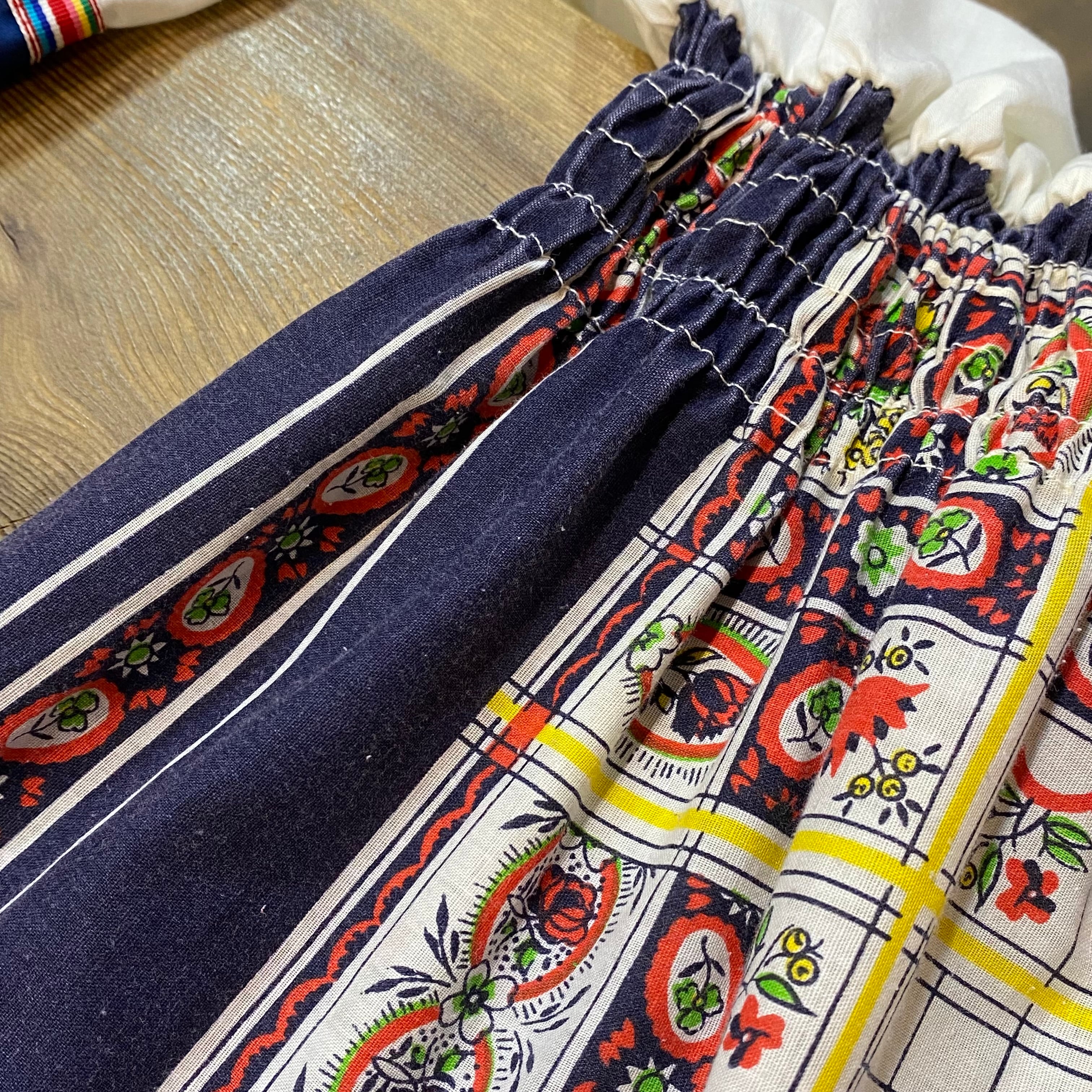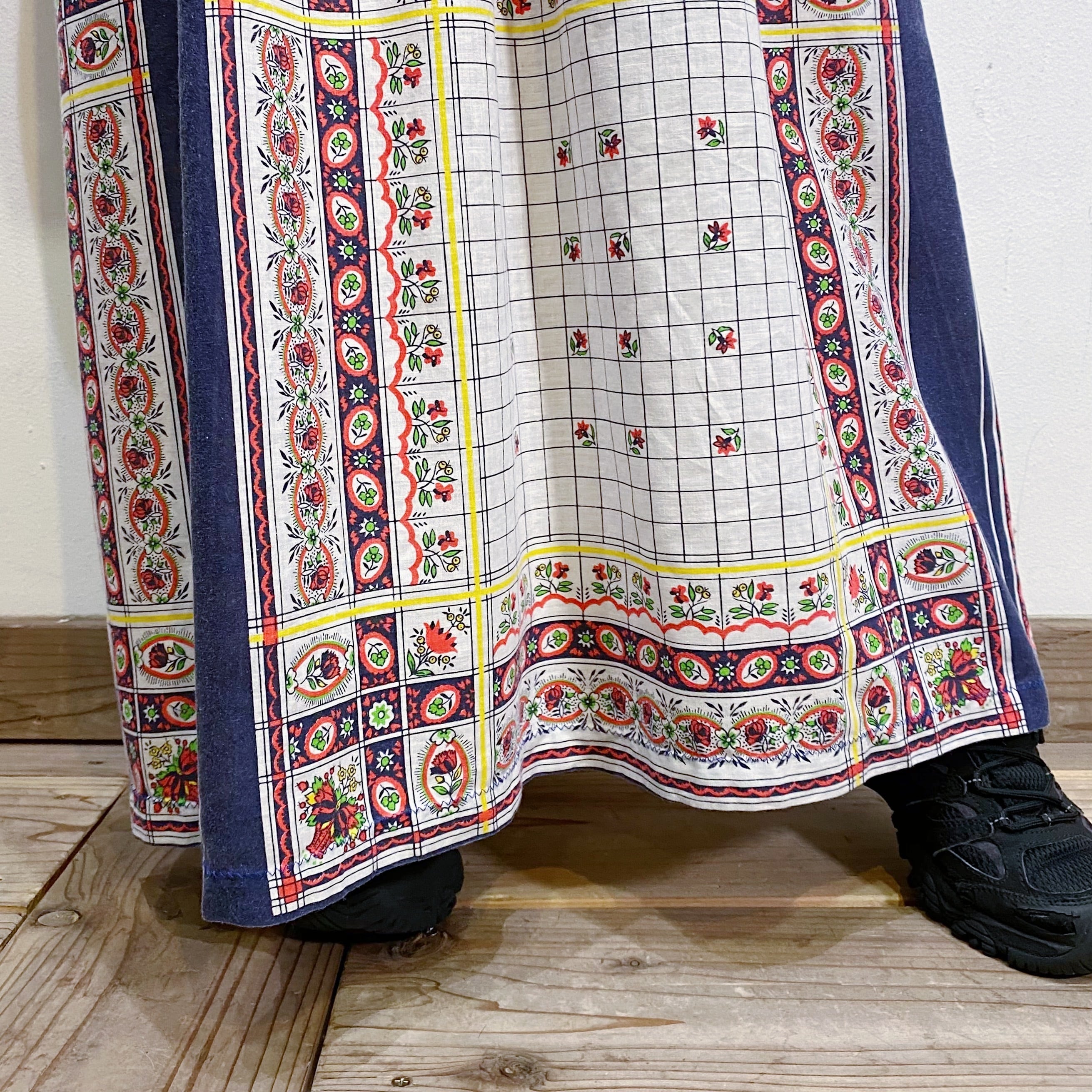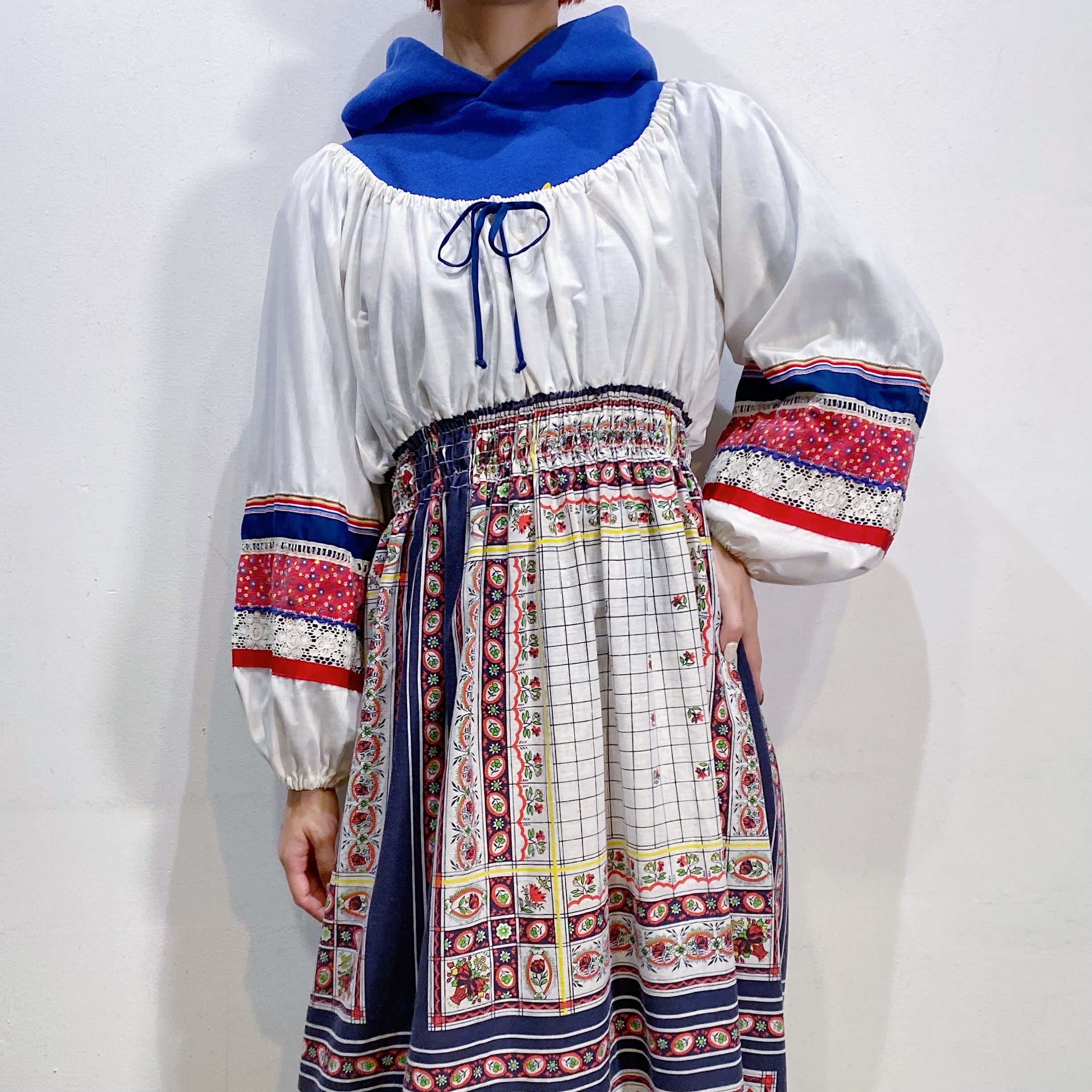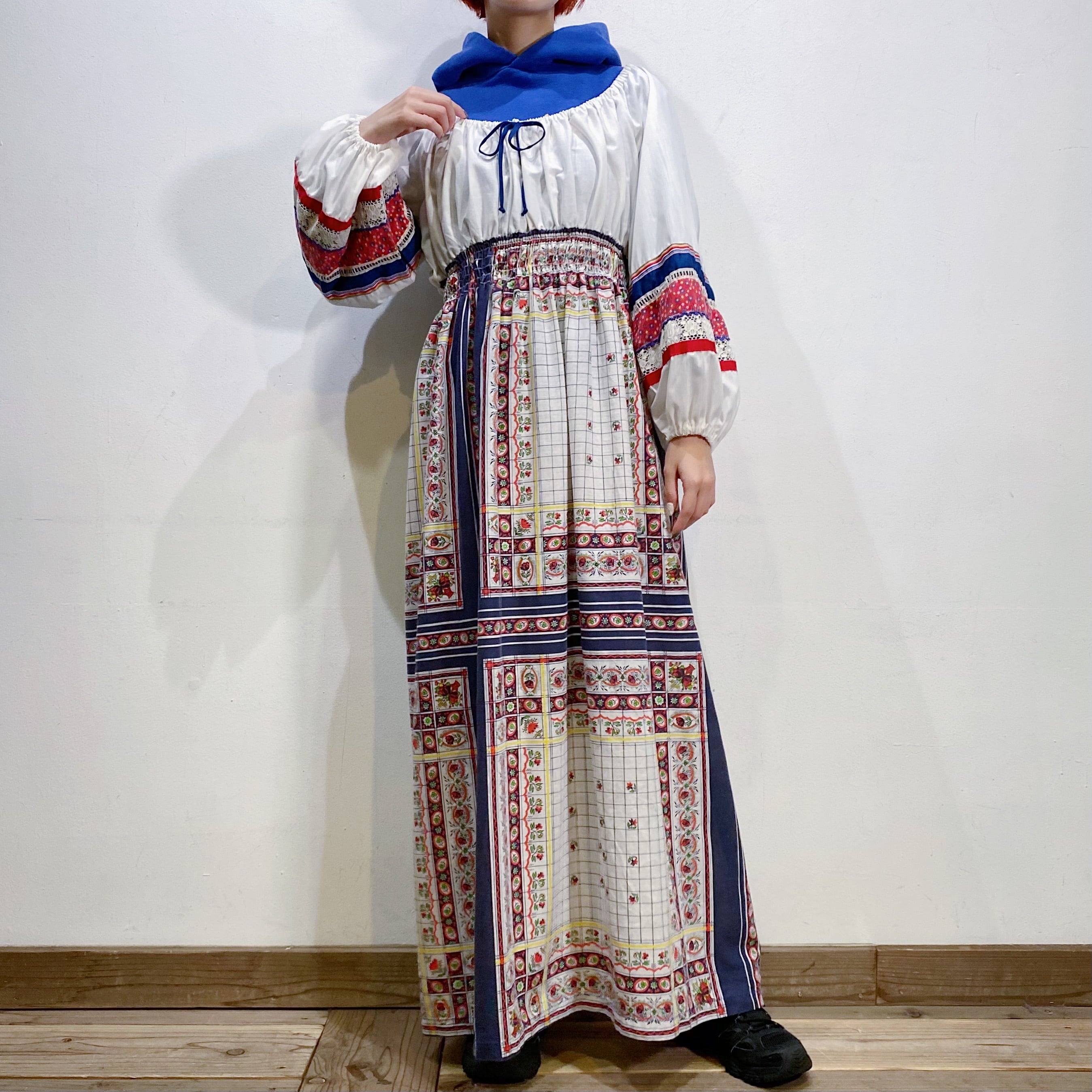 パッチワークプリントのようなテキスタイルが可愛い、70年代のワンピースです。
