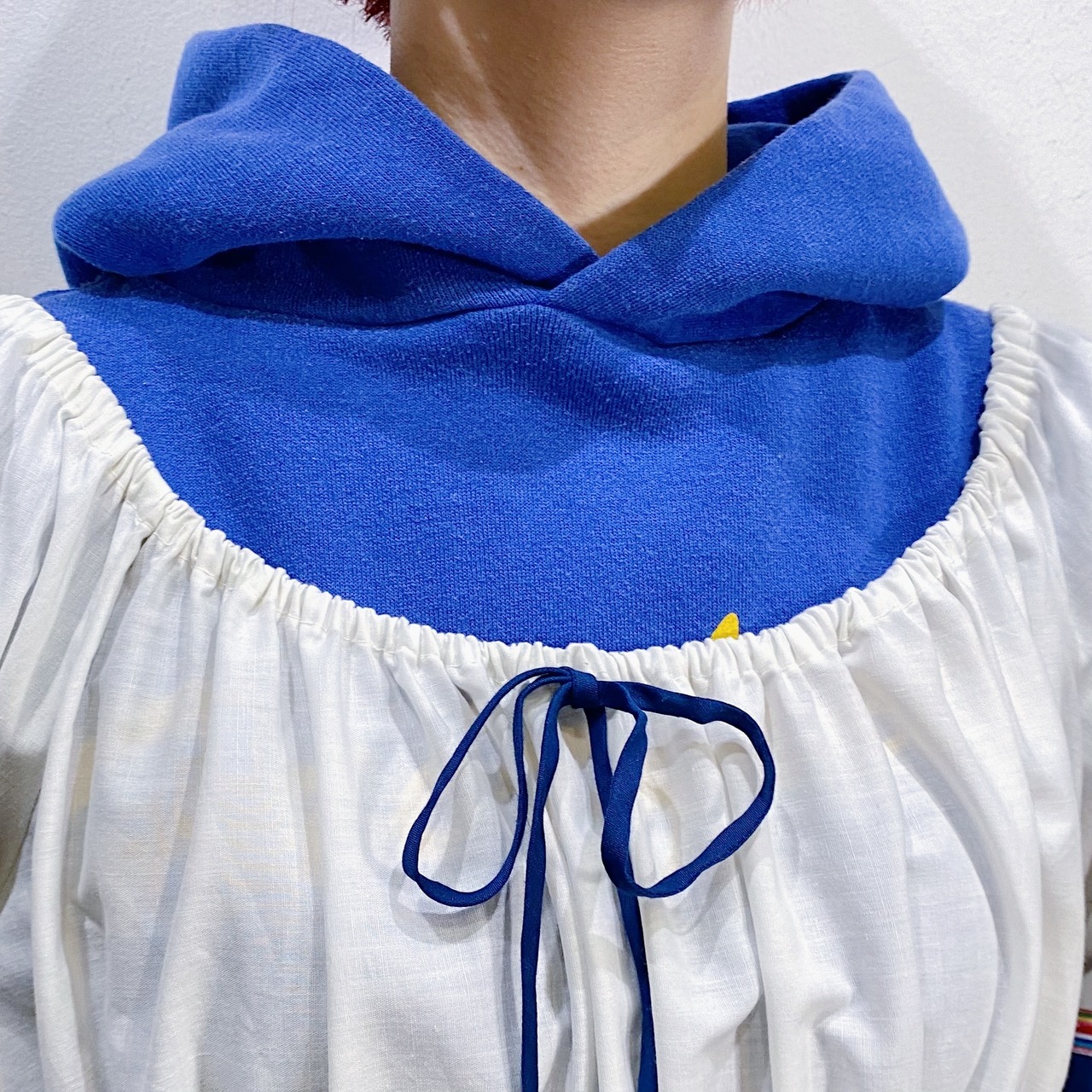 着用写真のようにインナーにフーディーやハイネックなどをレイヤードしても、また違った印象で楽しめます。