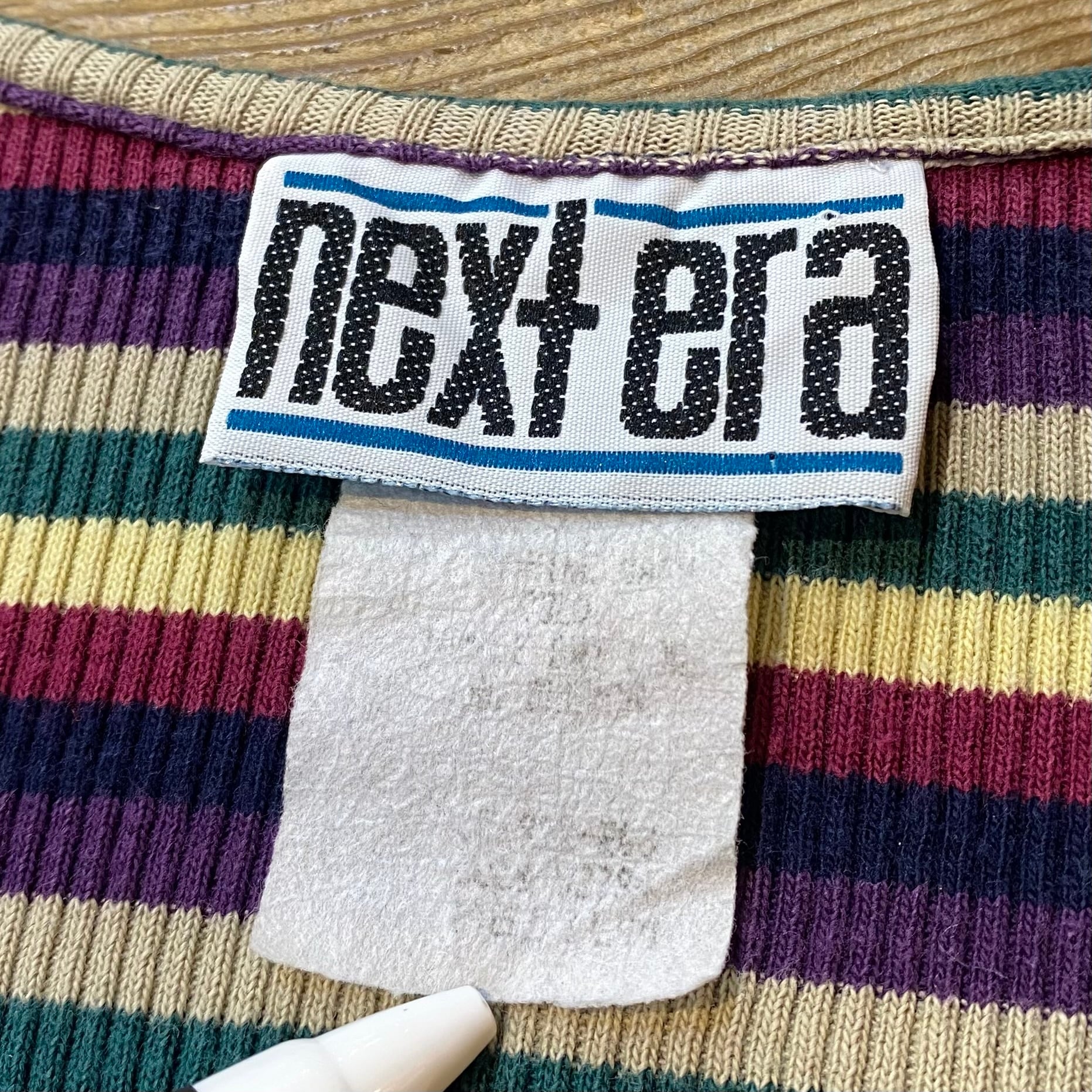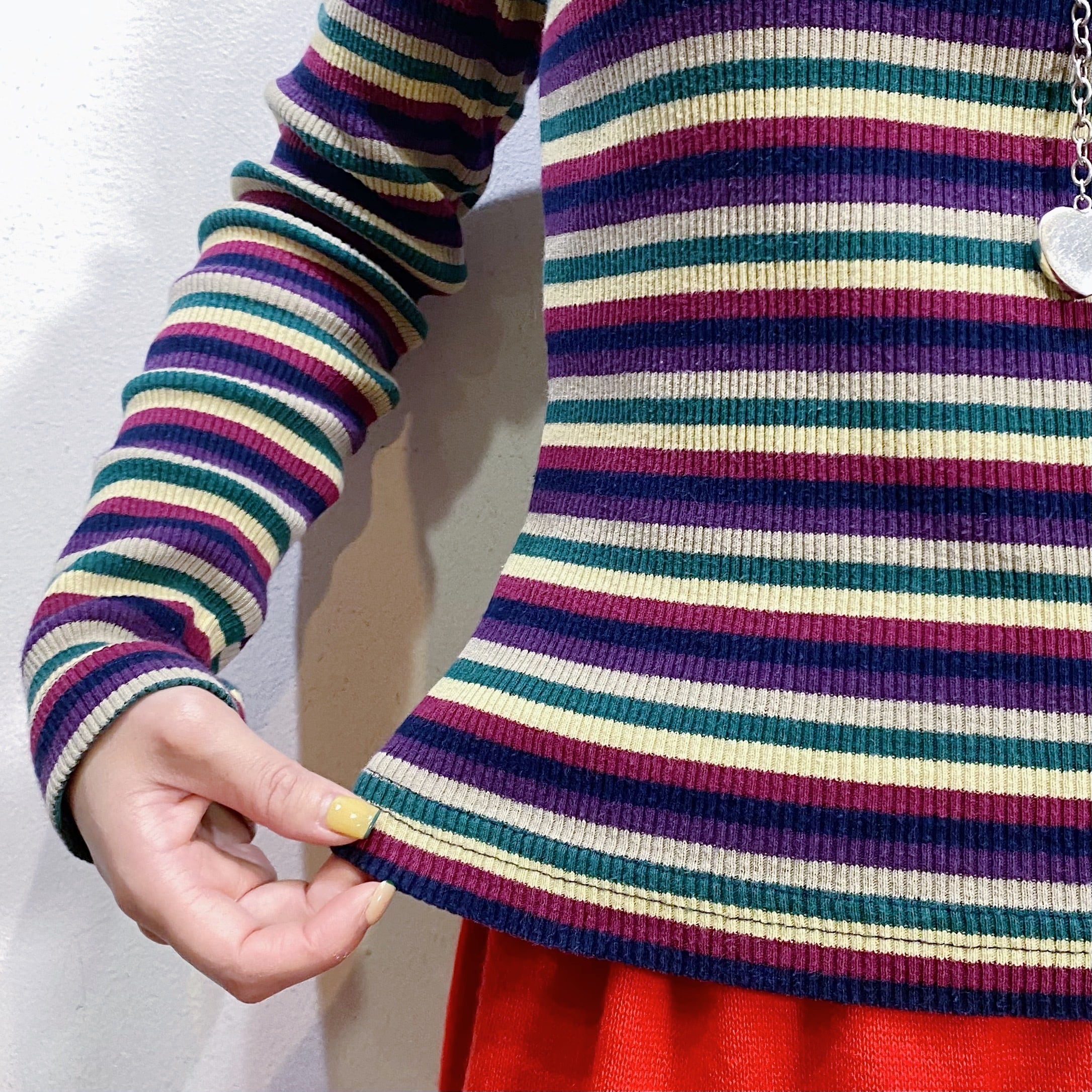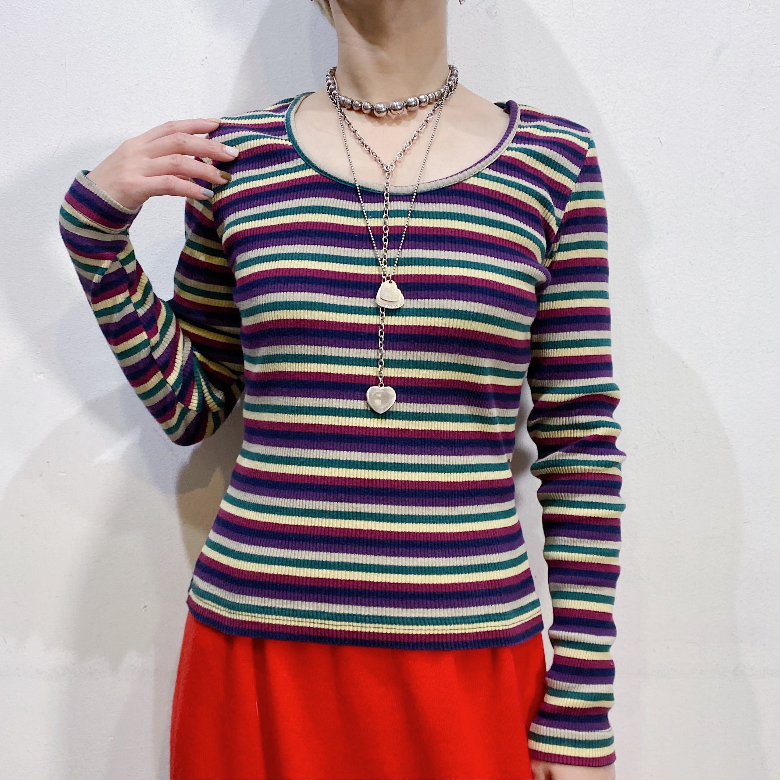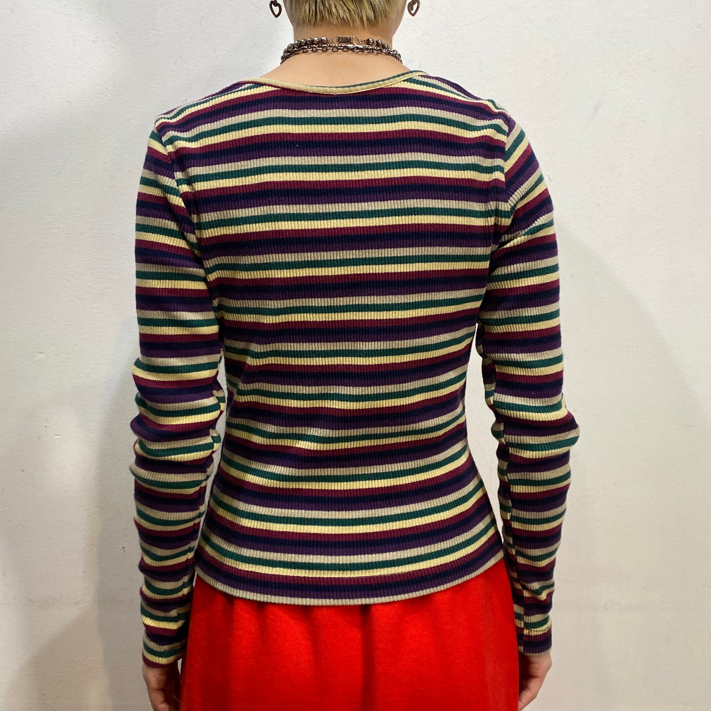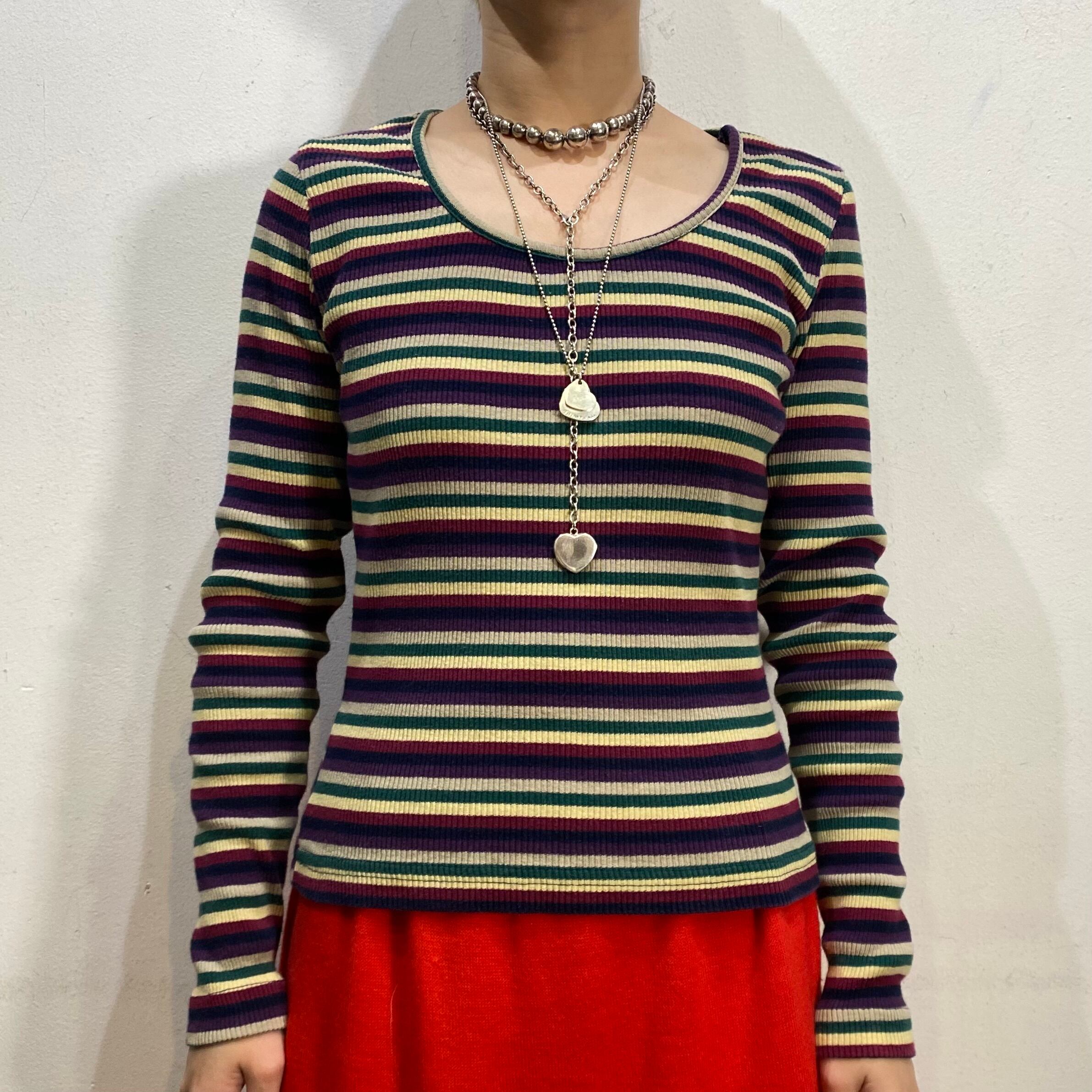 ネイビーや紫色などをベースとしたマルチカラーのボーダーが可愛い、90年代の長袖カットソーです。