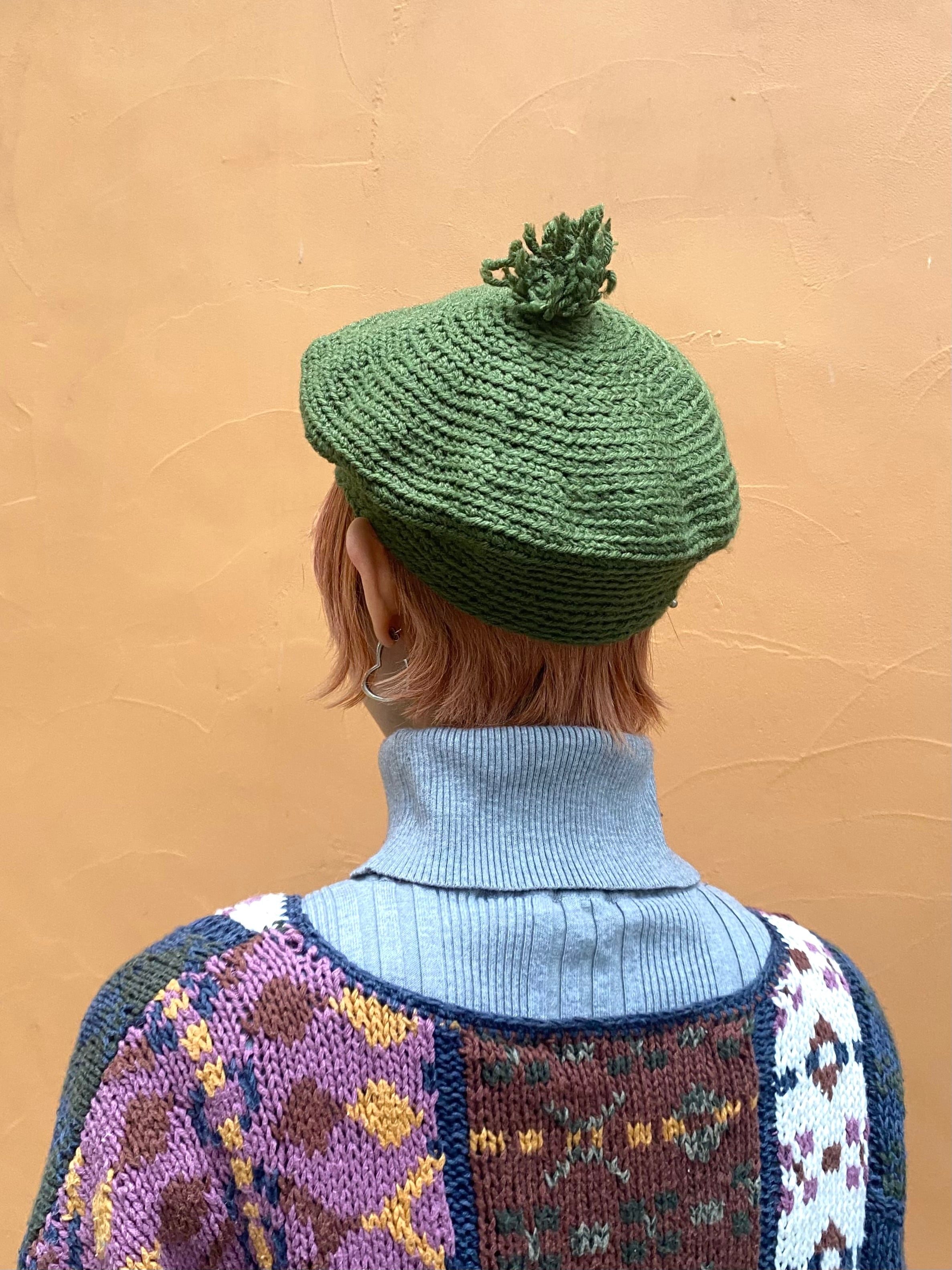 ポンポンが可愛い70年代頃のハンドニットベレー帽です。