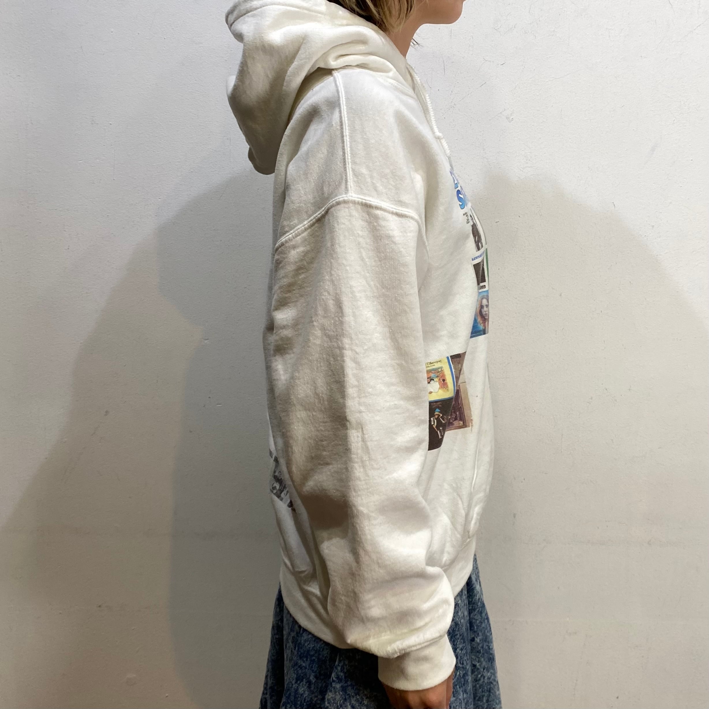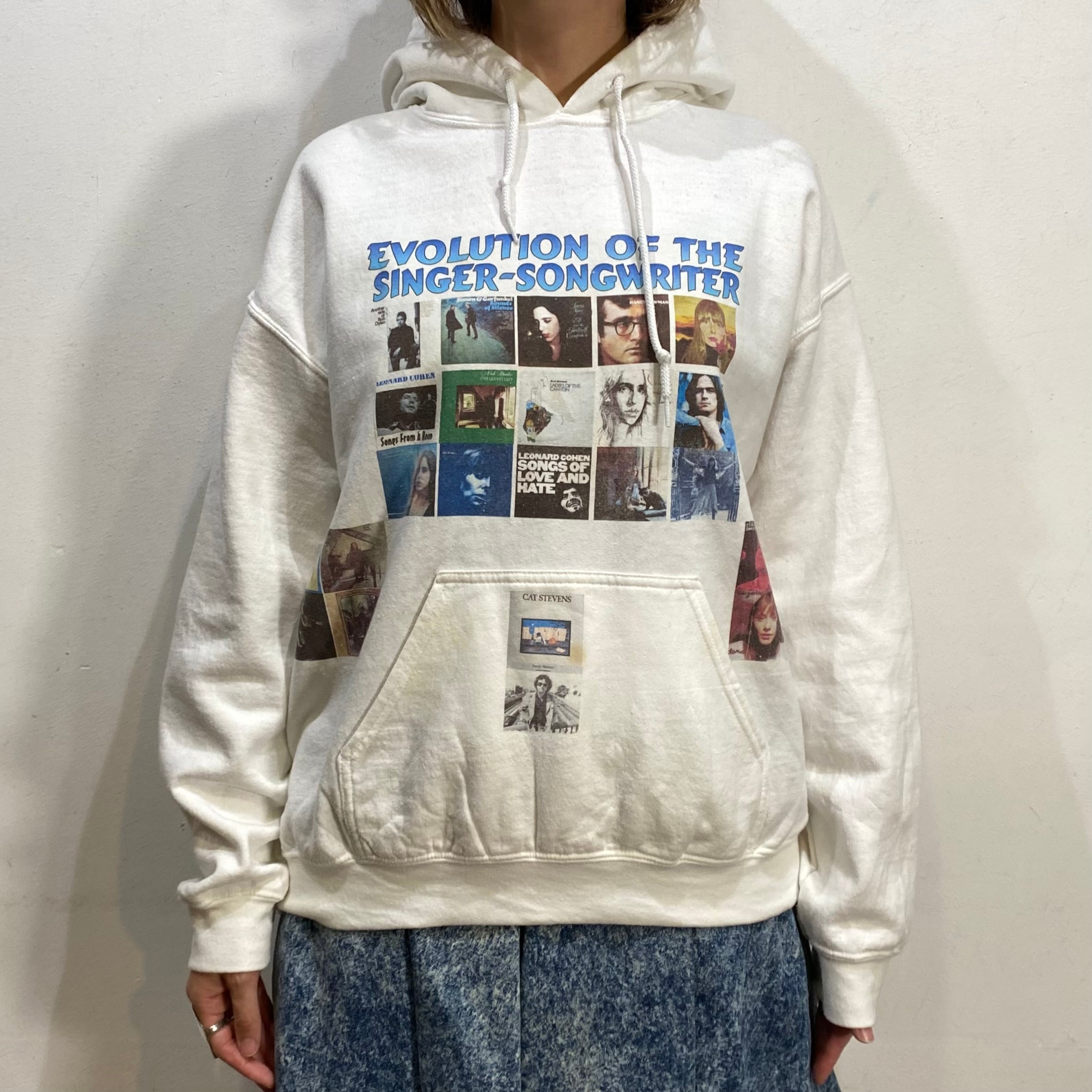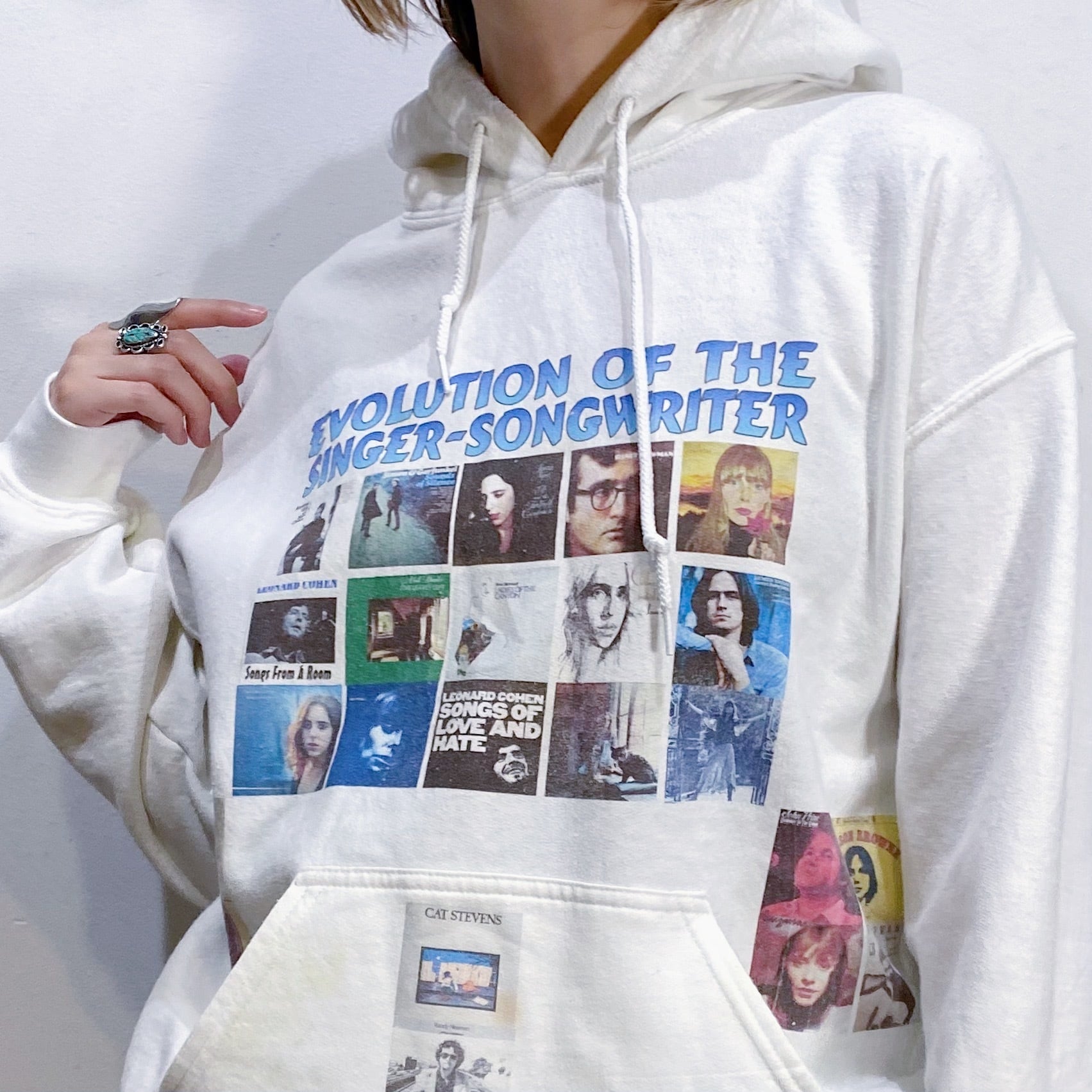 様々なシンガーソングライターのジャケットがプリントされた、フーディーです。