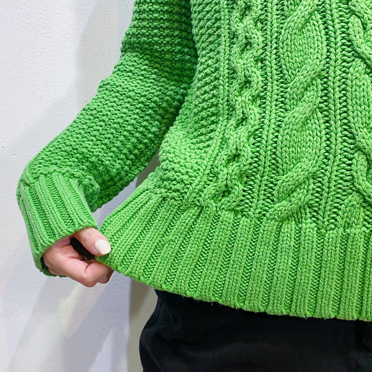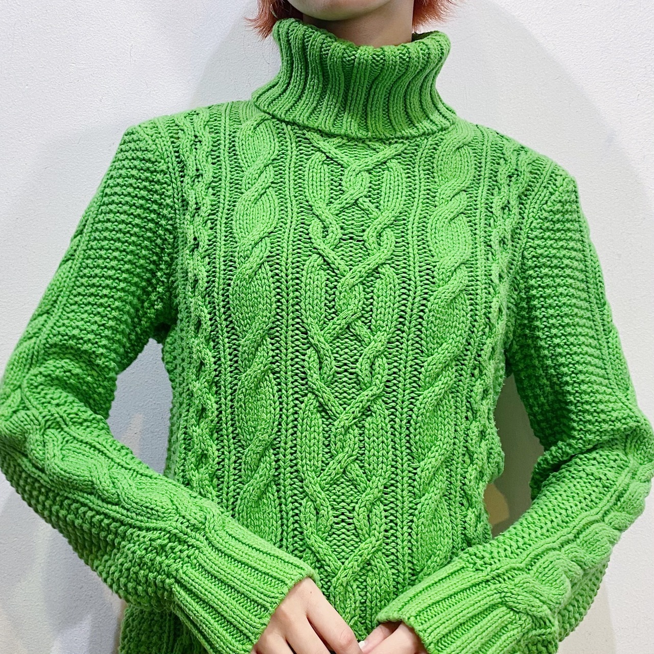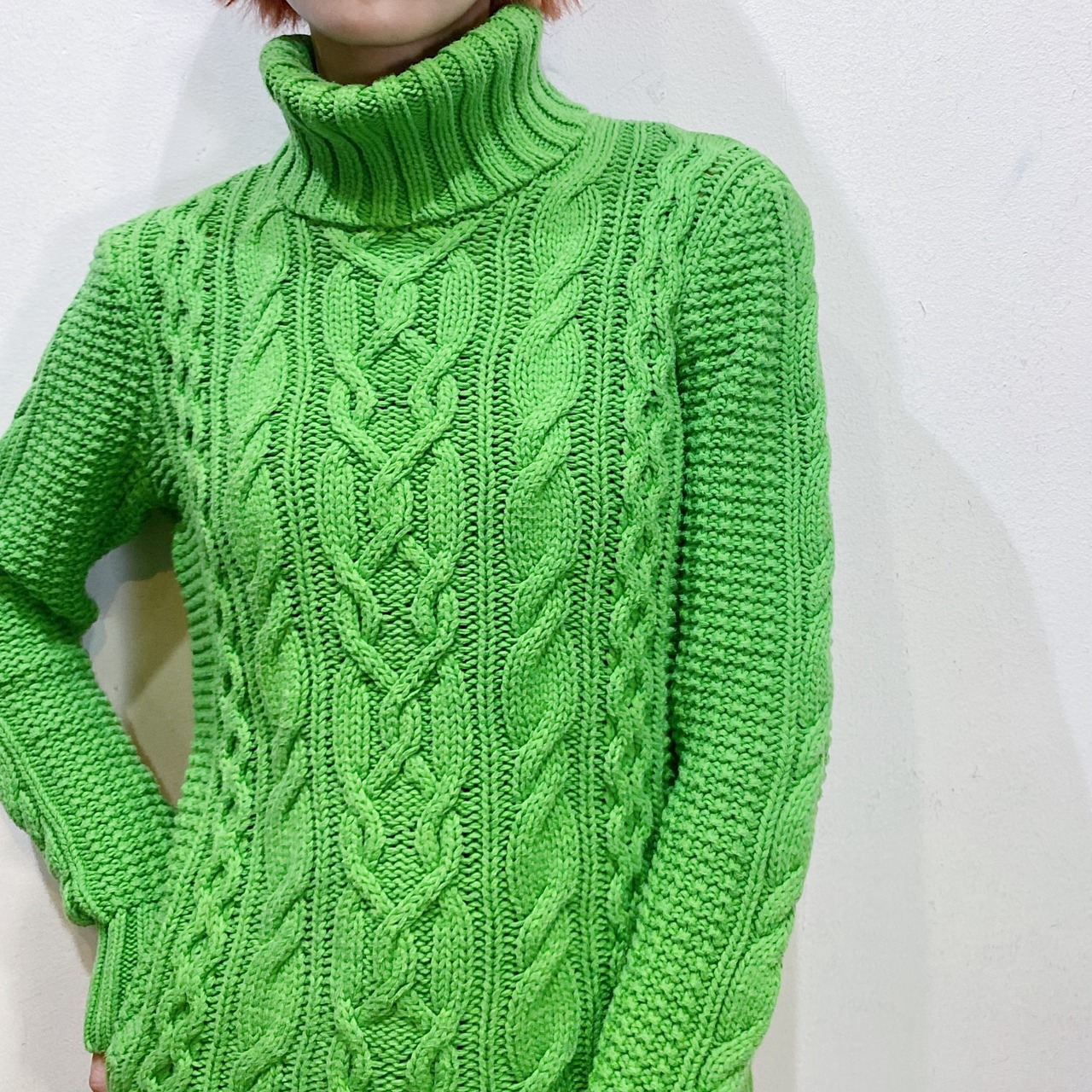 差し色にも使える綺麗な黄緑色が魅力のラルフローレンのハイネックセーターです。