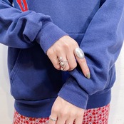 赤のプリントの色合わせも可愛く、ネイビーベースで着こなしやすいですよ。