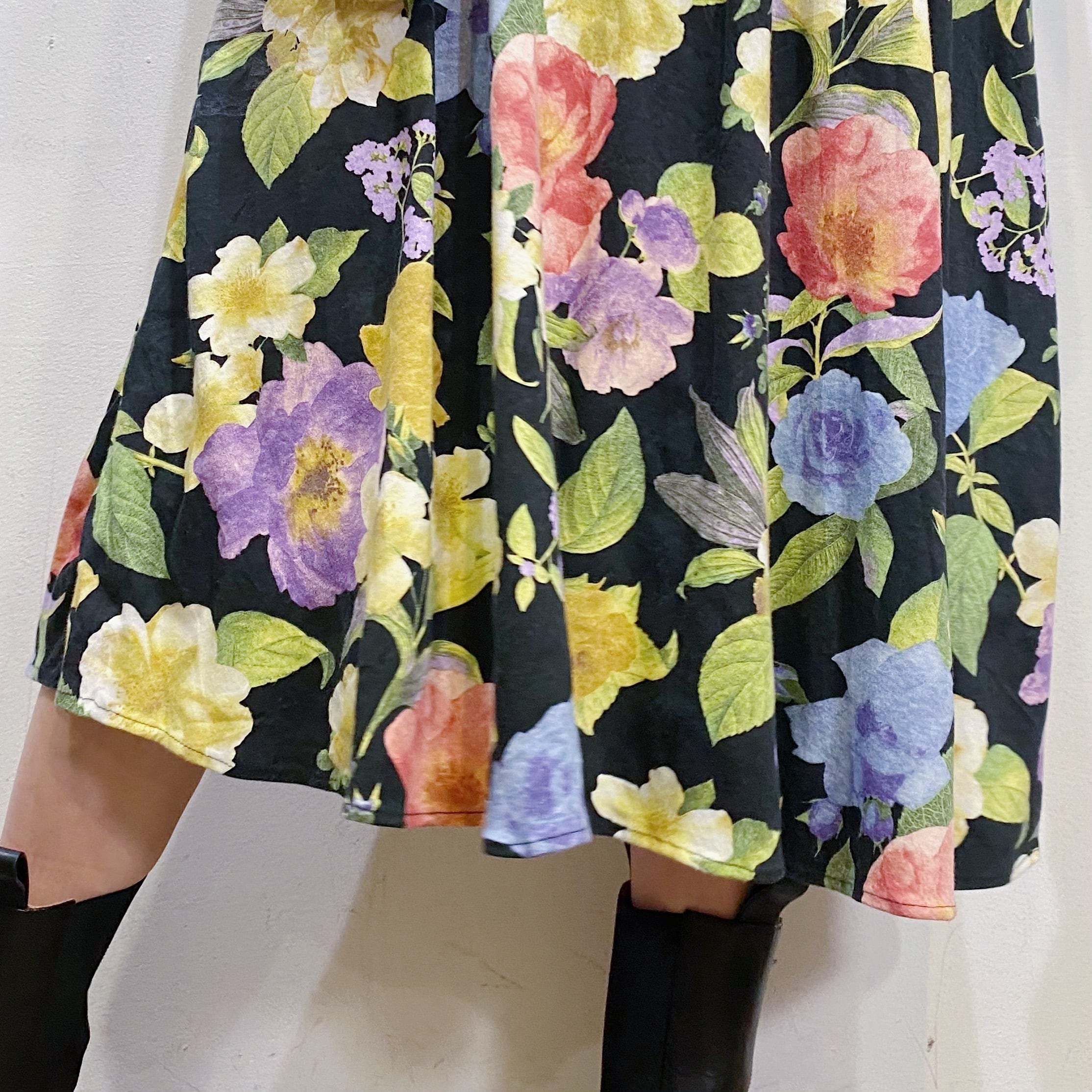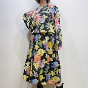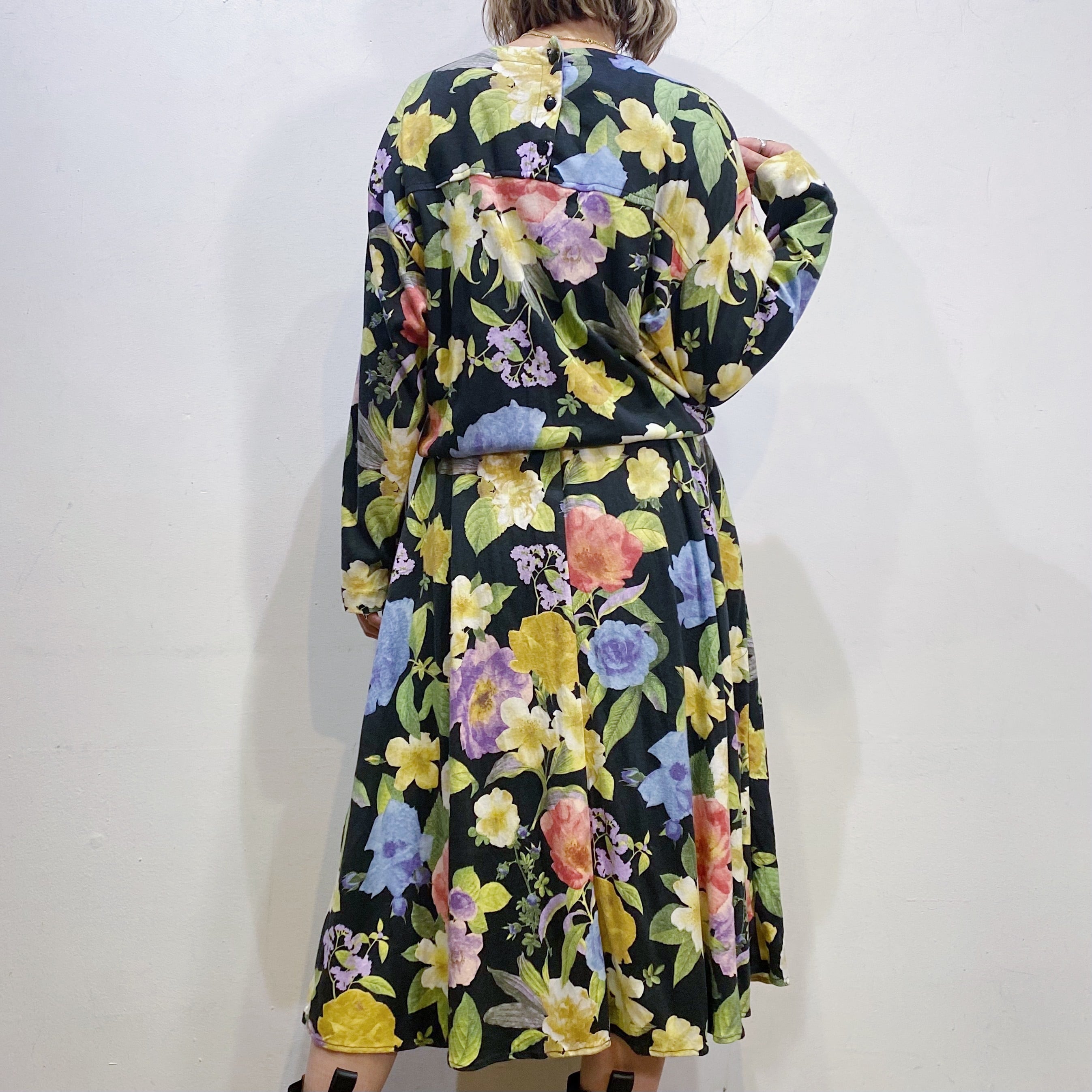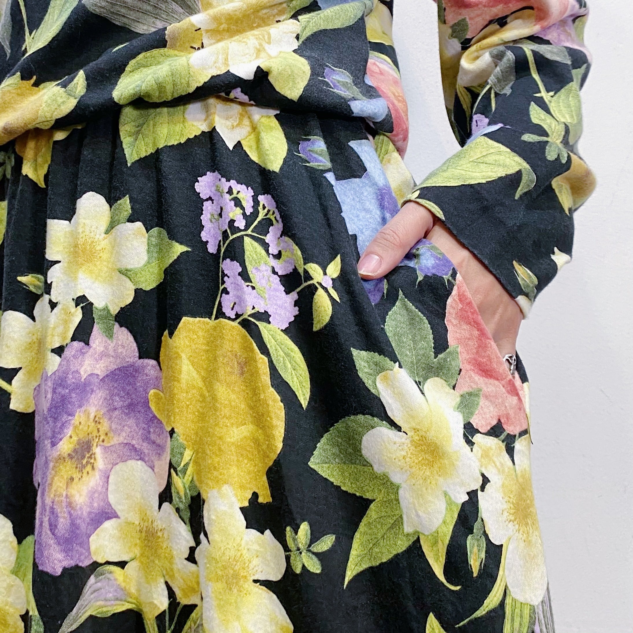 ブラックベースにカラフルな花柄が可愛い、80年代のワンピースです。