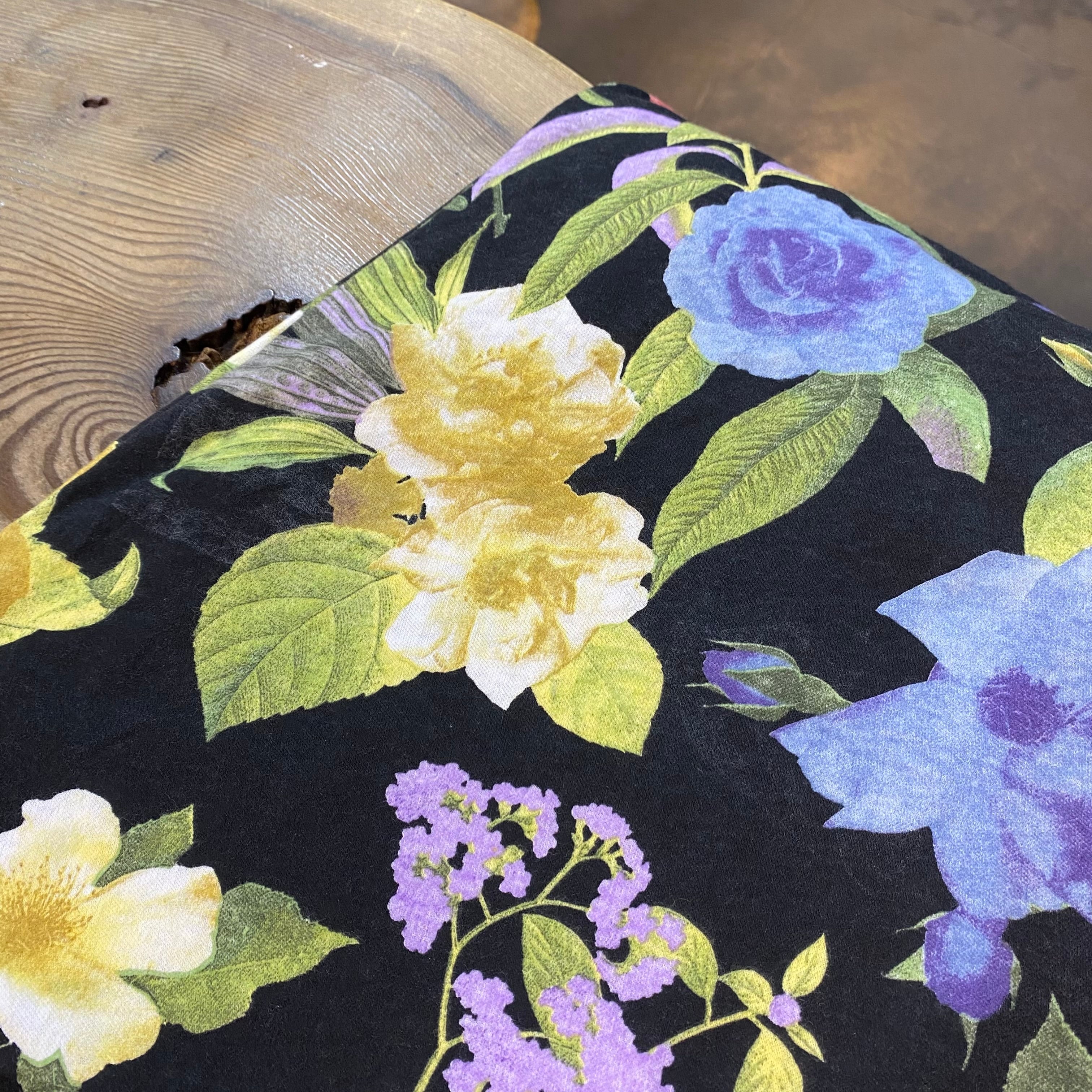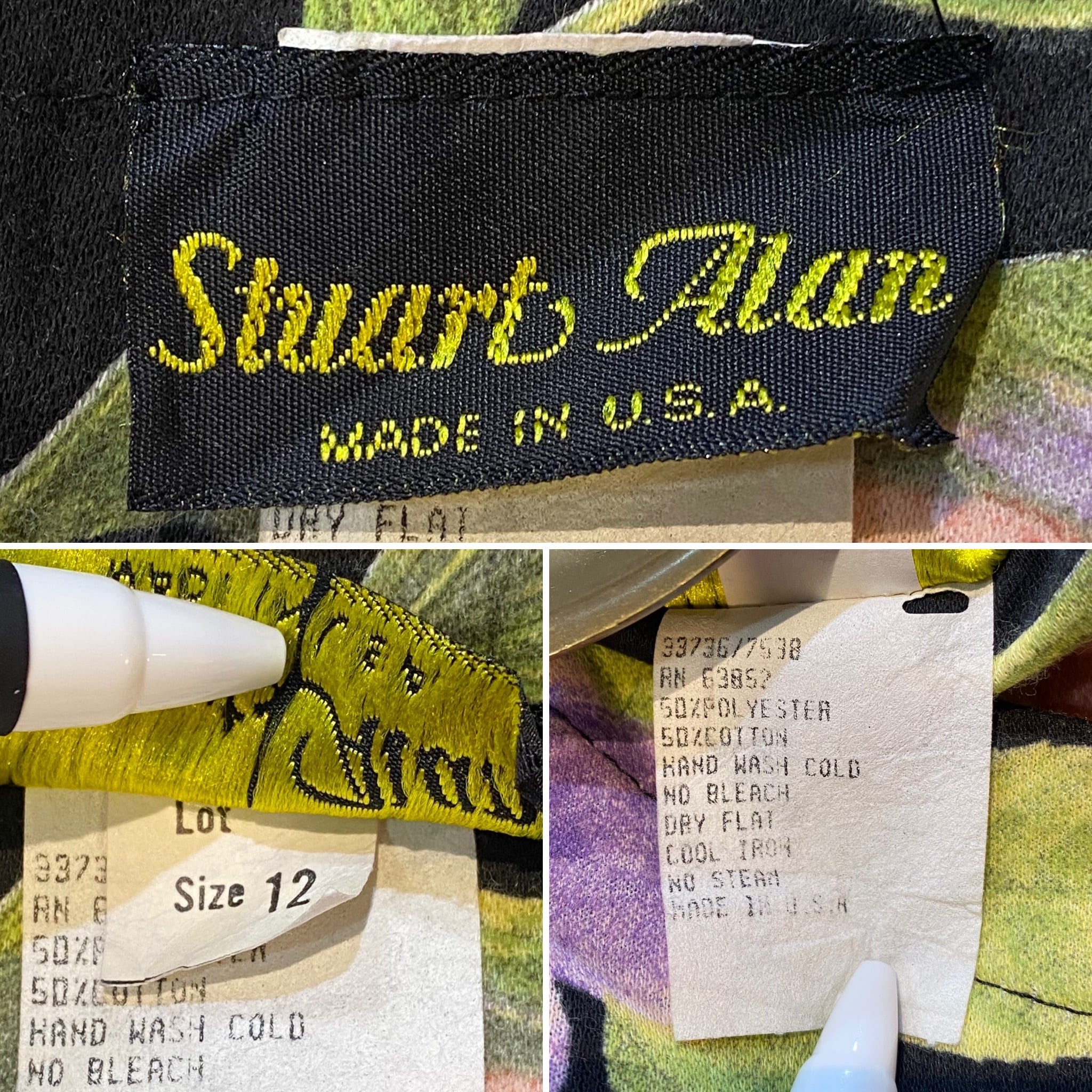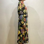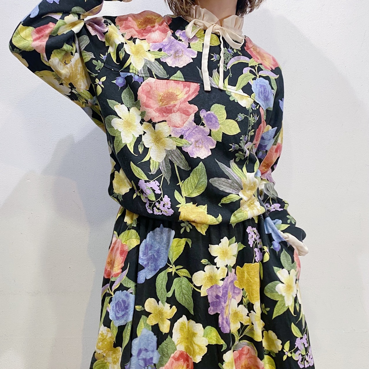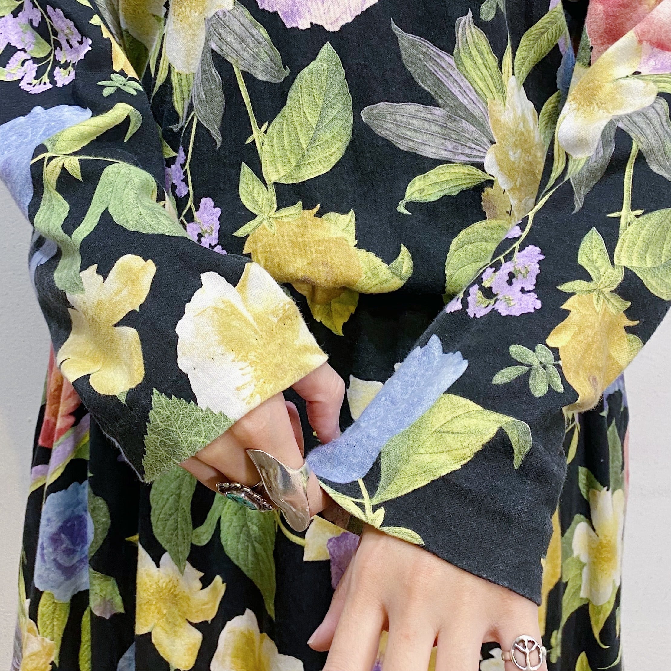 ブラックベースにカラフルな花柄が可愛い、80年代のワンピースです。