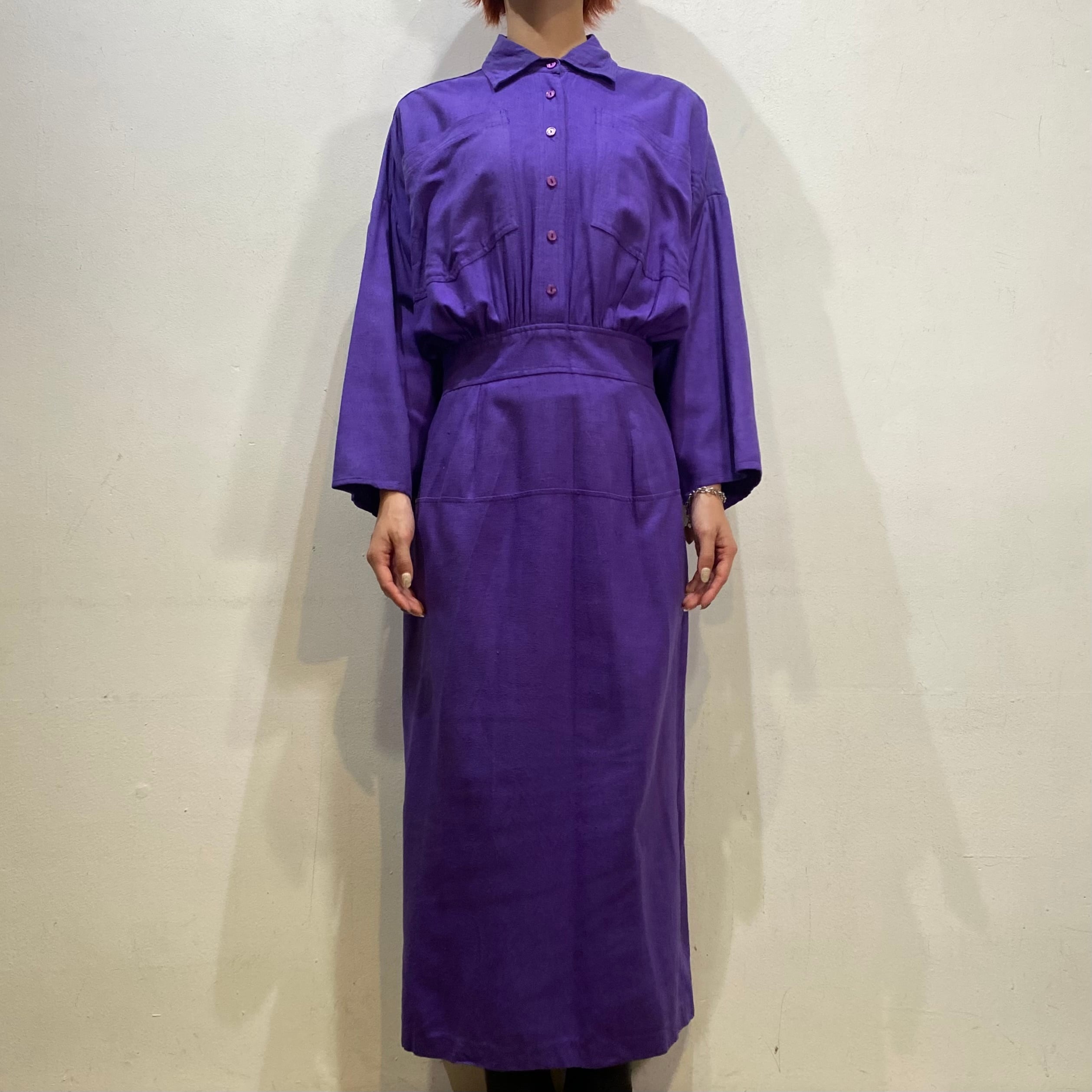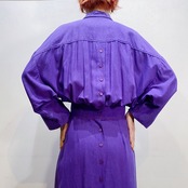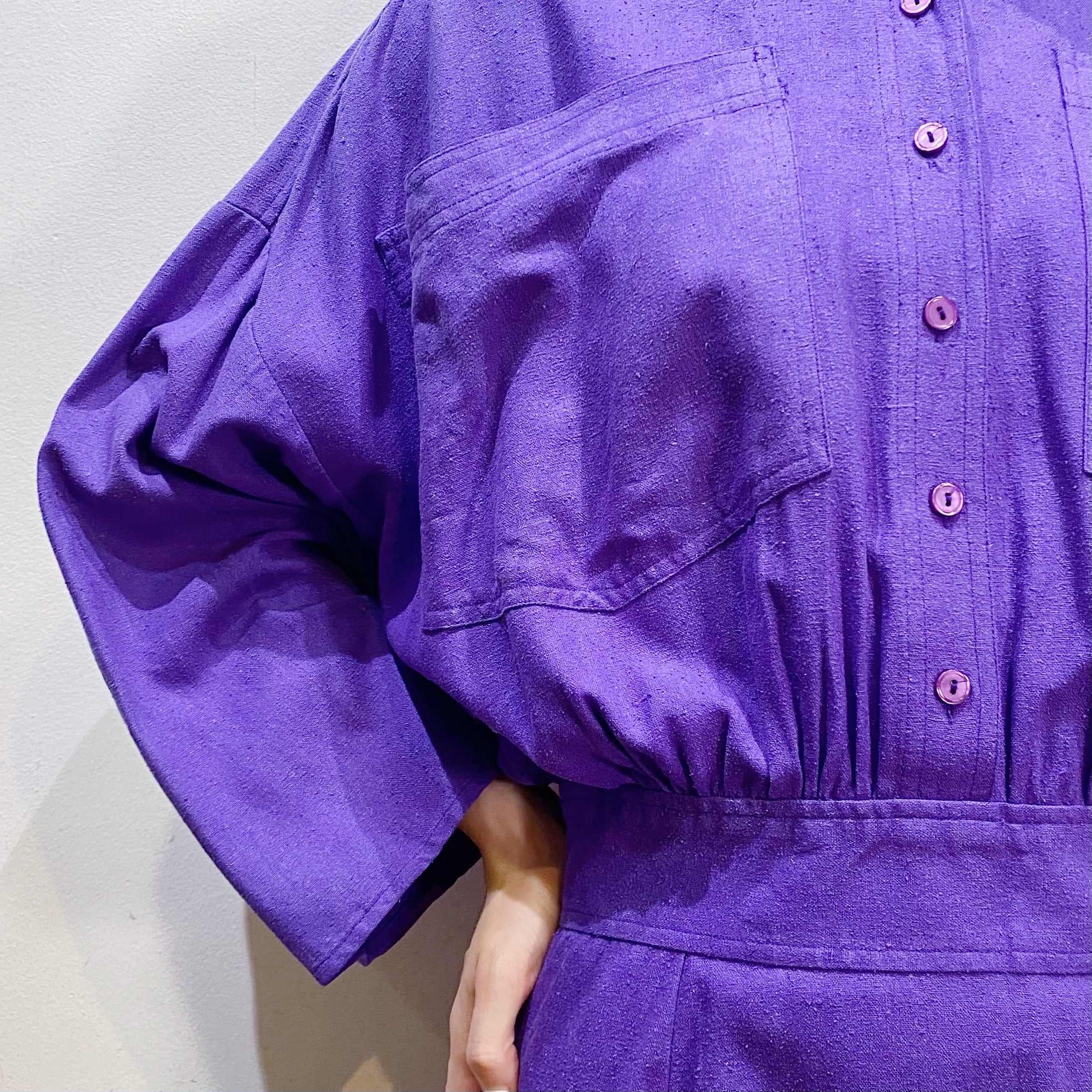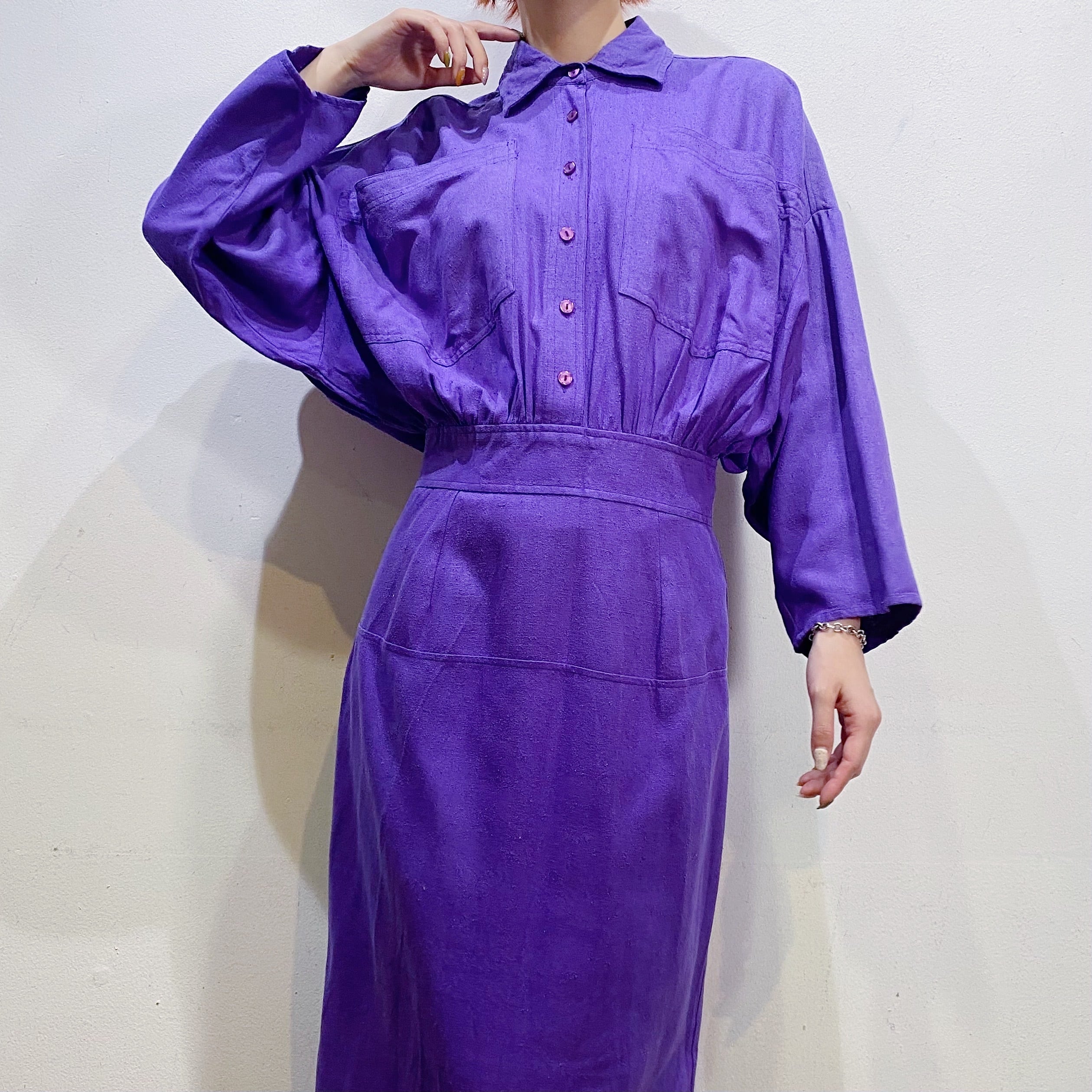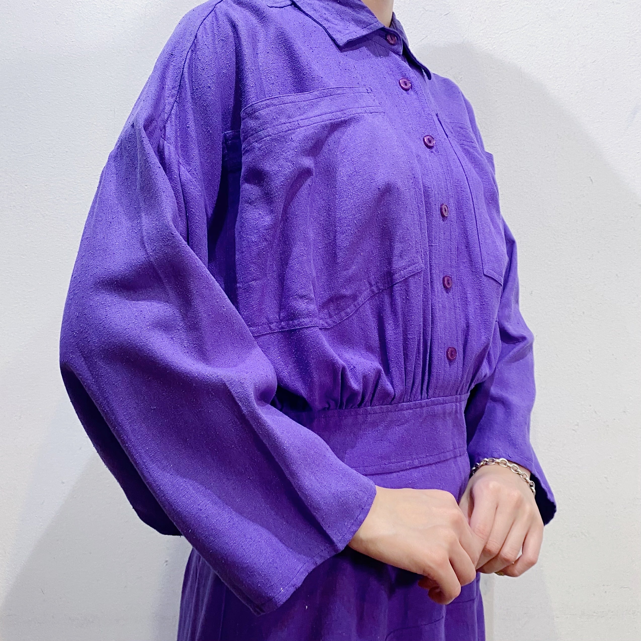 深い紫色に大きな胸ポケットで遊び心もたっぷりなワンピースです。