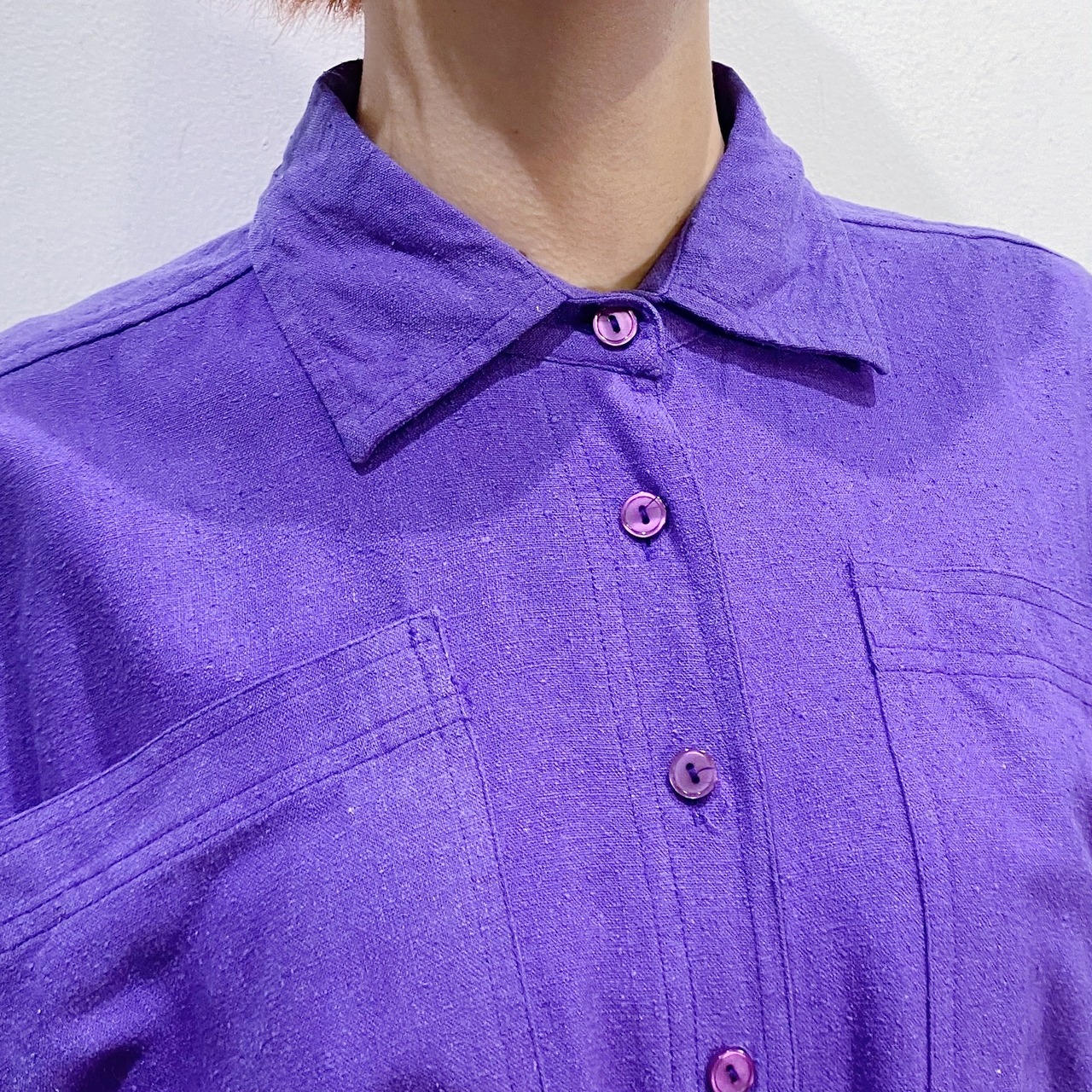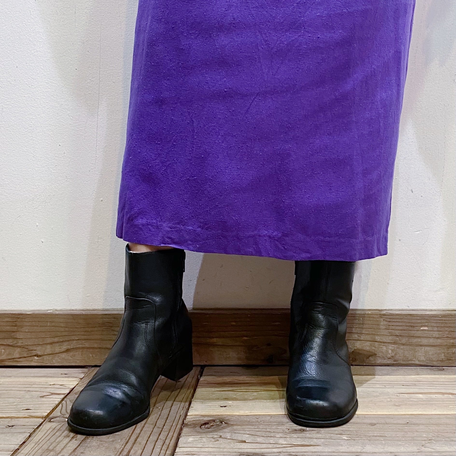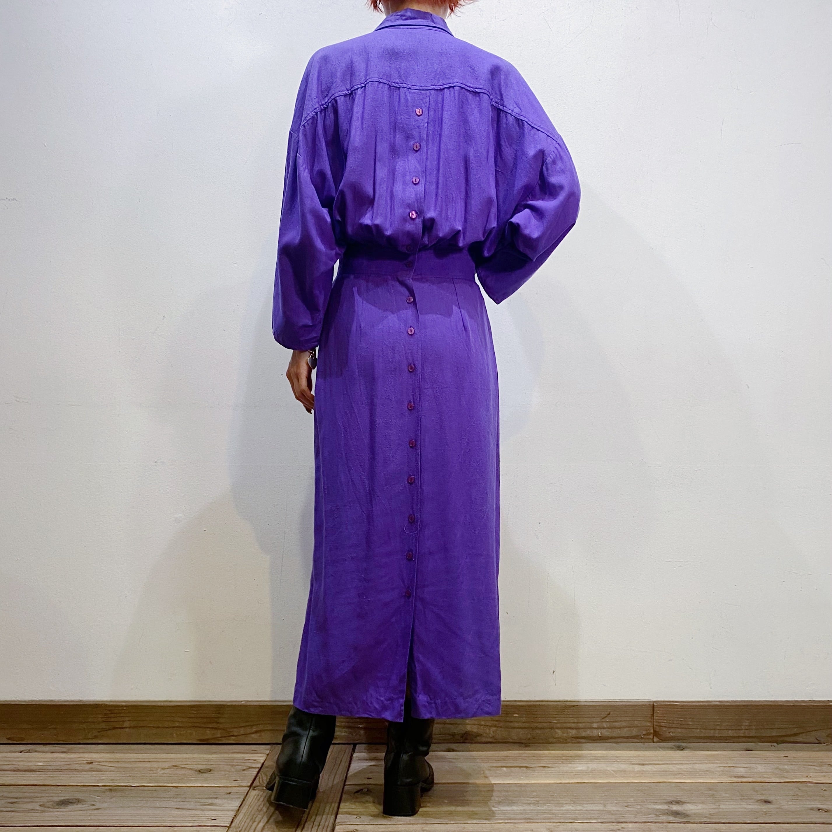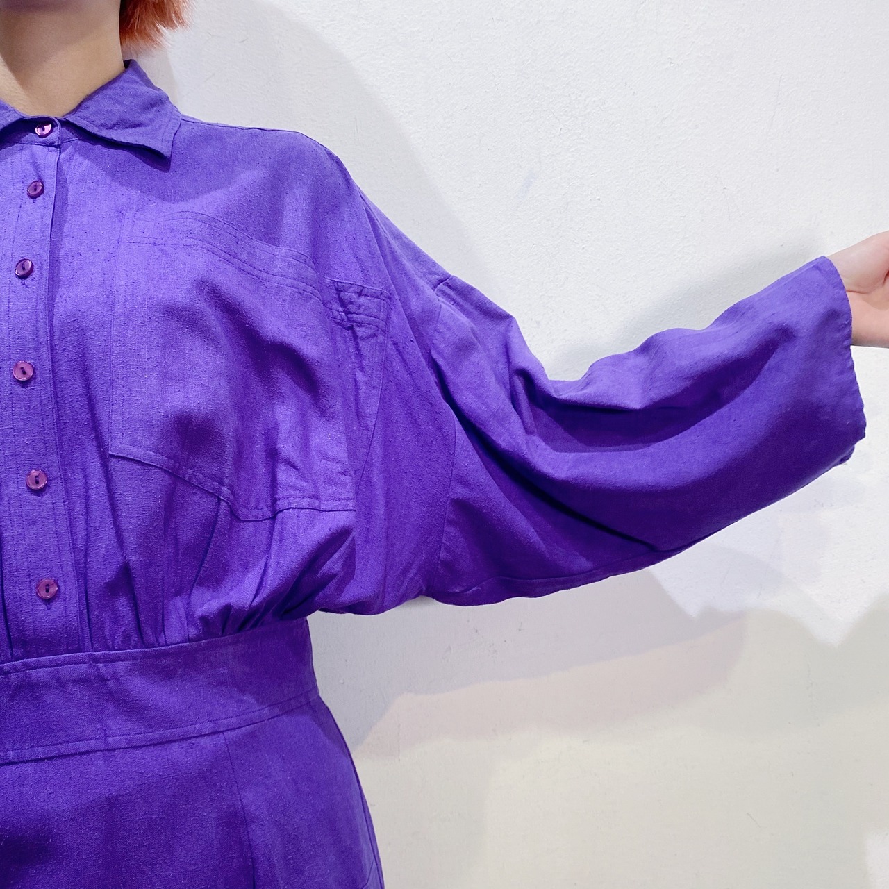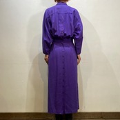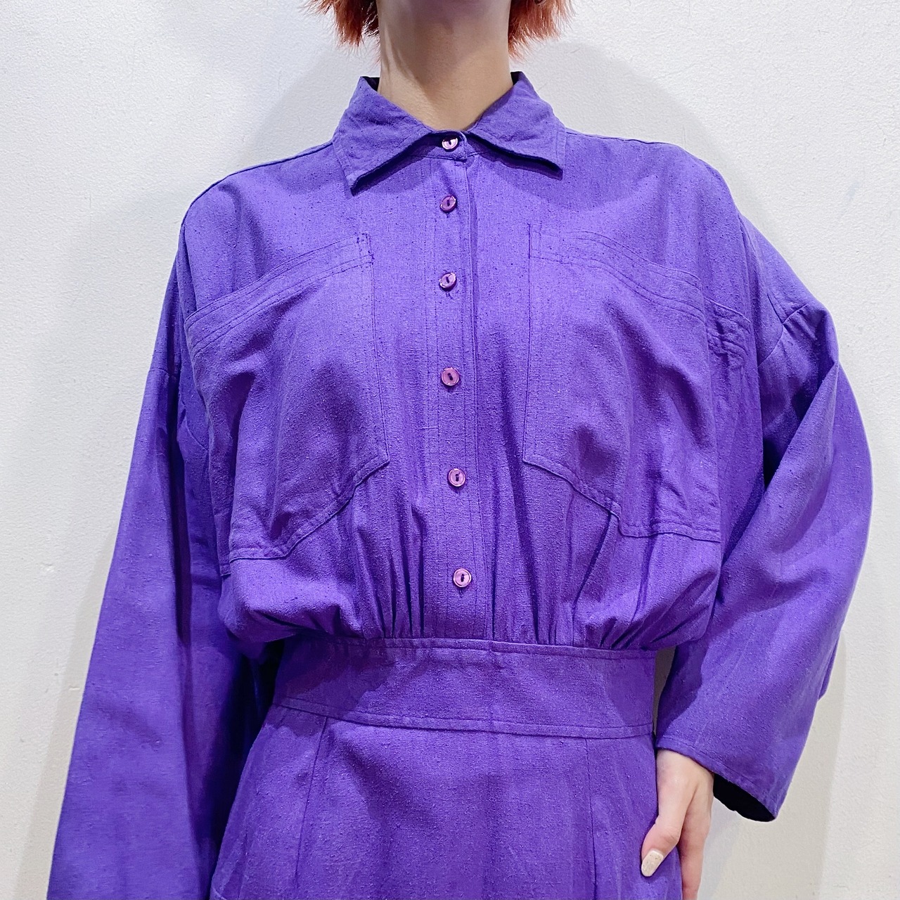 深い紫色に大きな胸ポケットで遊び心もたっぷりなワンピースです。
