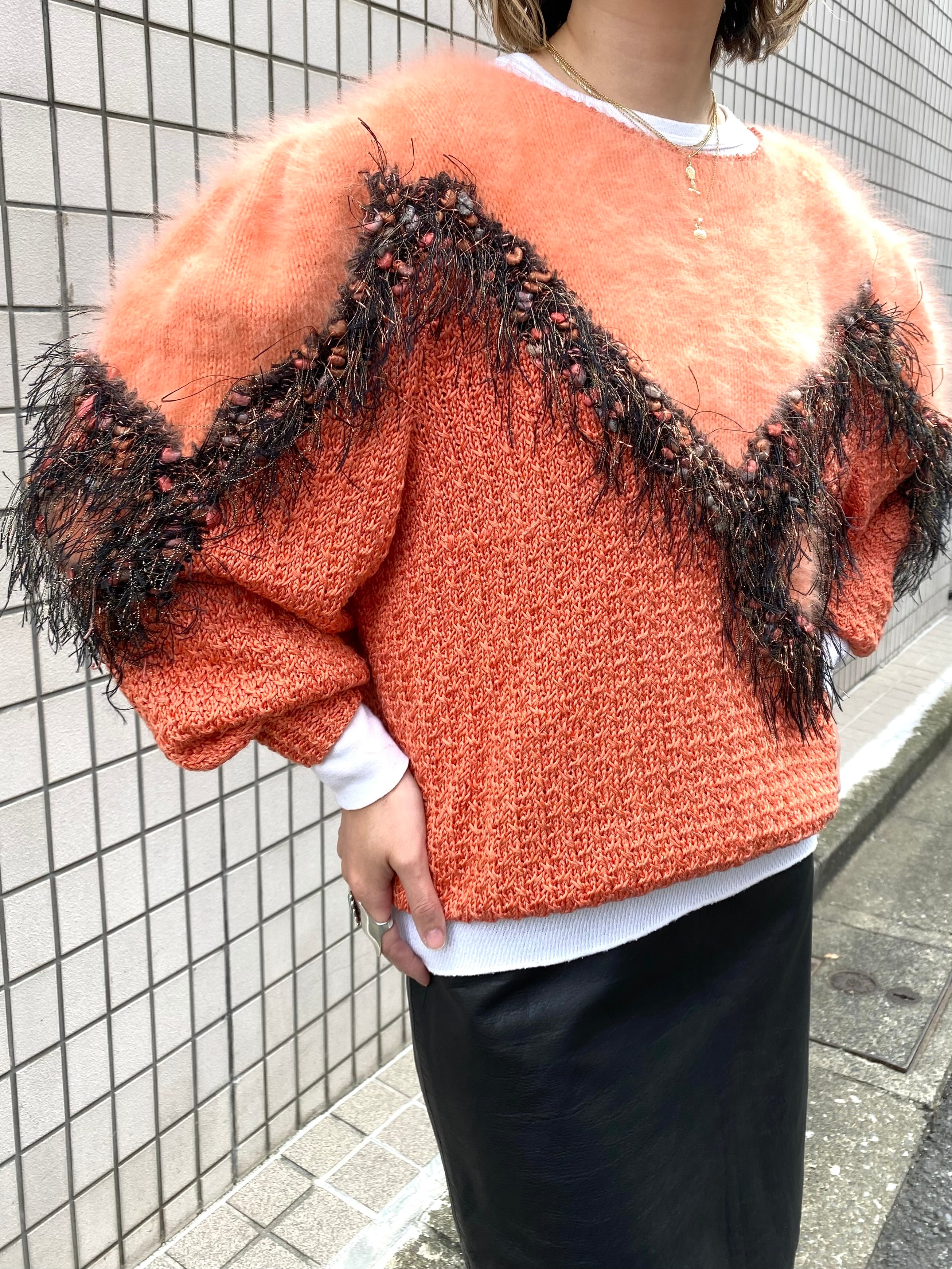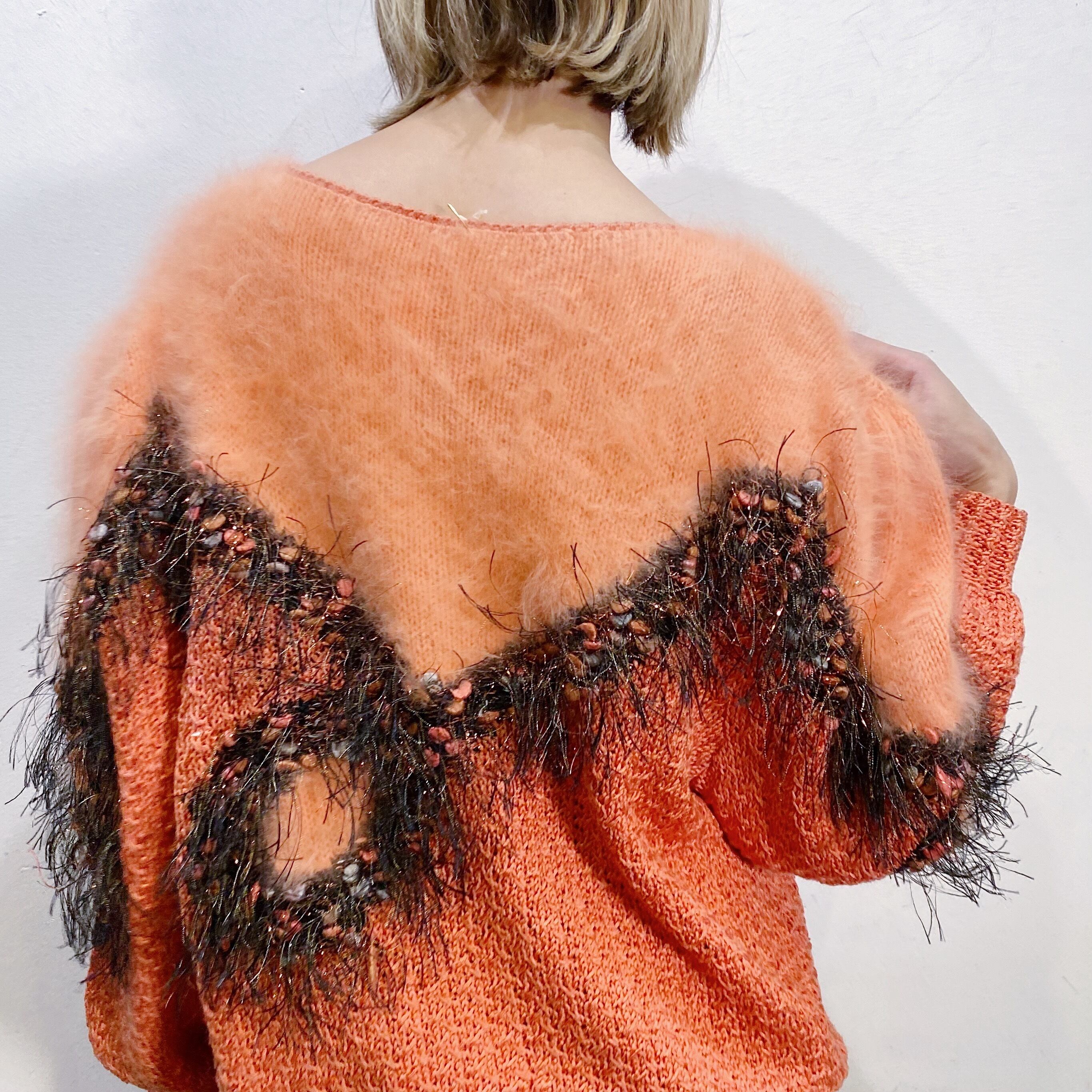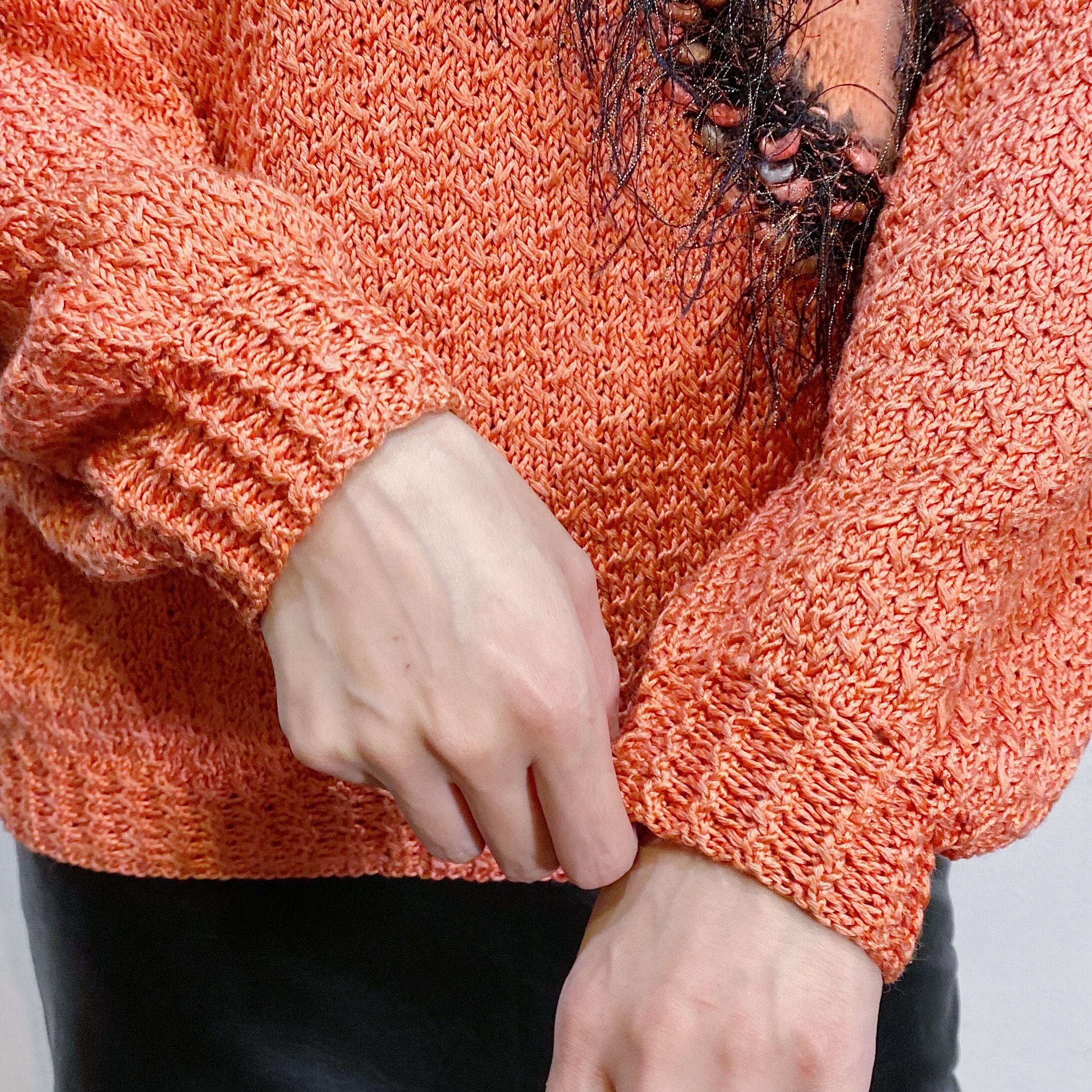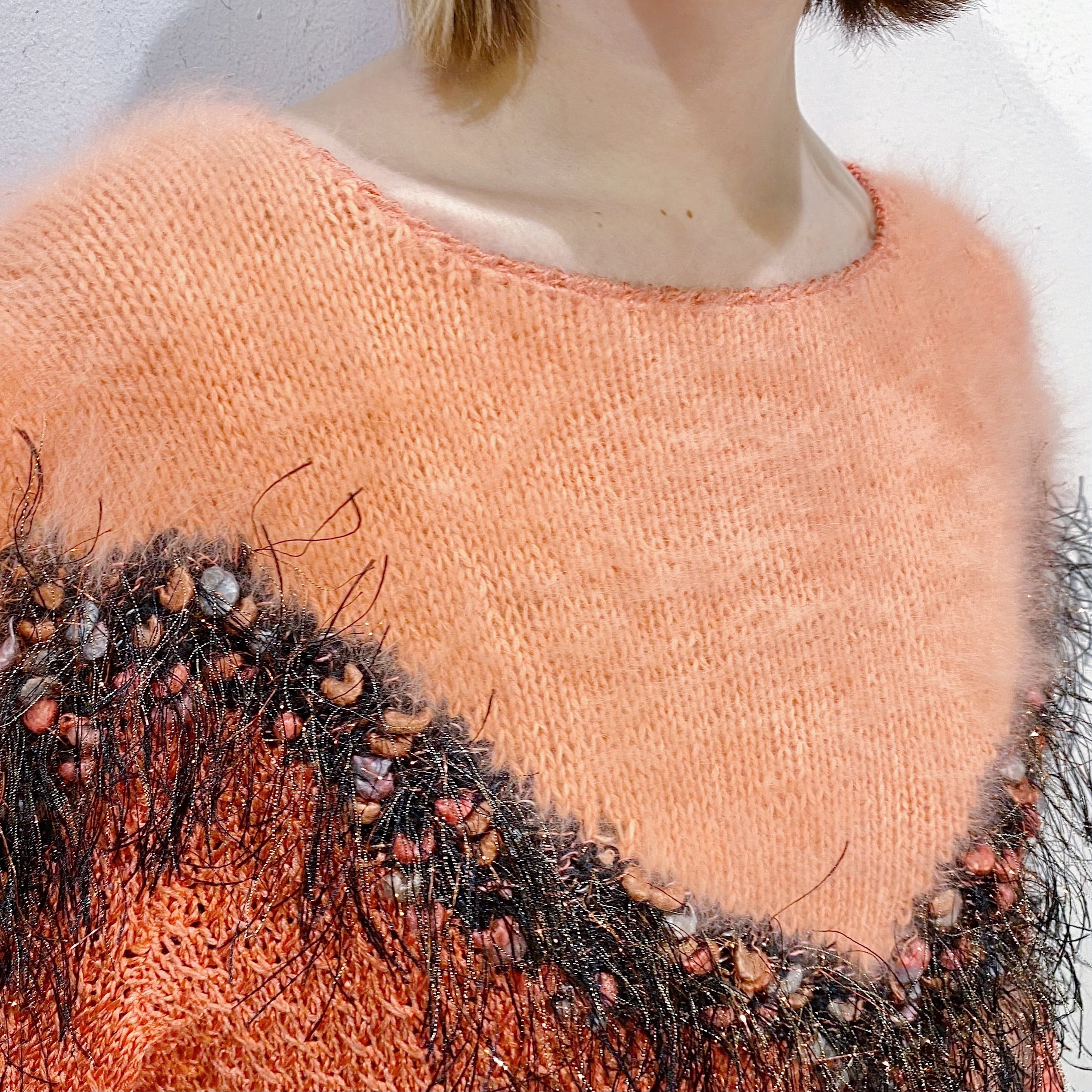 アンゴラやコットンなど素材の異なる糸を組み合わせて編まれており、デザイン性の高い一枚となっております。