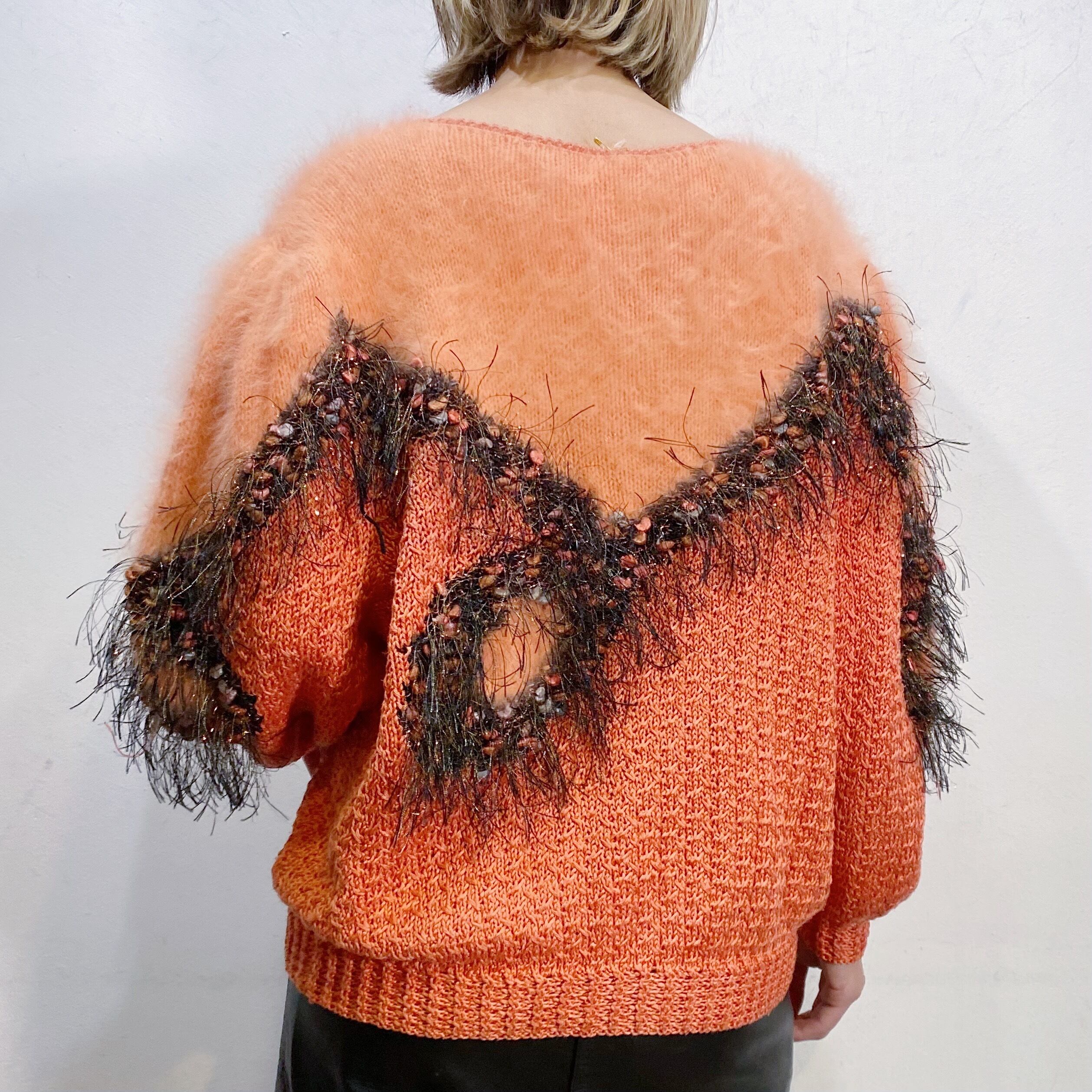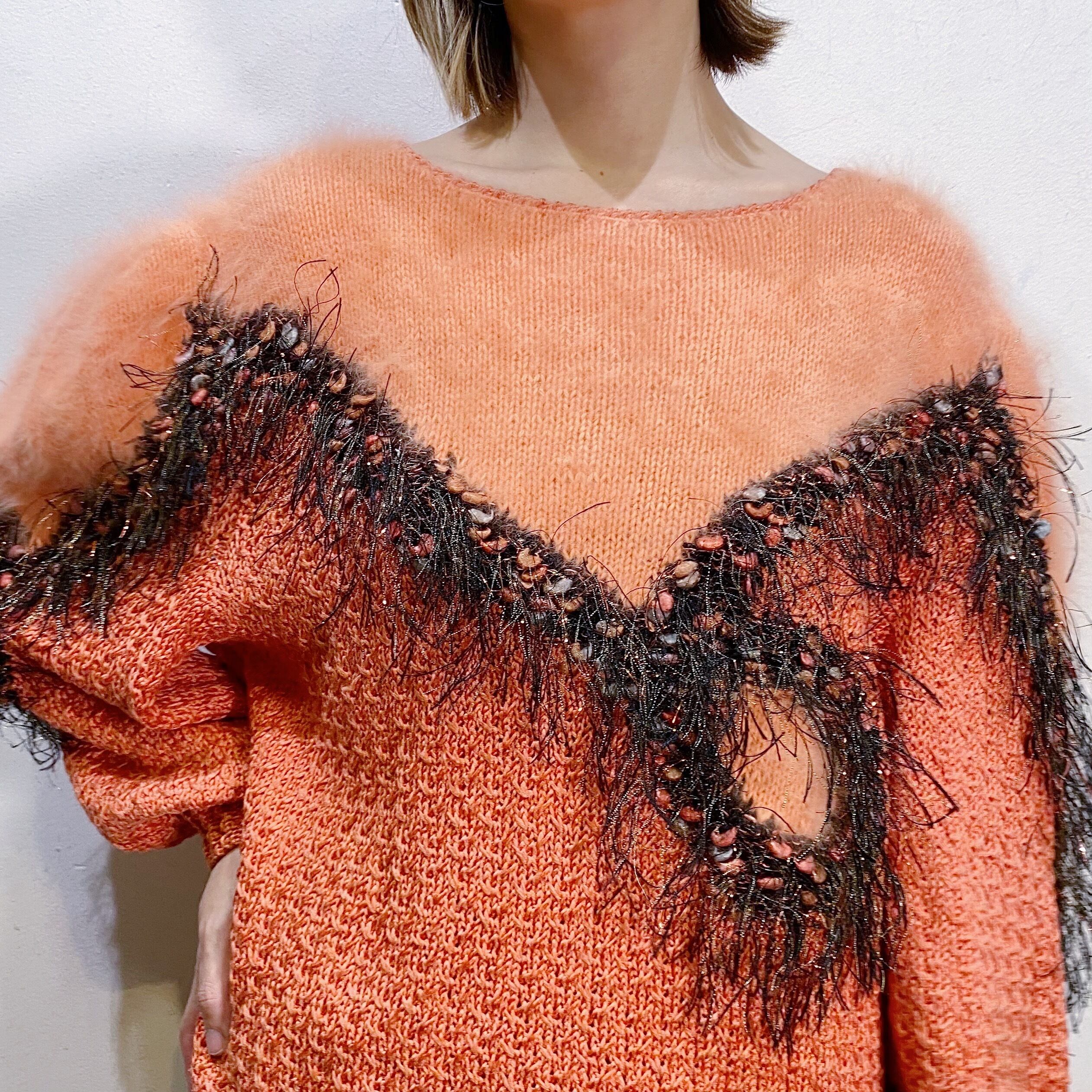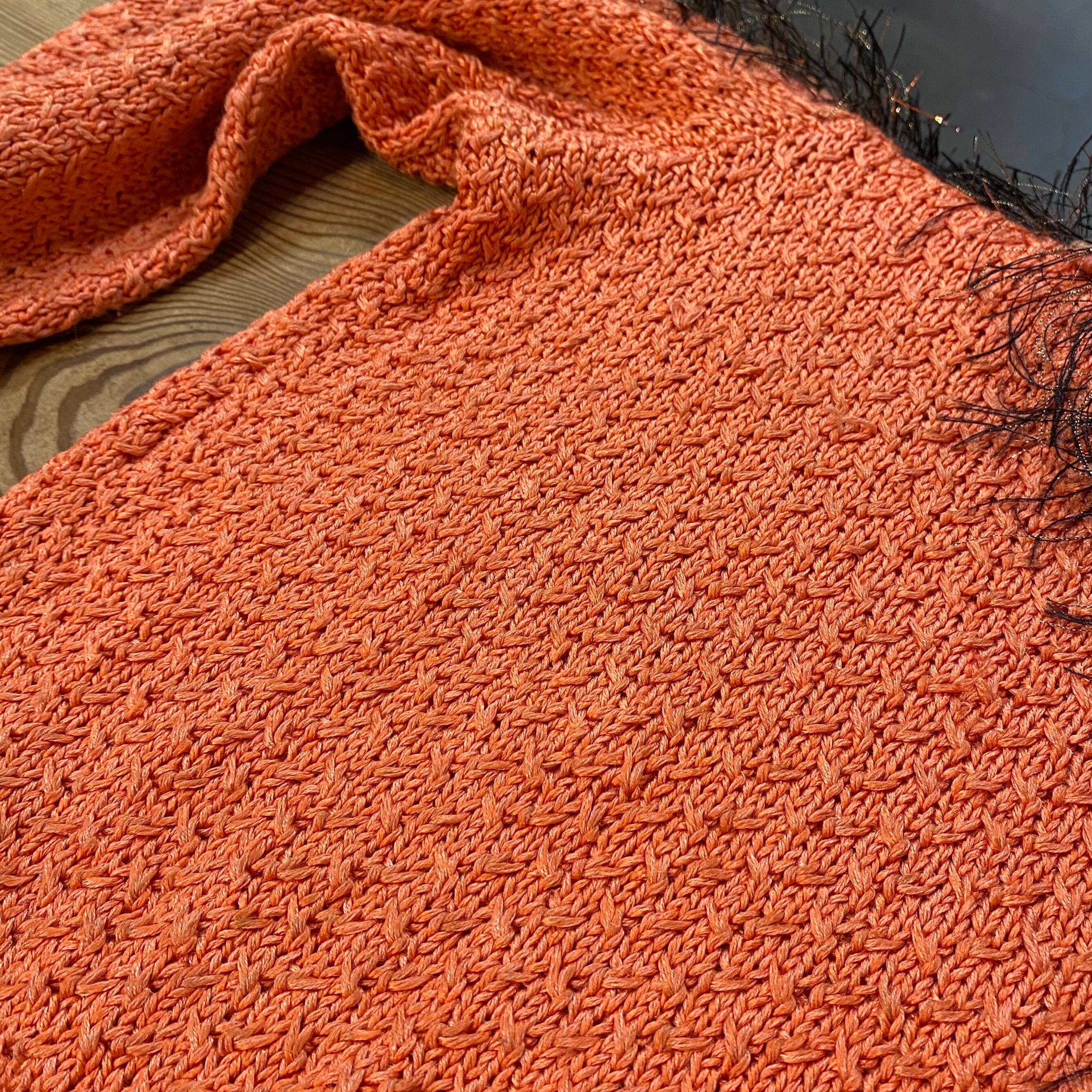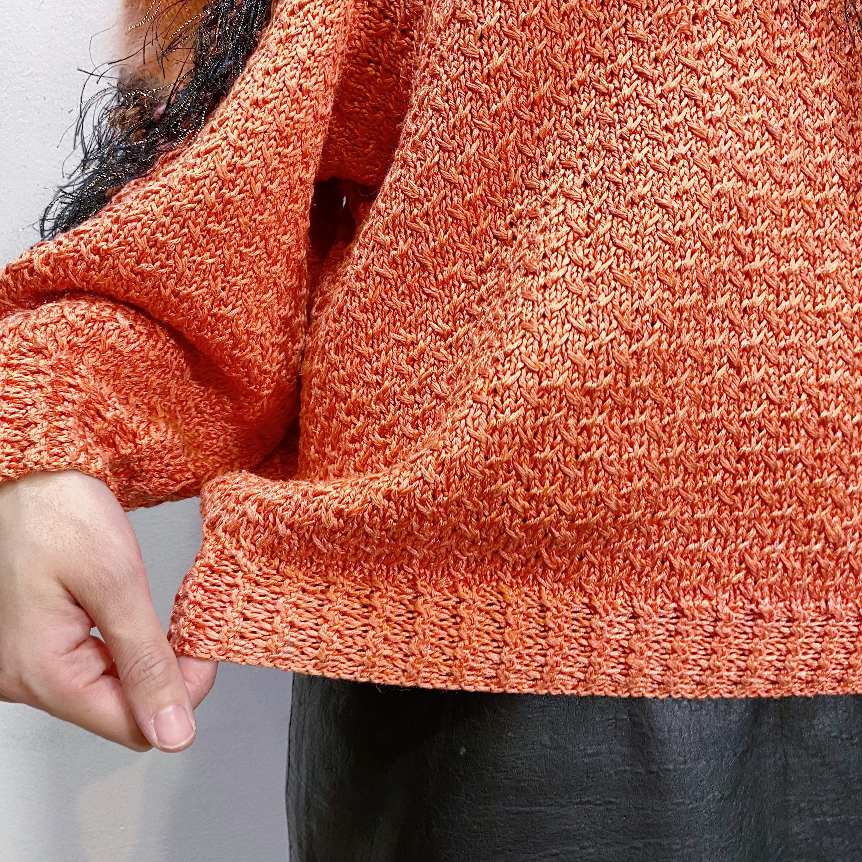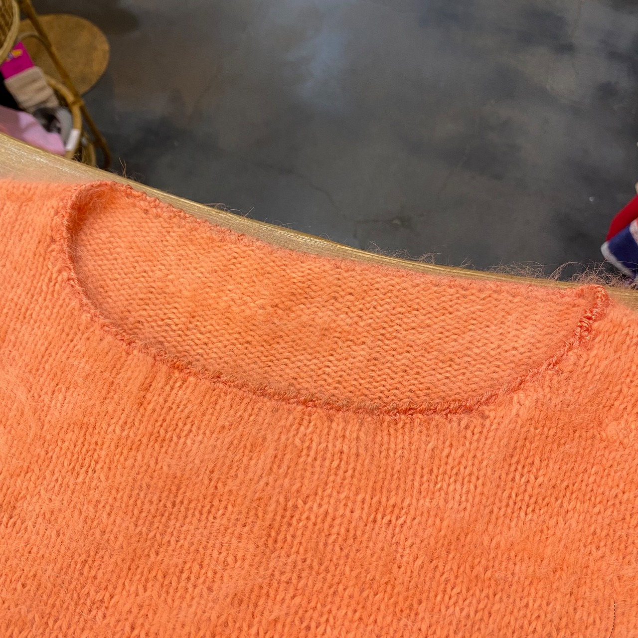 アンゴラやコットンなど素材の異なる糸を組み合わせて編まれており、デザイン性の高い一枚となっております。
