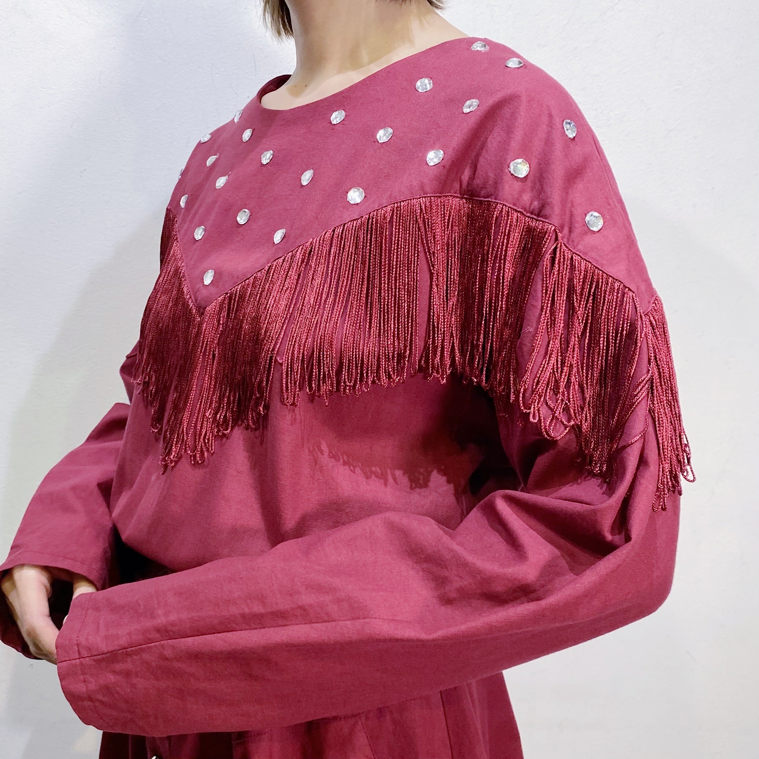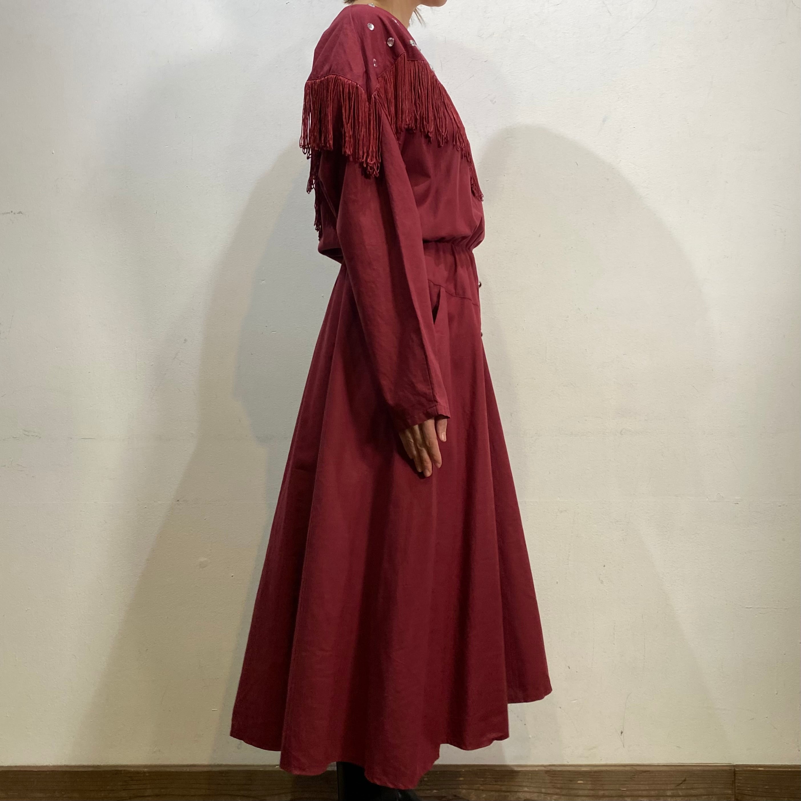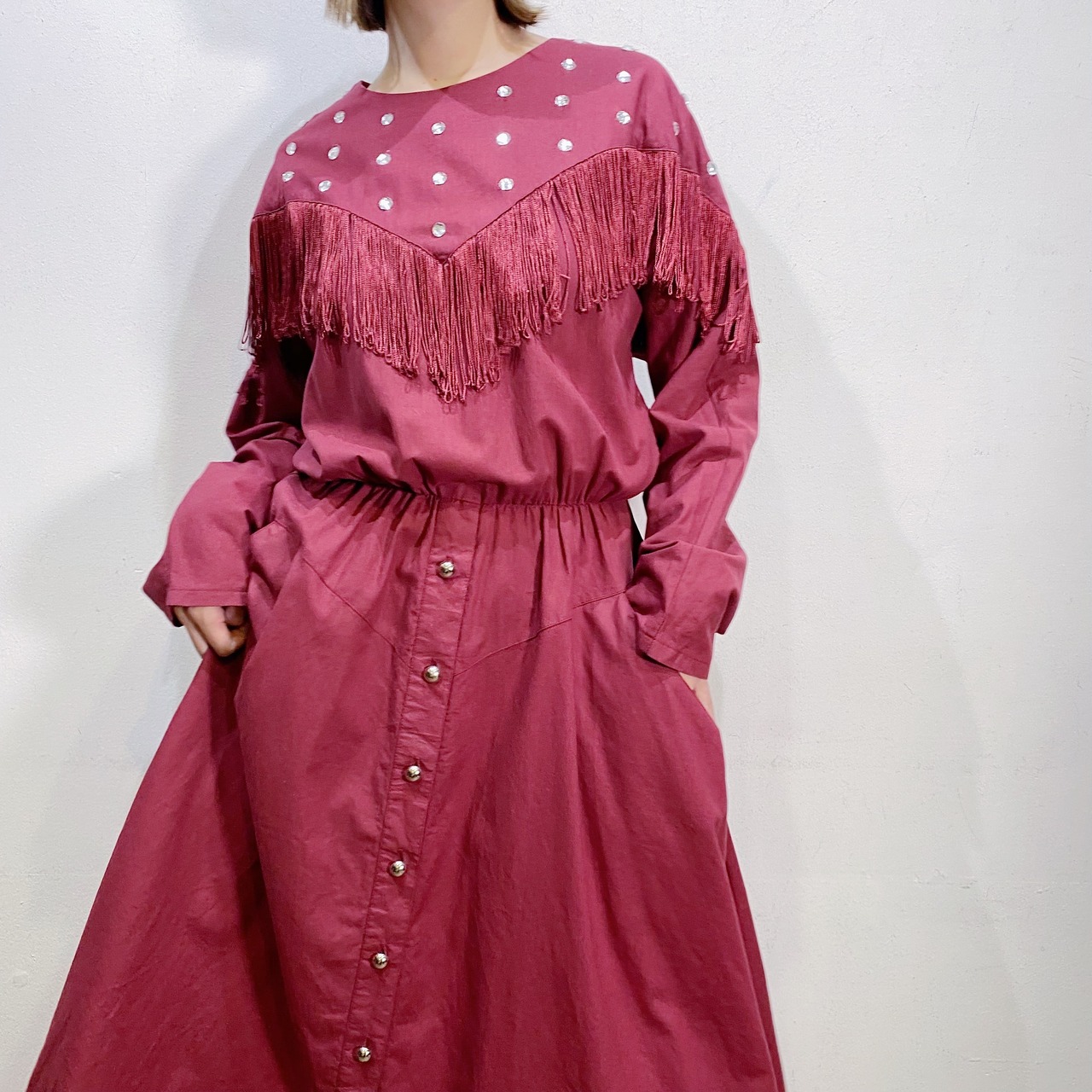 程よく揺れるフリンジとビジューのデザインが可愛い、80年代のロングワンピースです。