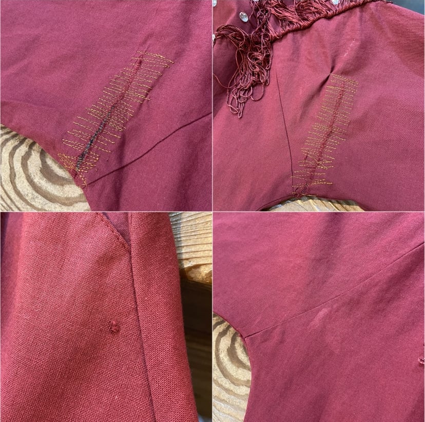 うっすらとした色飛び跡が数か所・ポケット下に小傷・首裏にダメージを接着芯でお直しした跡が見受けられます。