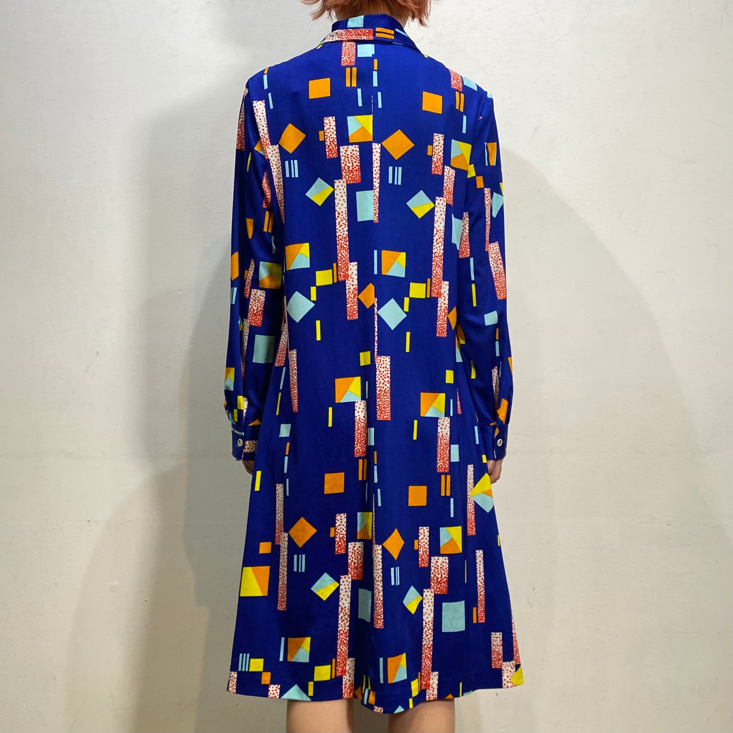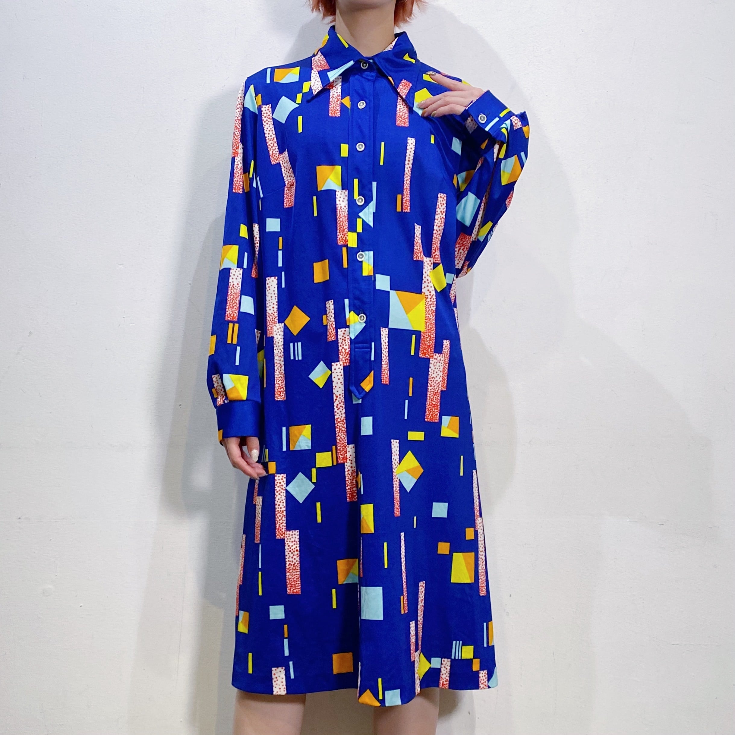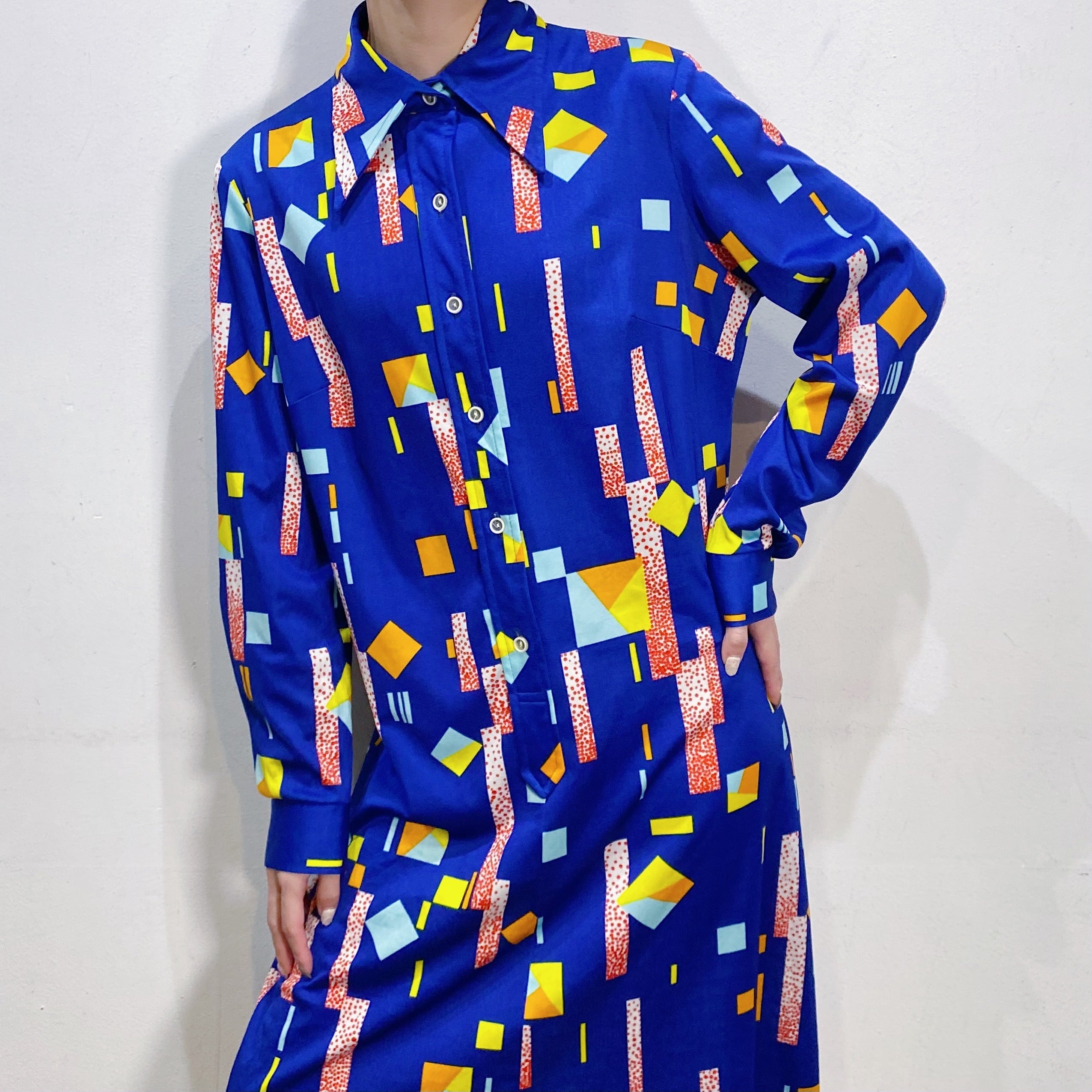 幾何学模様がユニークな70年代のシャツワンピースです。