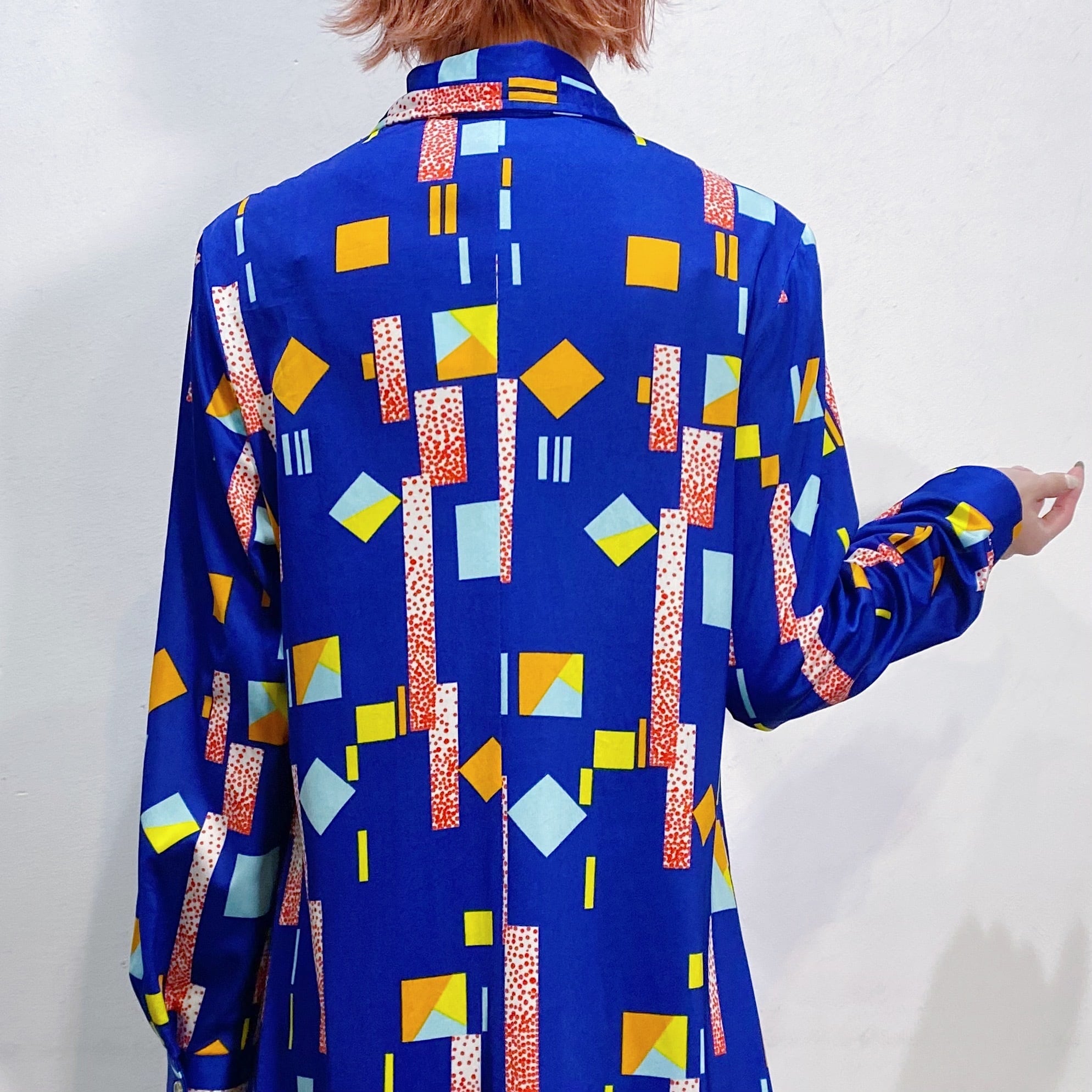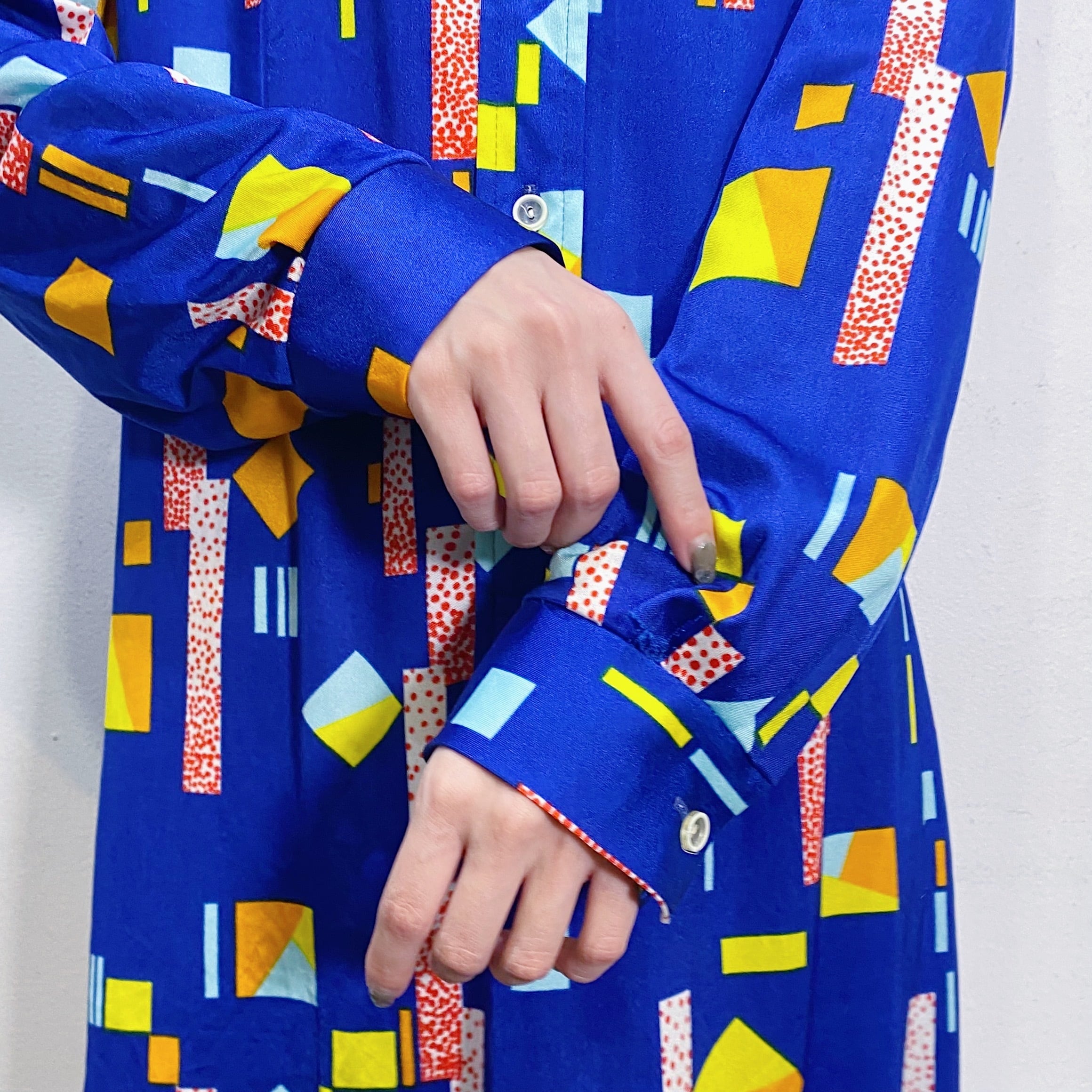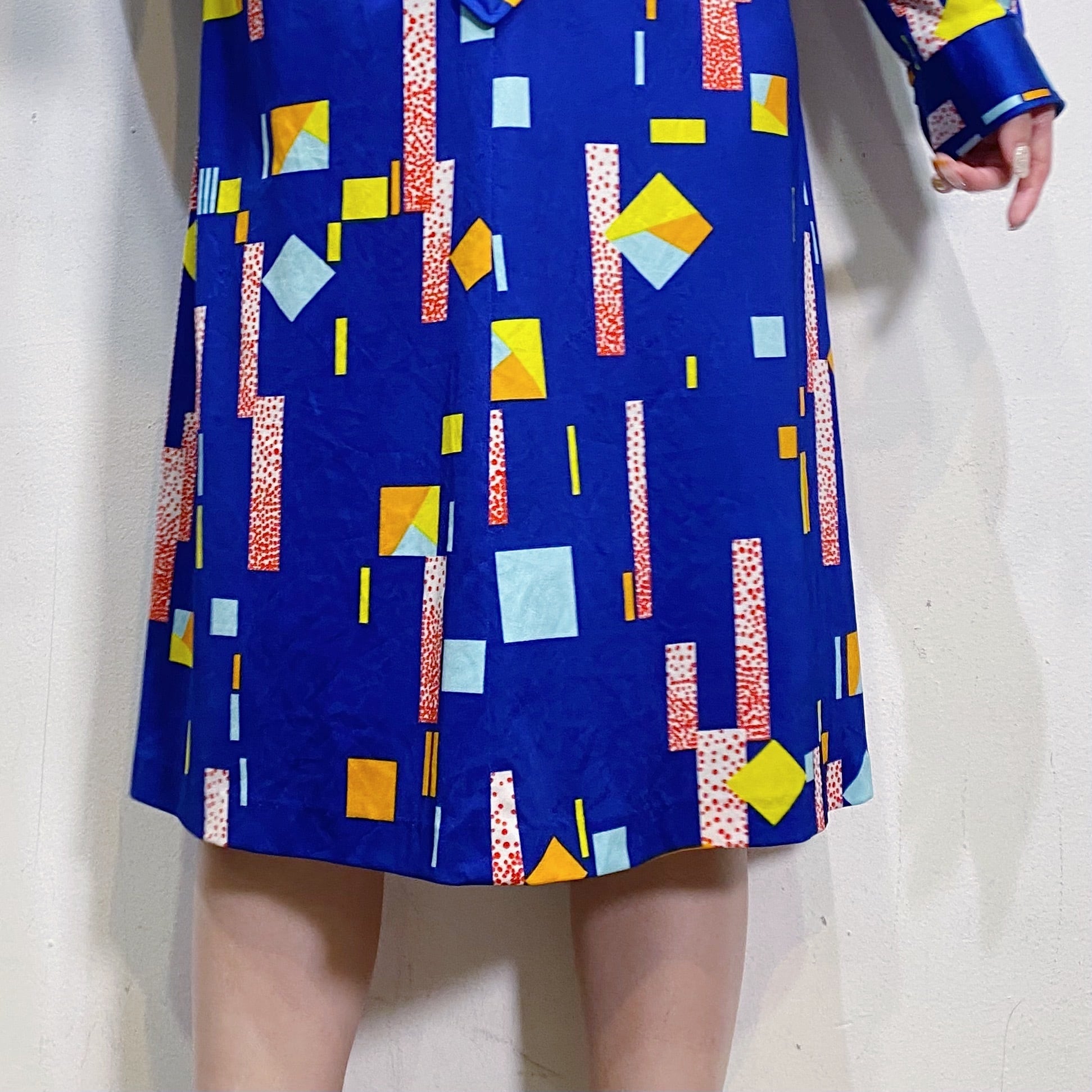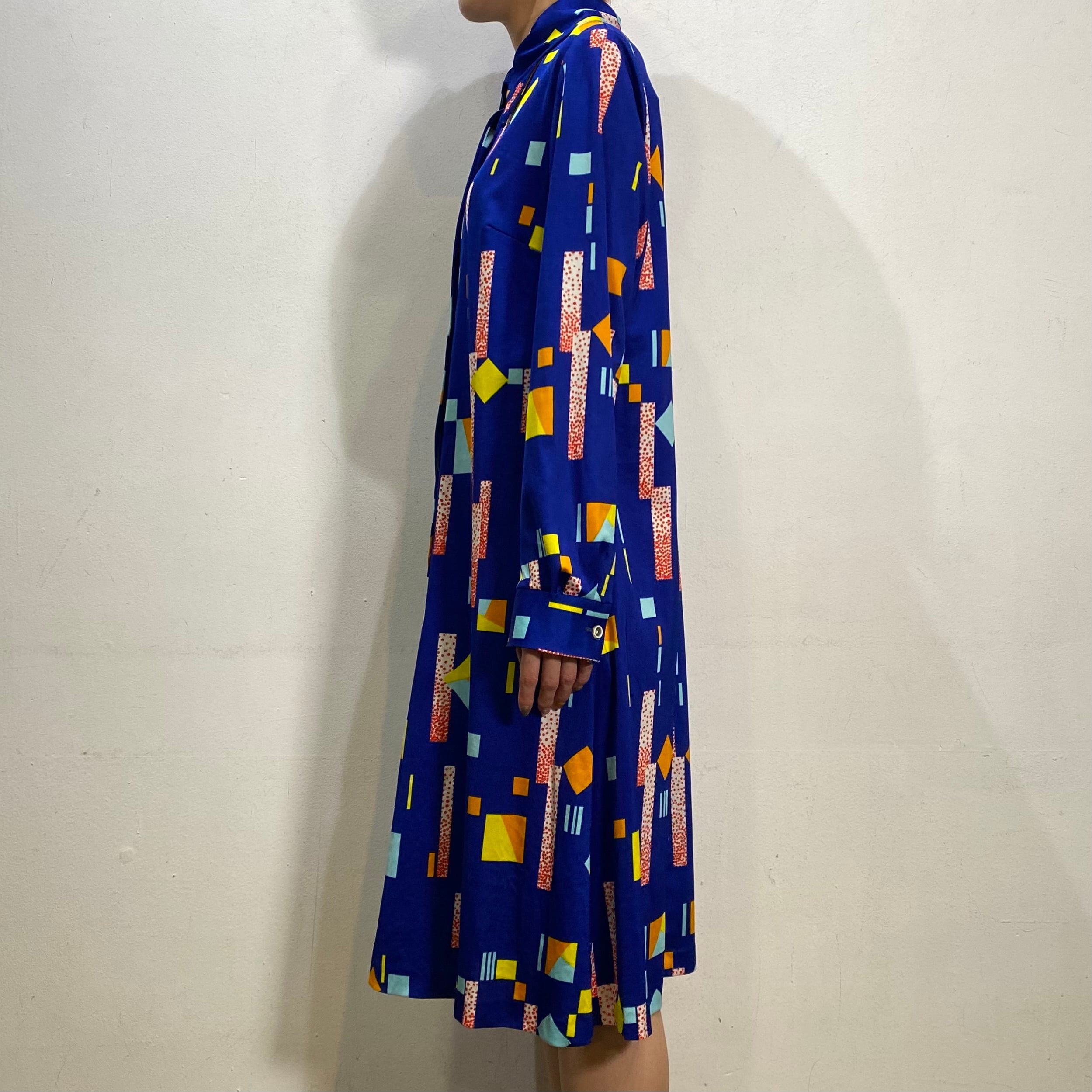 幾何学模様がユニークな70年代のシャツワンピースです。