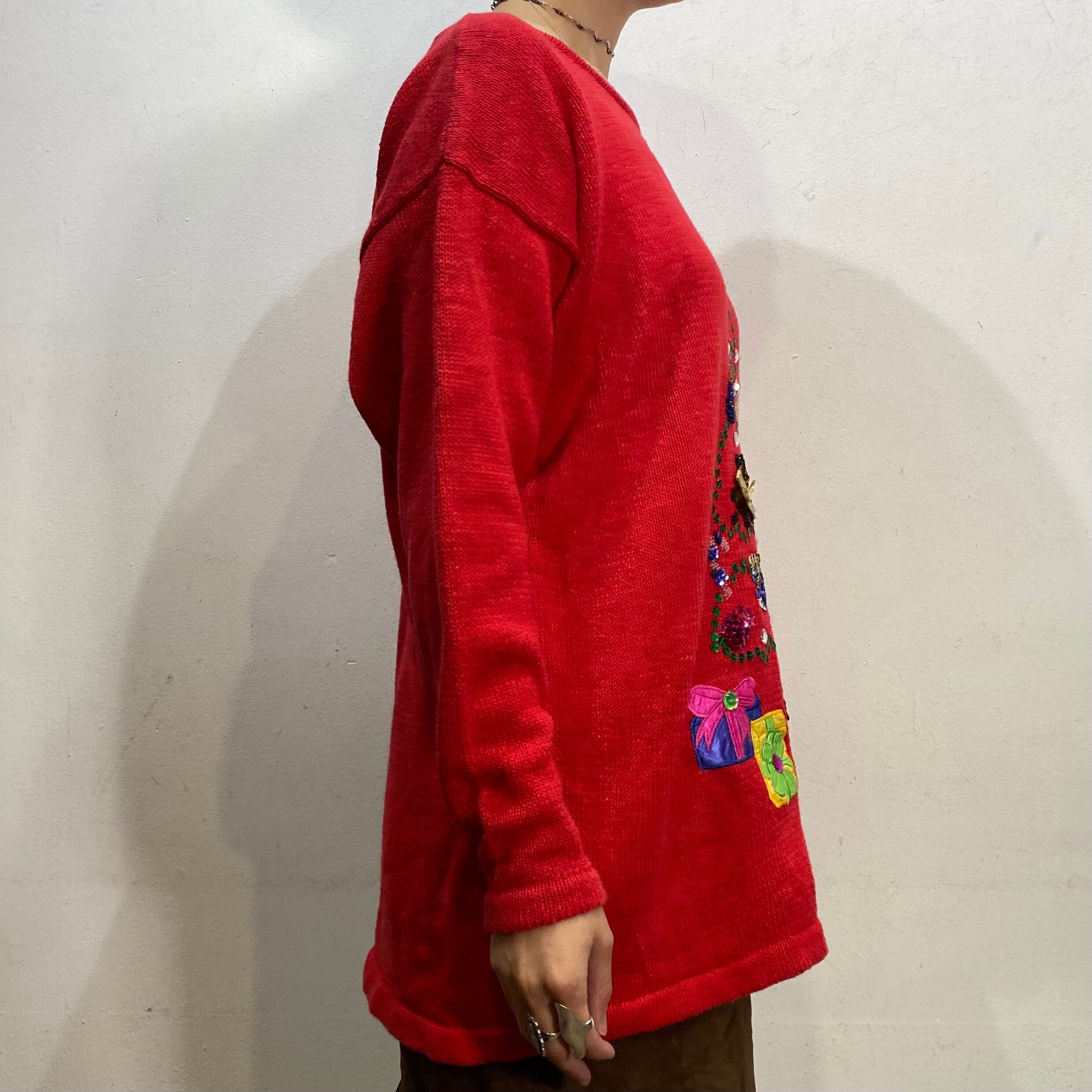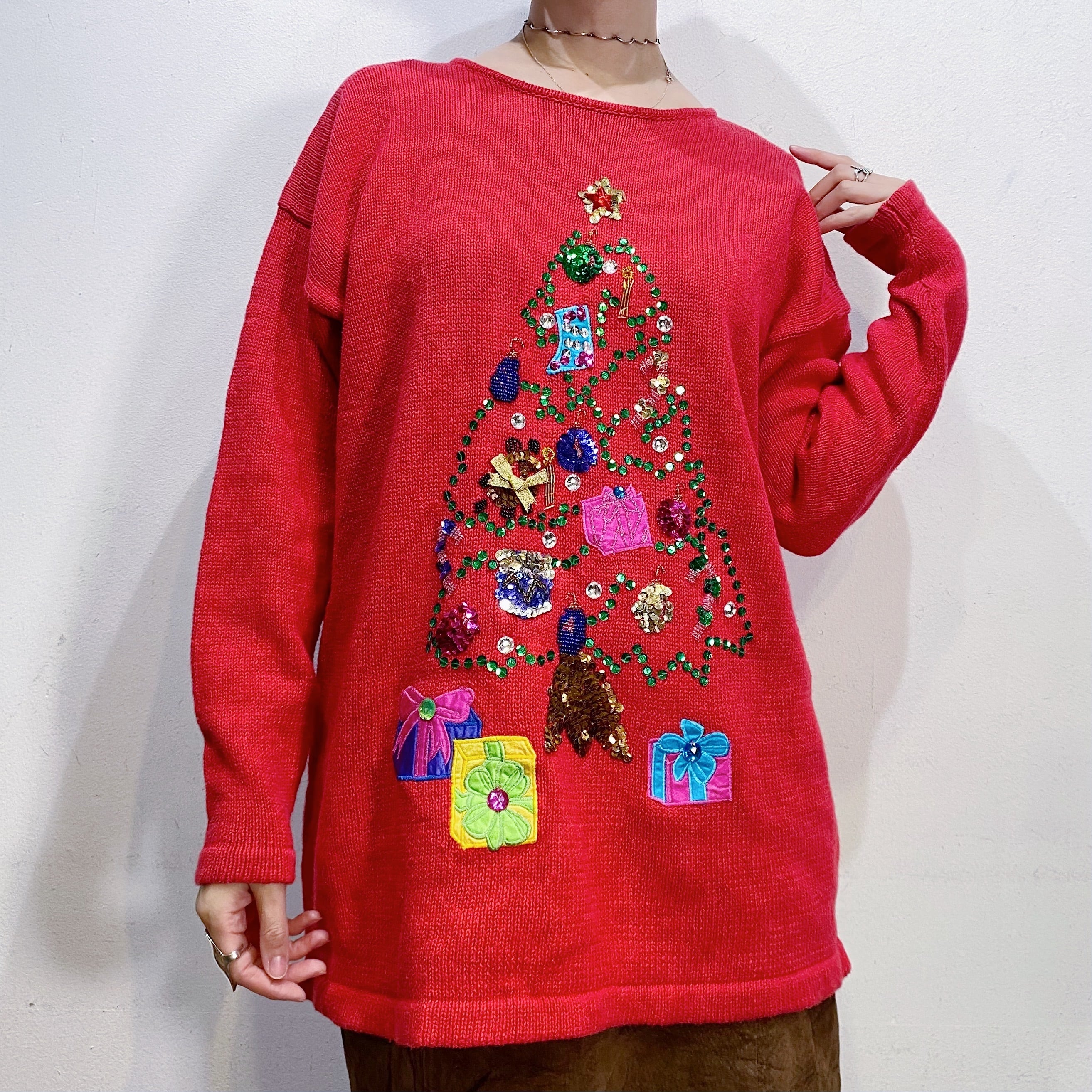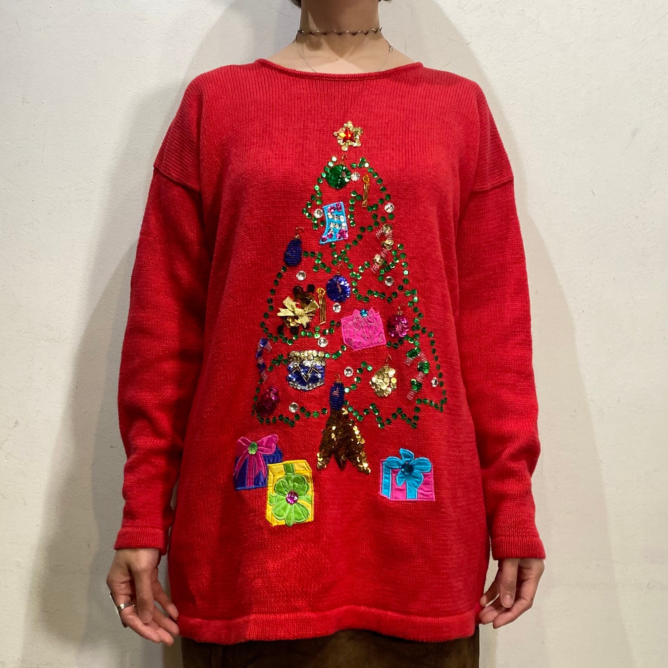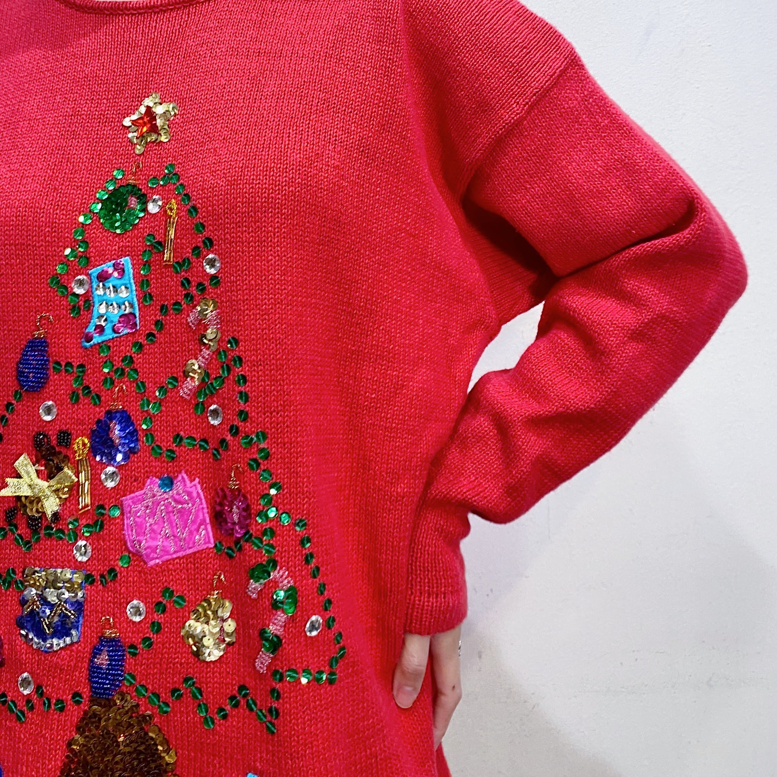 スパンコールやラインストーンでツリーを表現した可愛いクリスマスニットです。