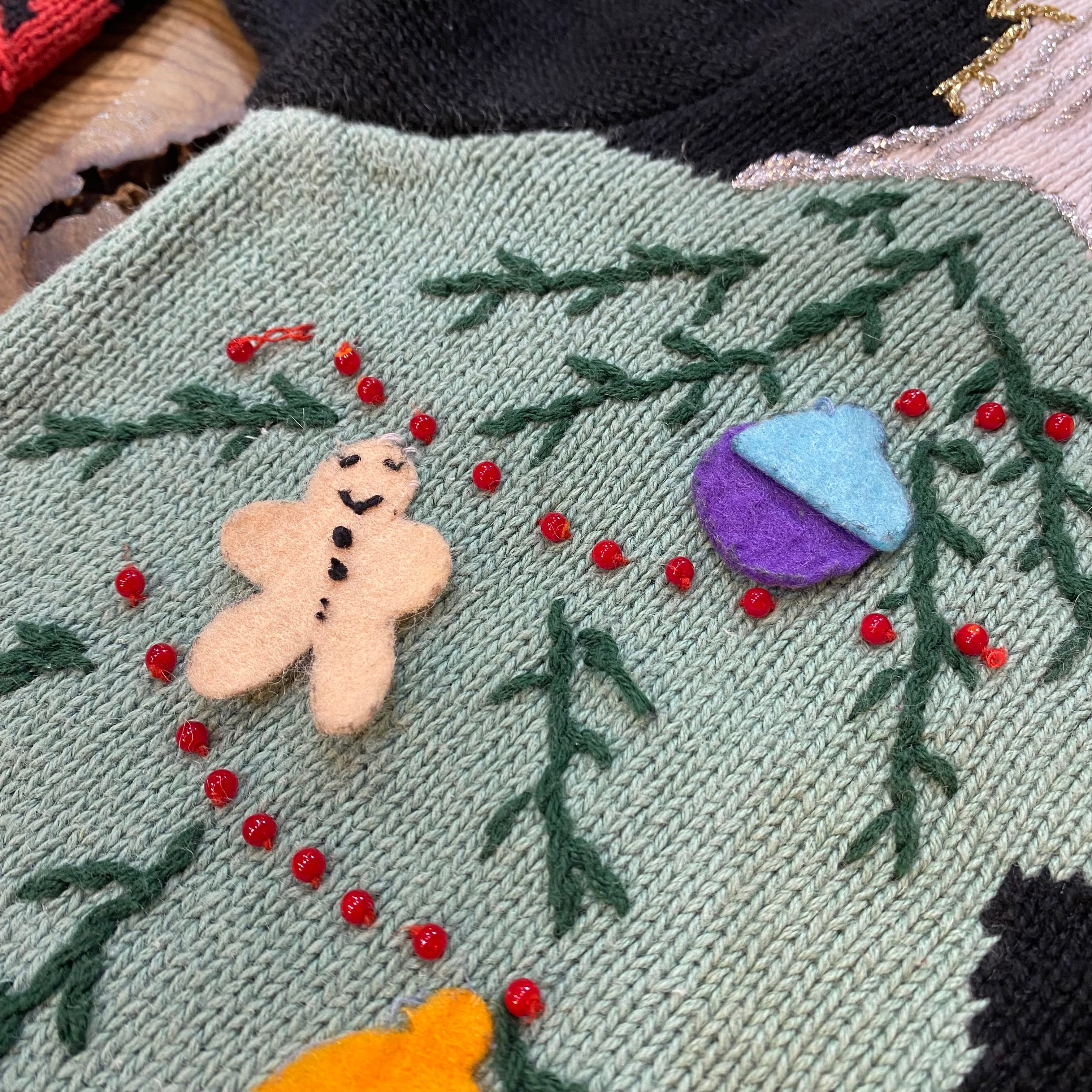 ビーズの取れかかっている箇所やフェルトの毛羽立ち、うっすらとしたシミも見受けられますが、いずれもあまり気にならない程度かと思われます。