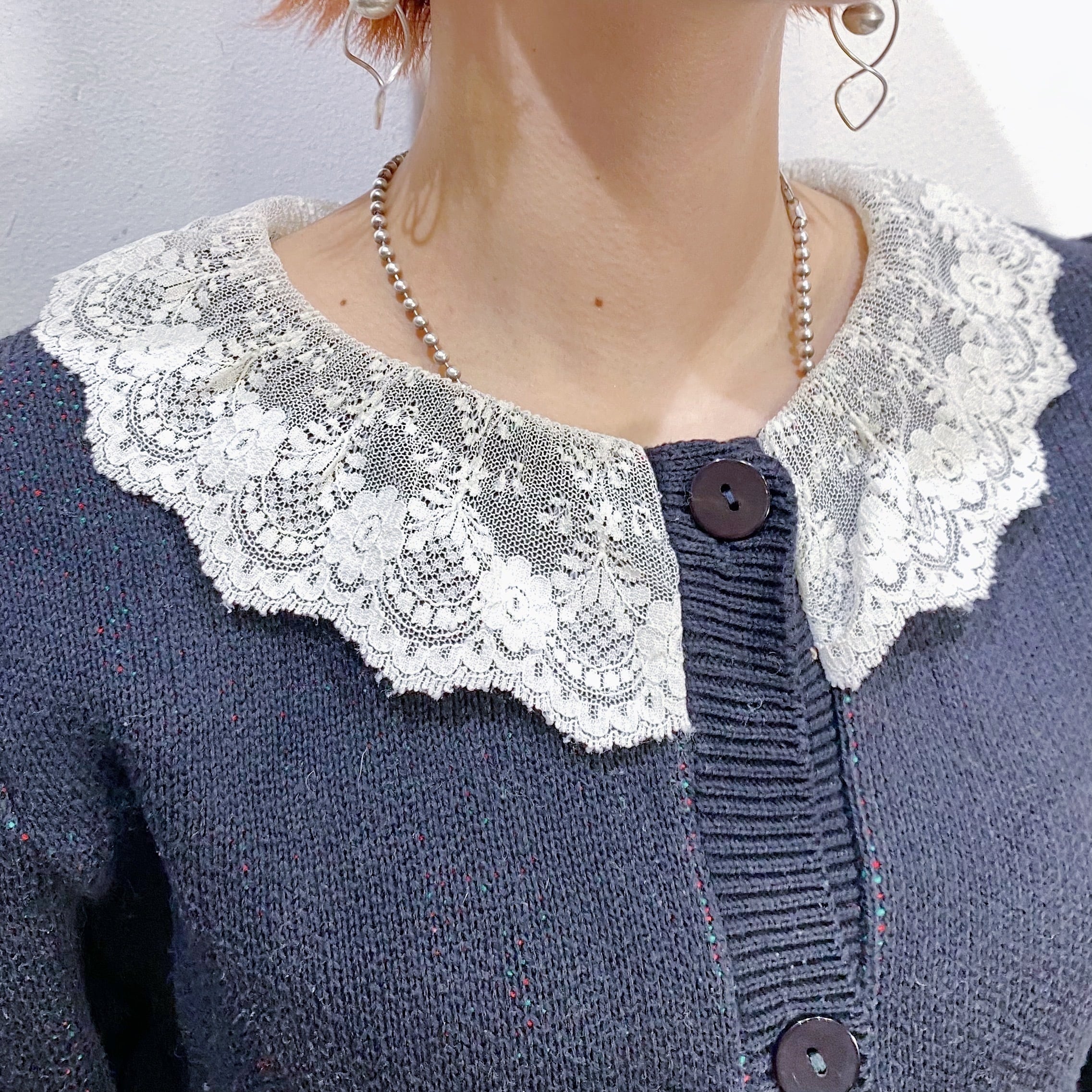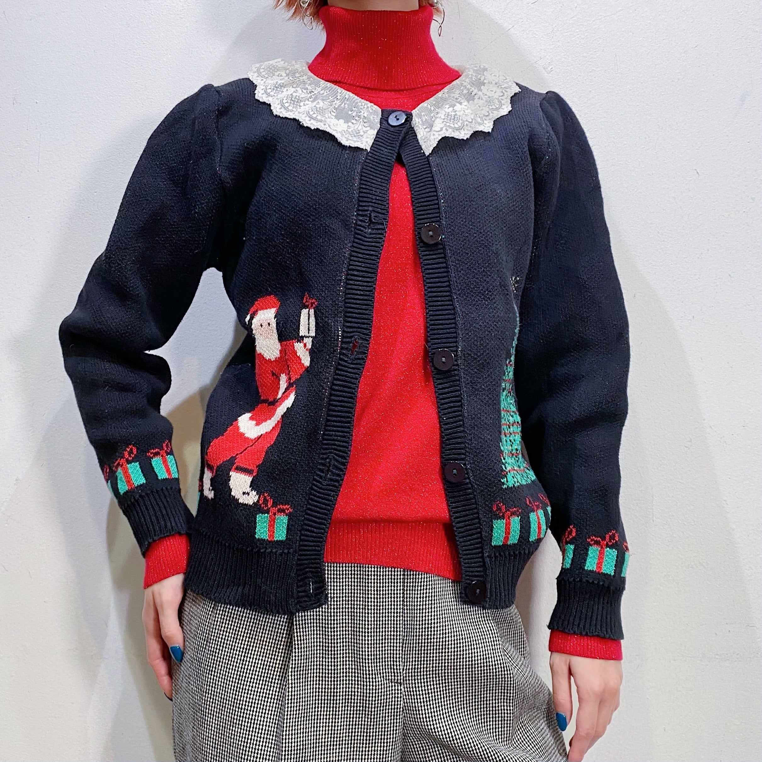 黒字に白いレースの襟がついた、少し珍しいタイプのクリスマスニットです、