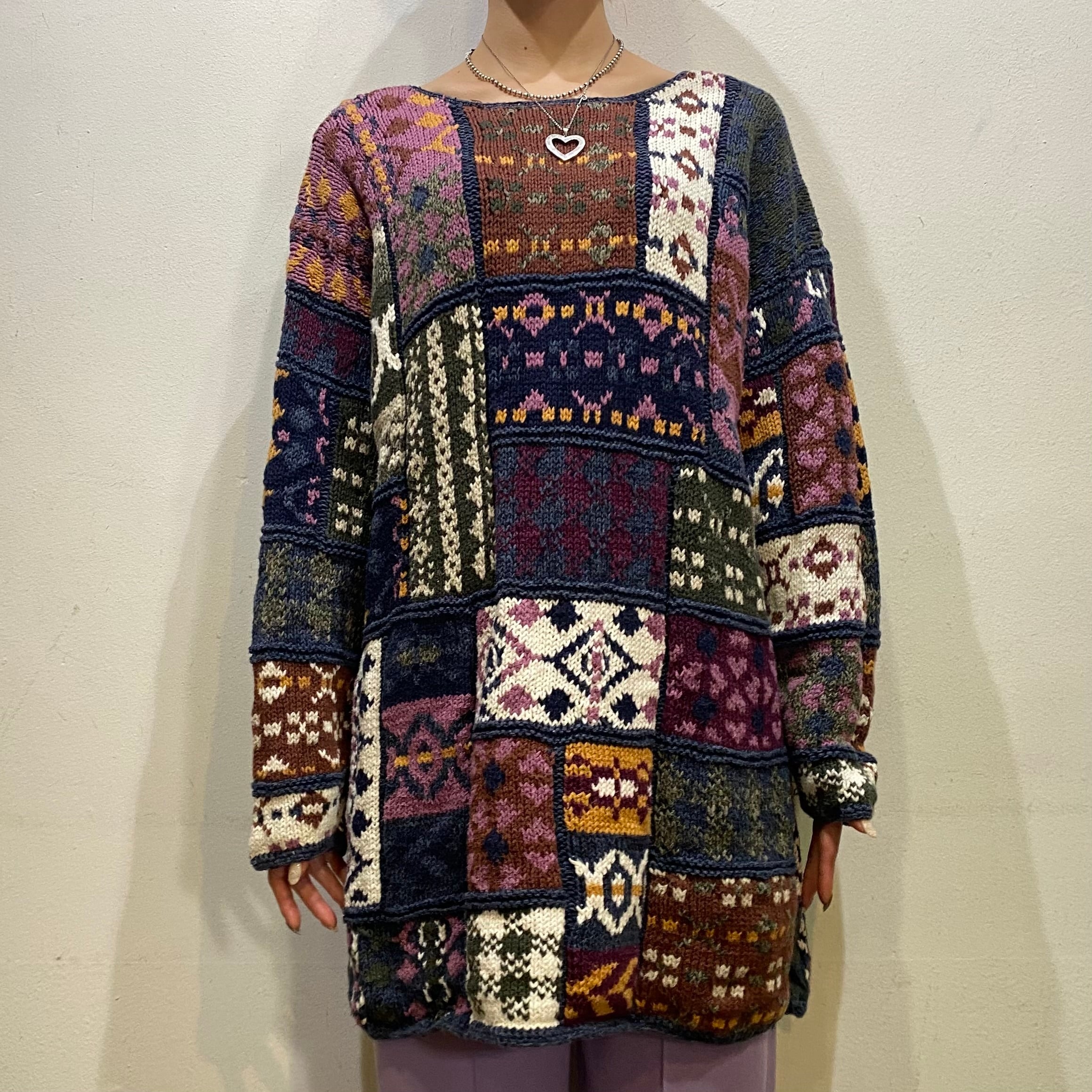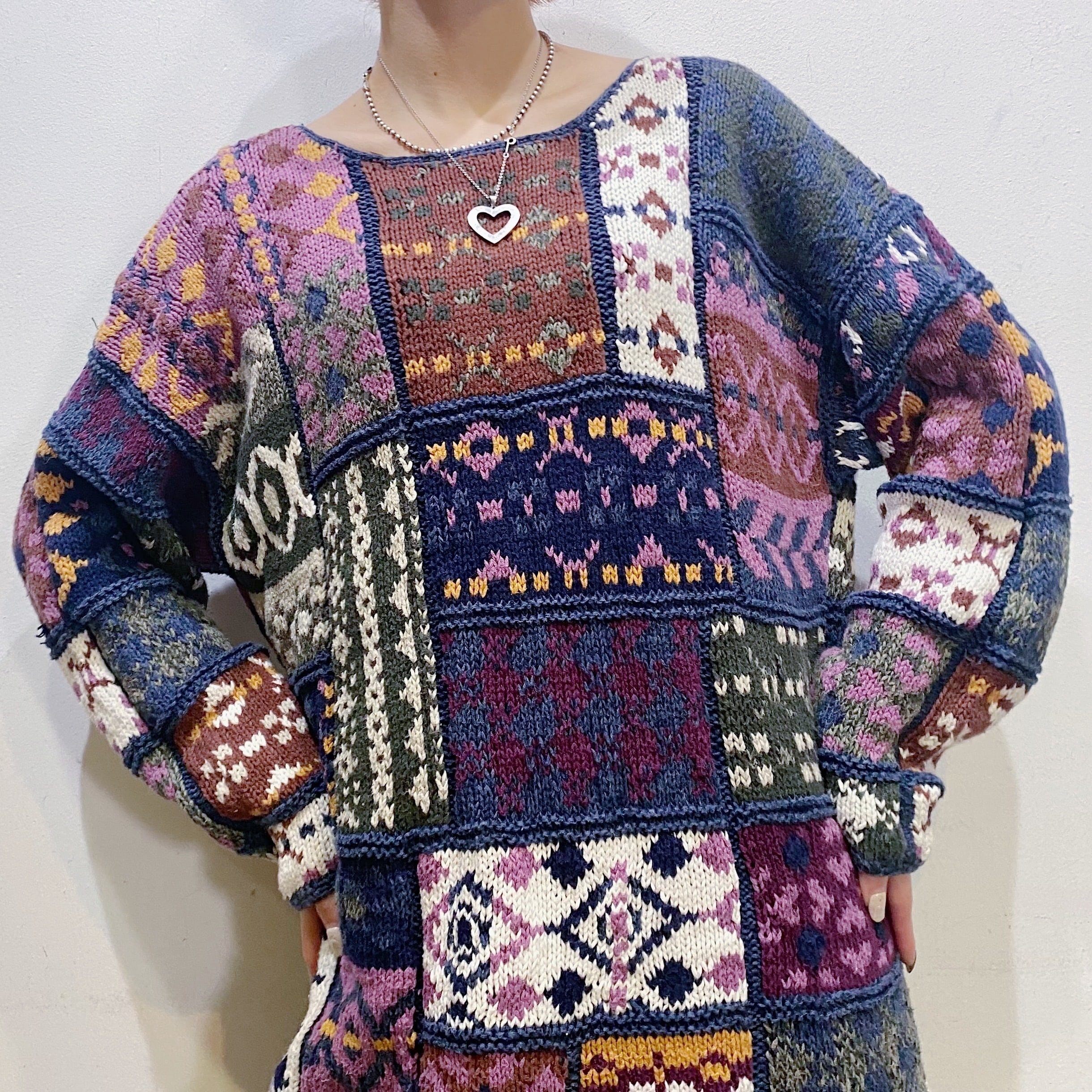色々な編み模様を繋ぎ合わせたパッチワークスタイルが可愛い、コットンニットセーターです。