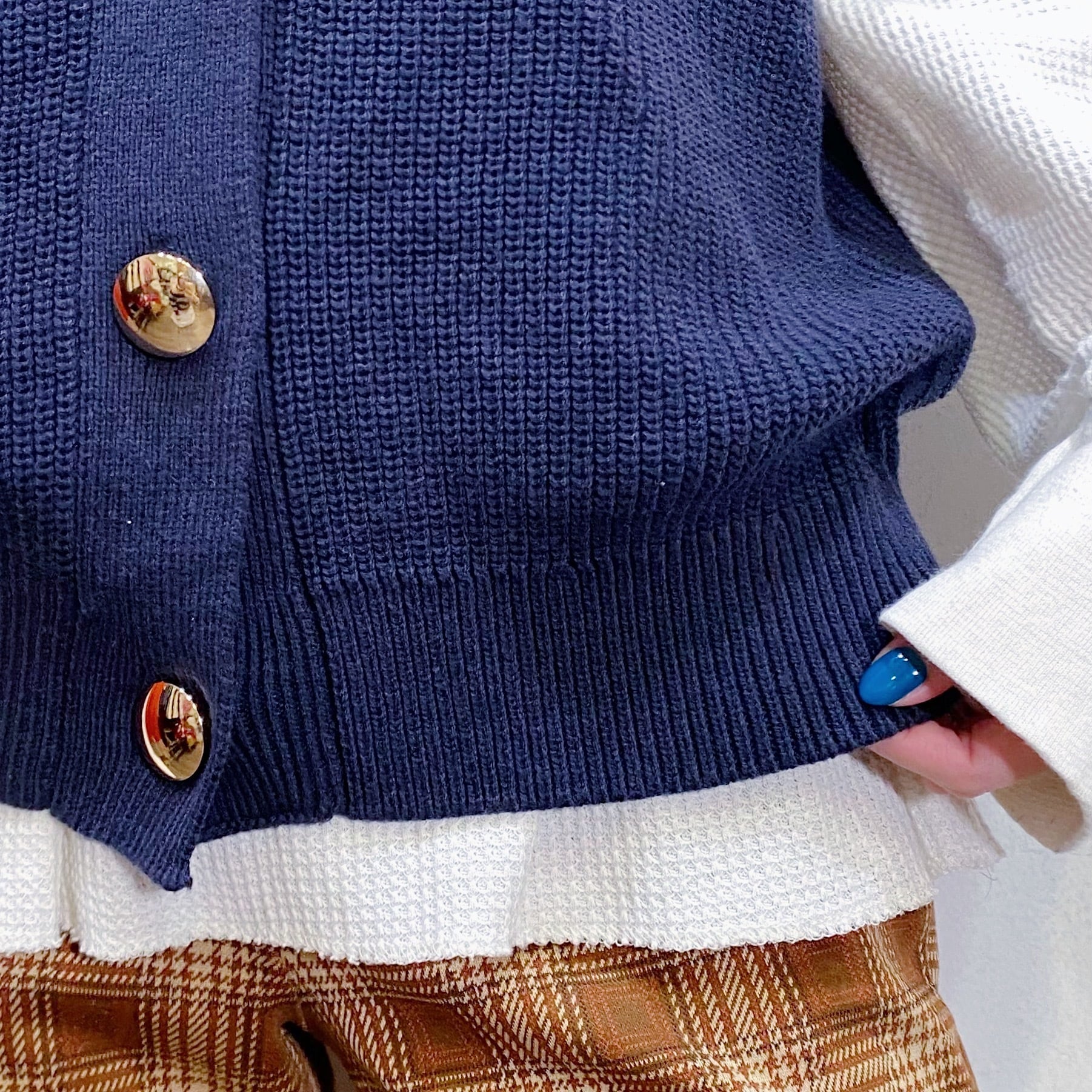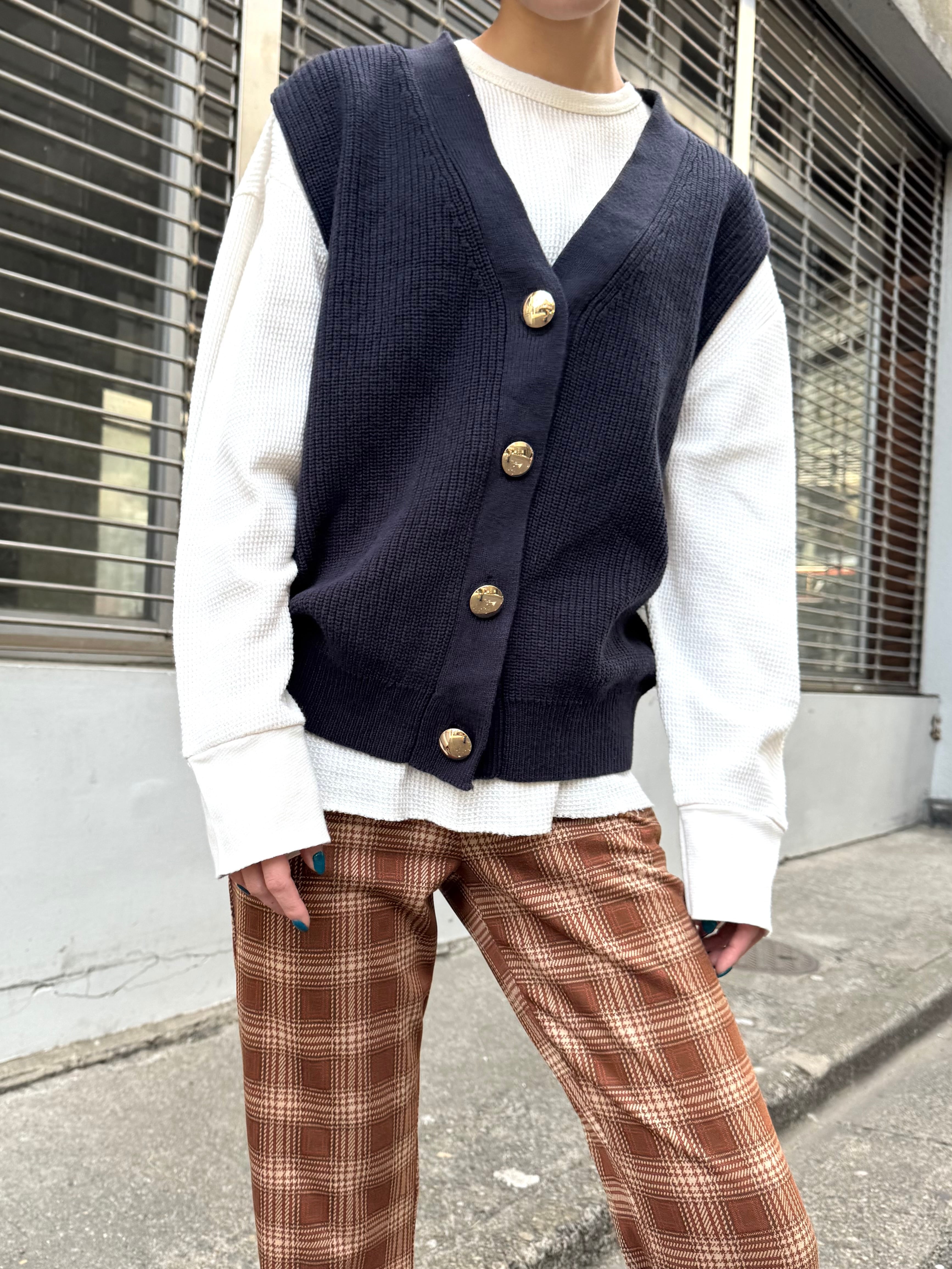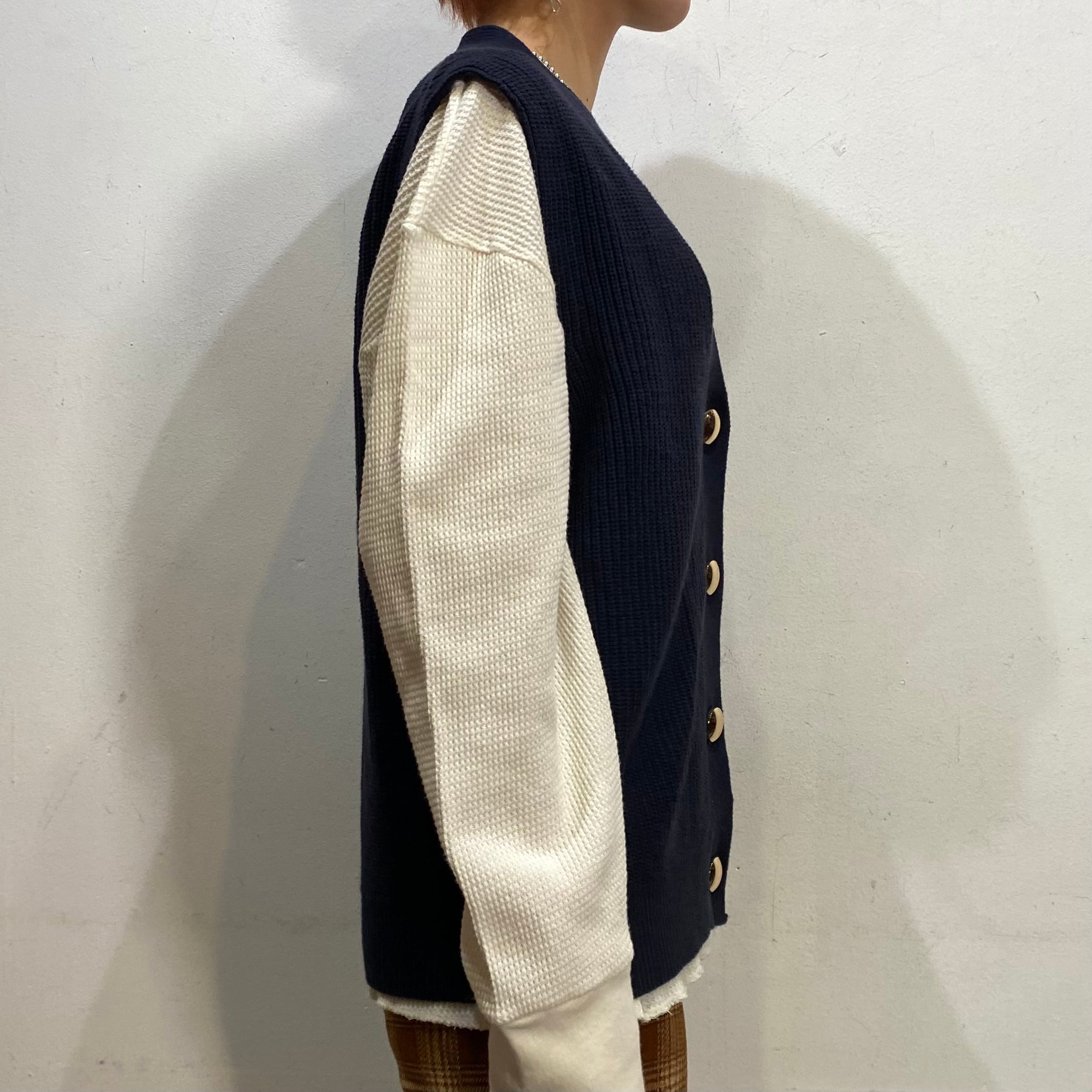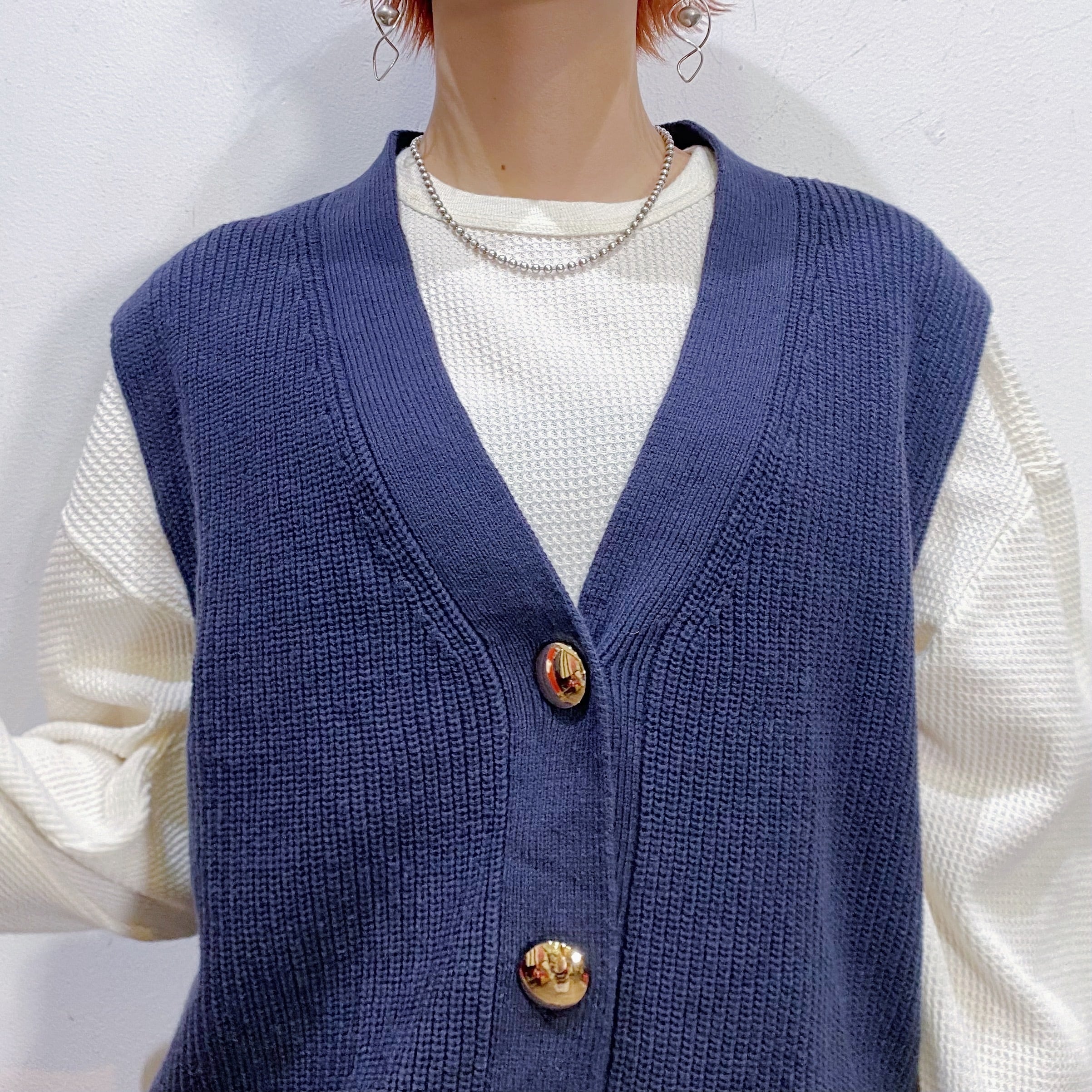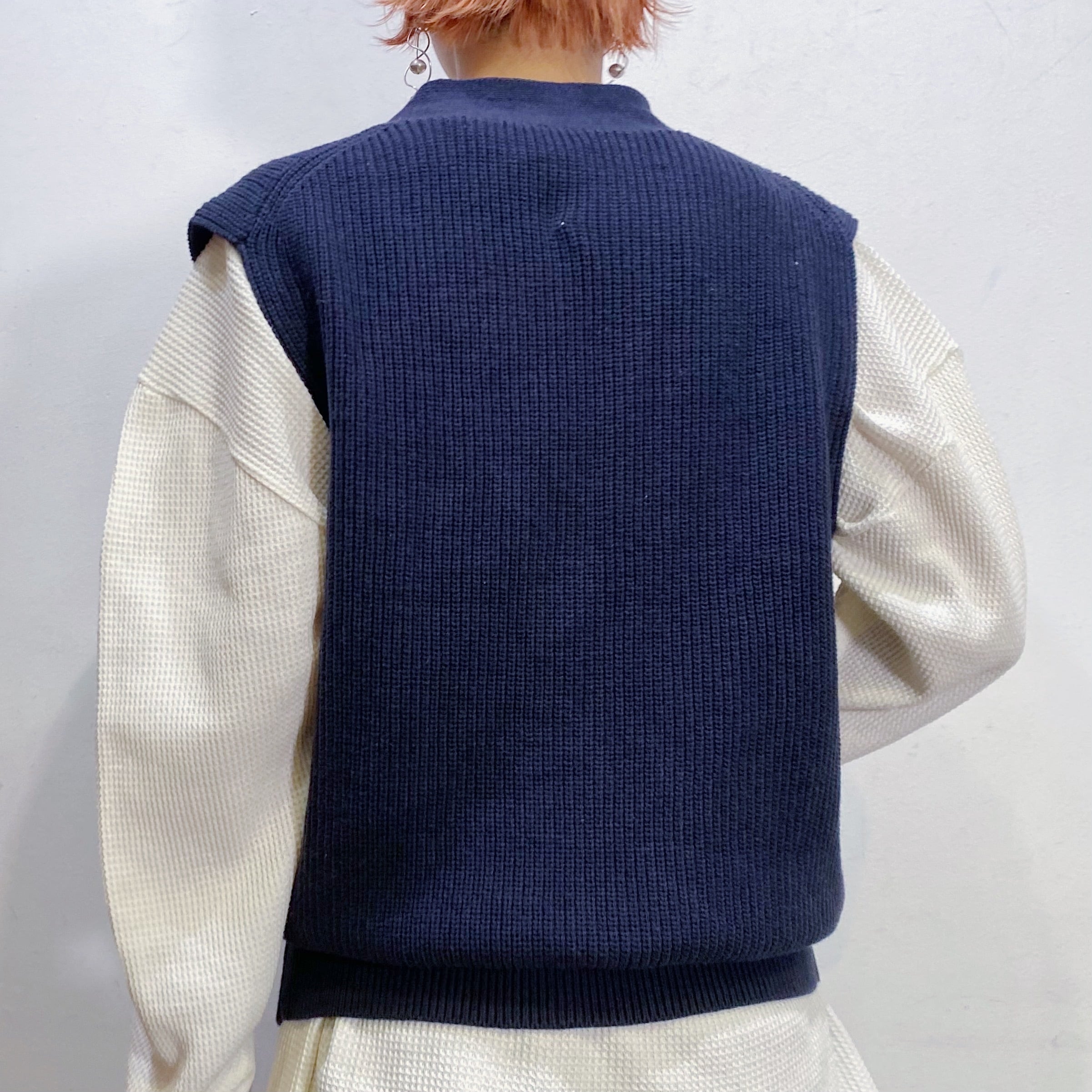 ネイビーでコーディネートに取り入れやすい、ニットベストです。