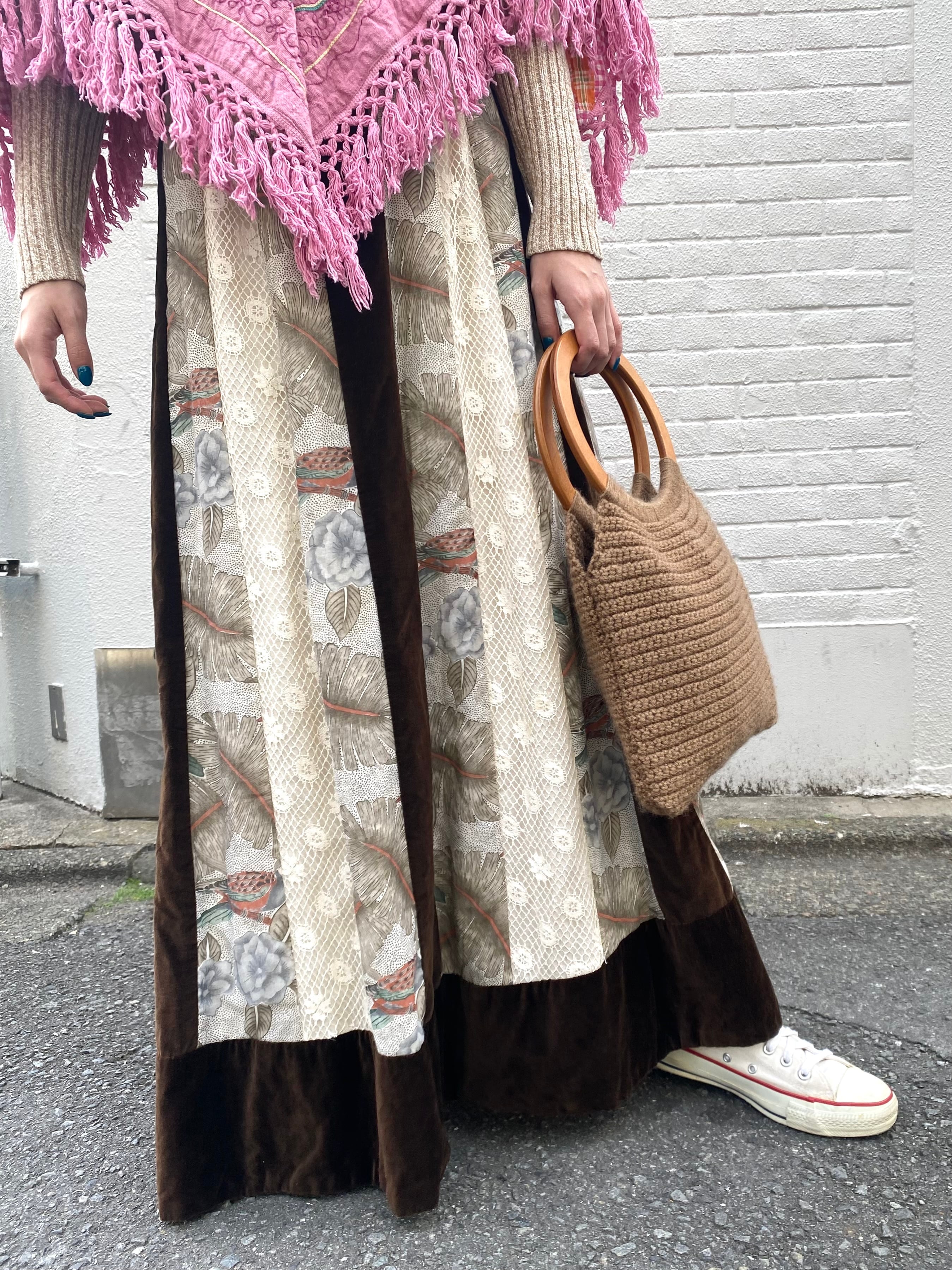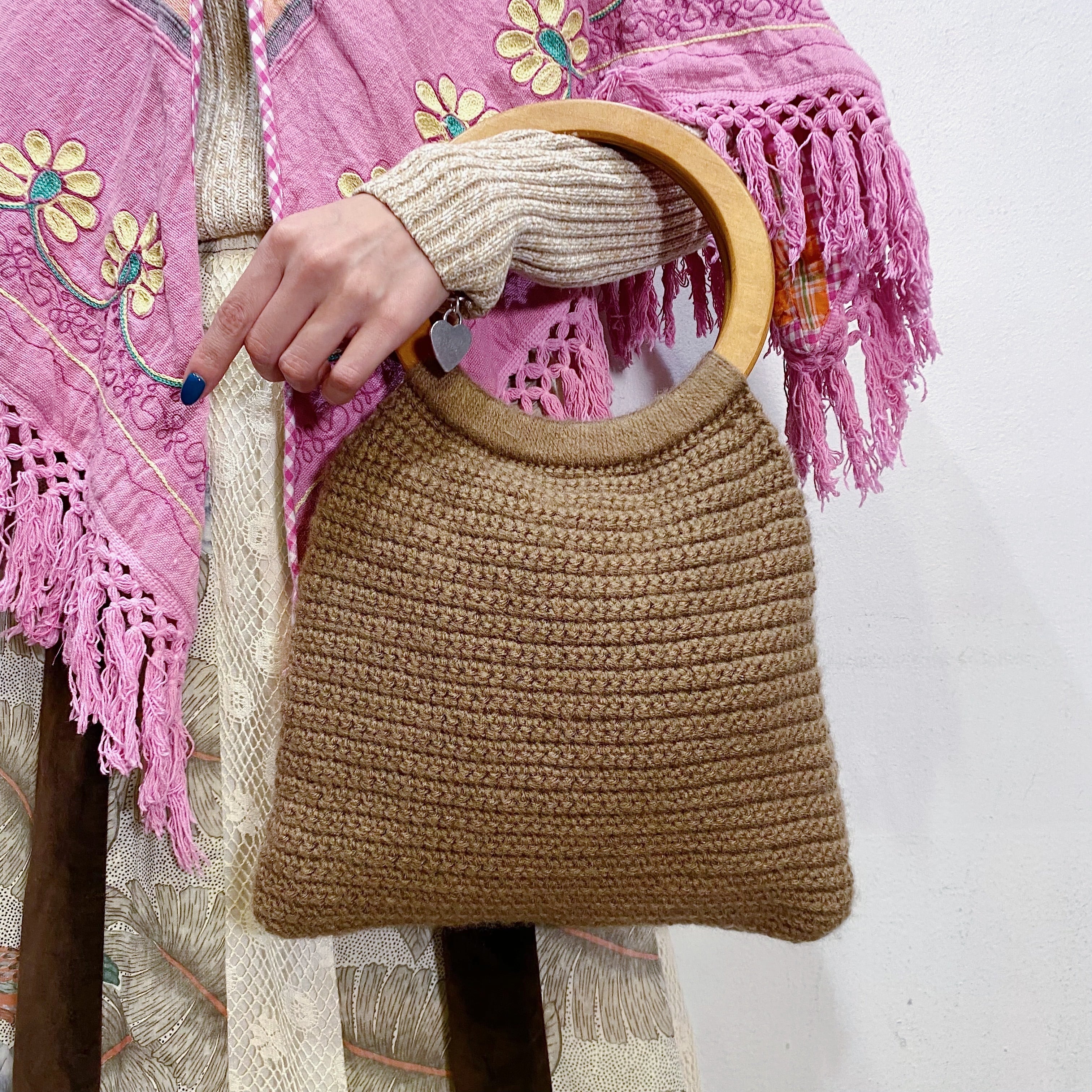丸いウッドハンドルにベージュのニットが可愛いハンドバッグです。