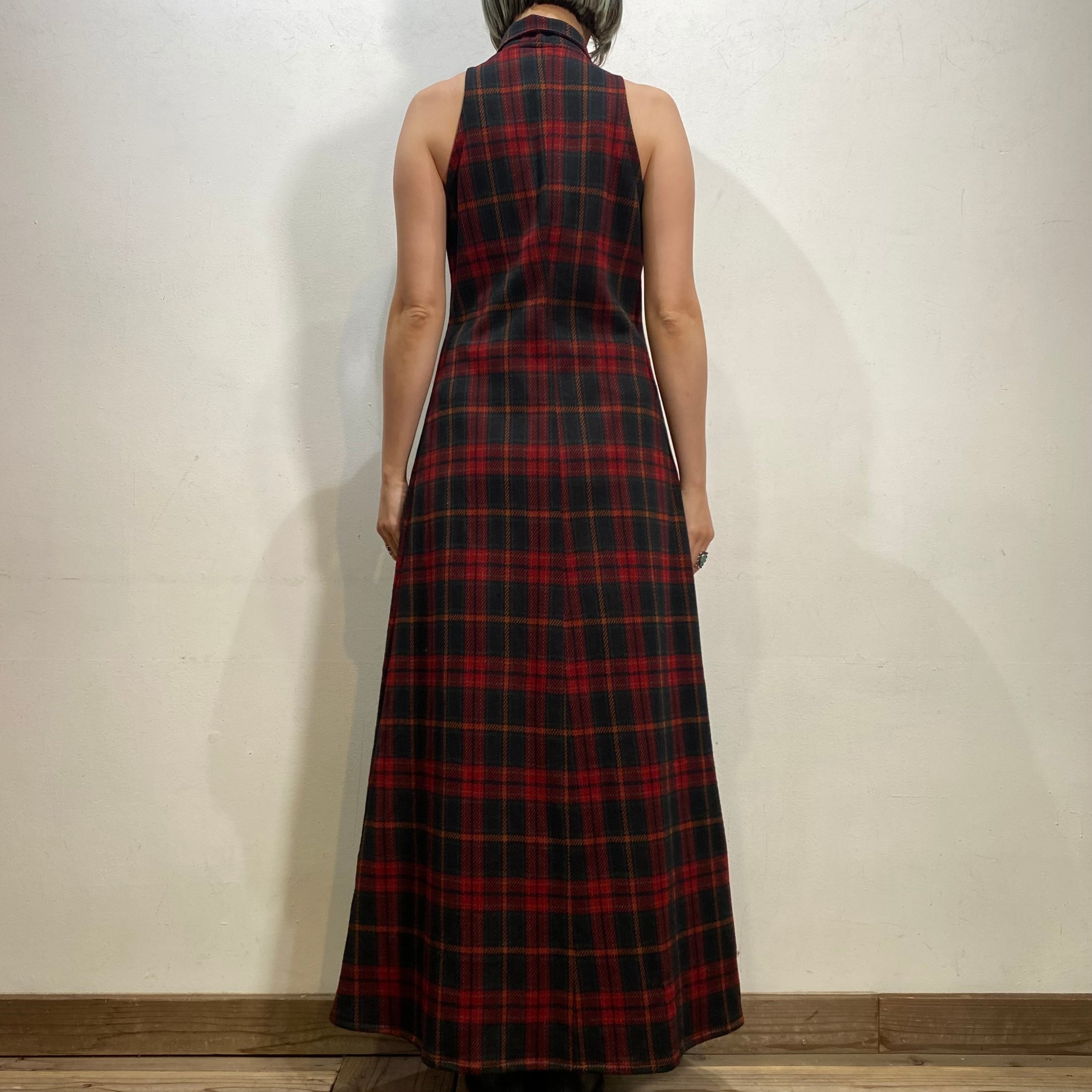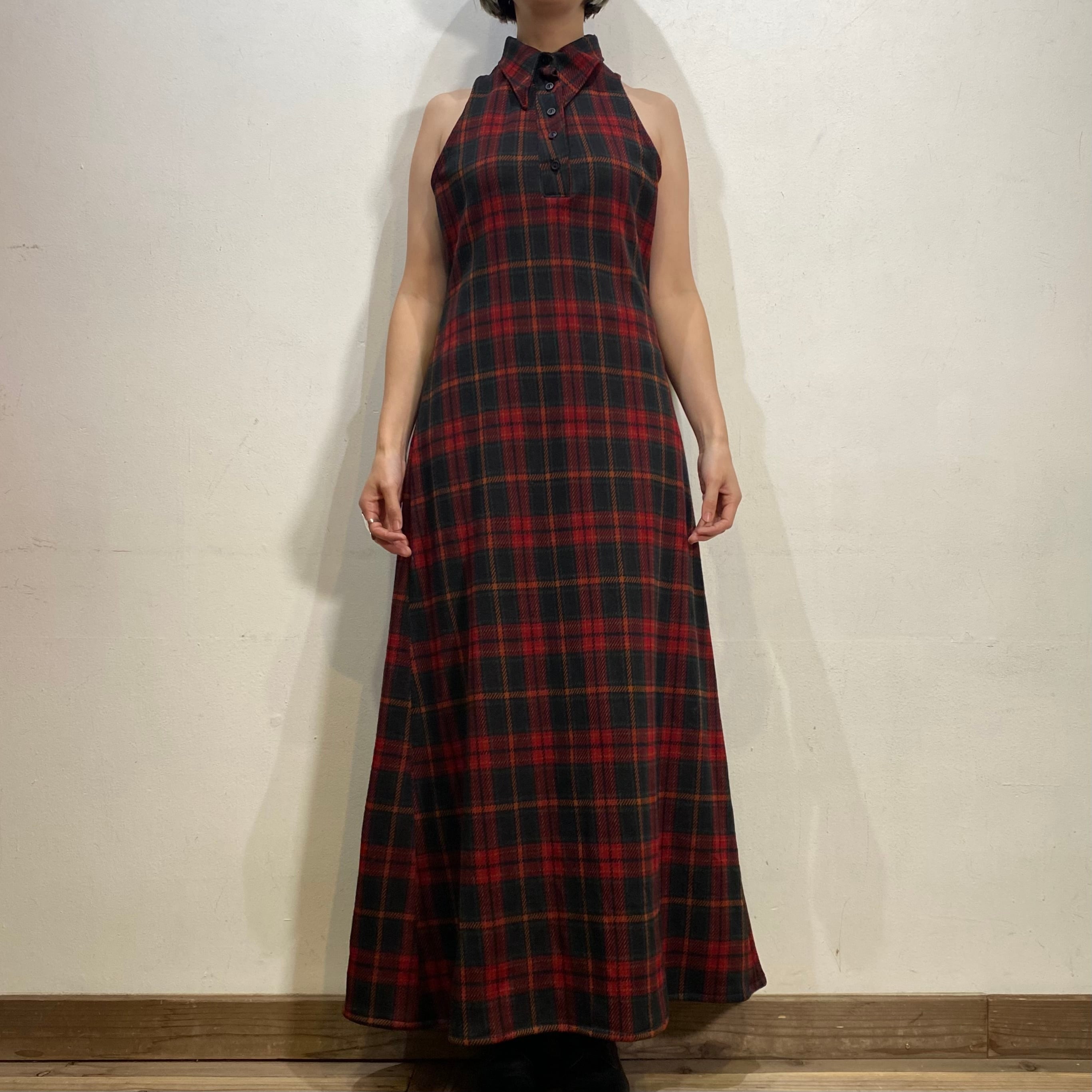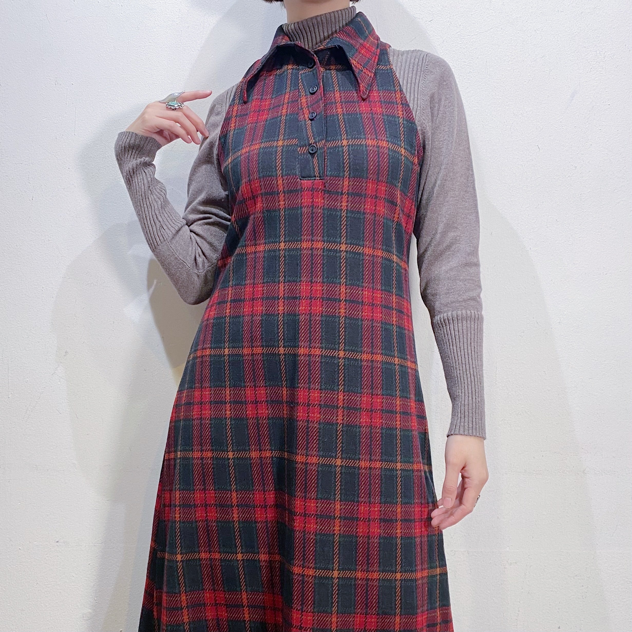 落ち着いたトーンの赤チェックで着こなしやすい、70年代のワンピースです。