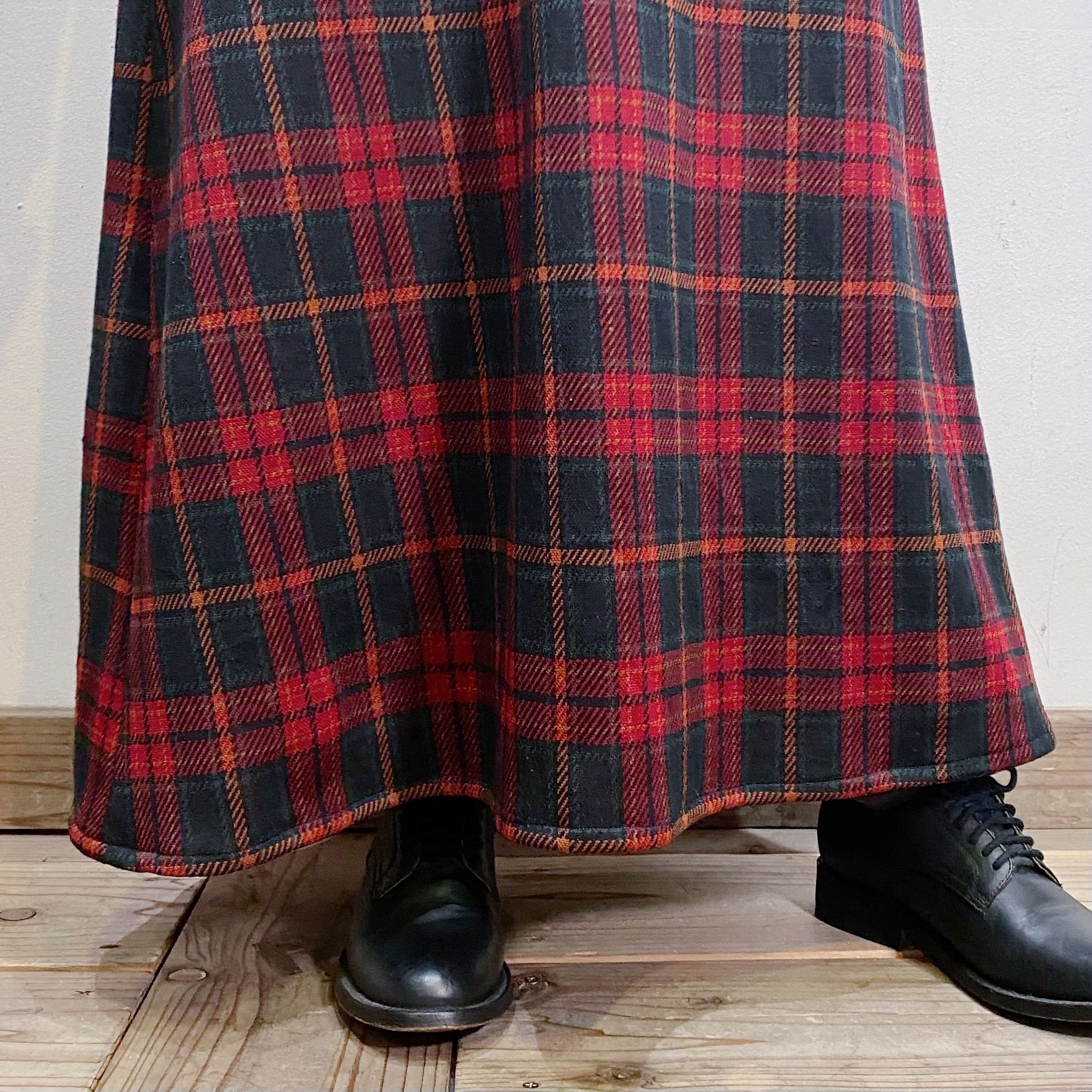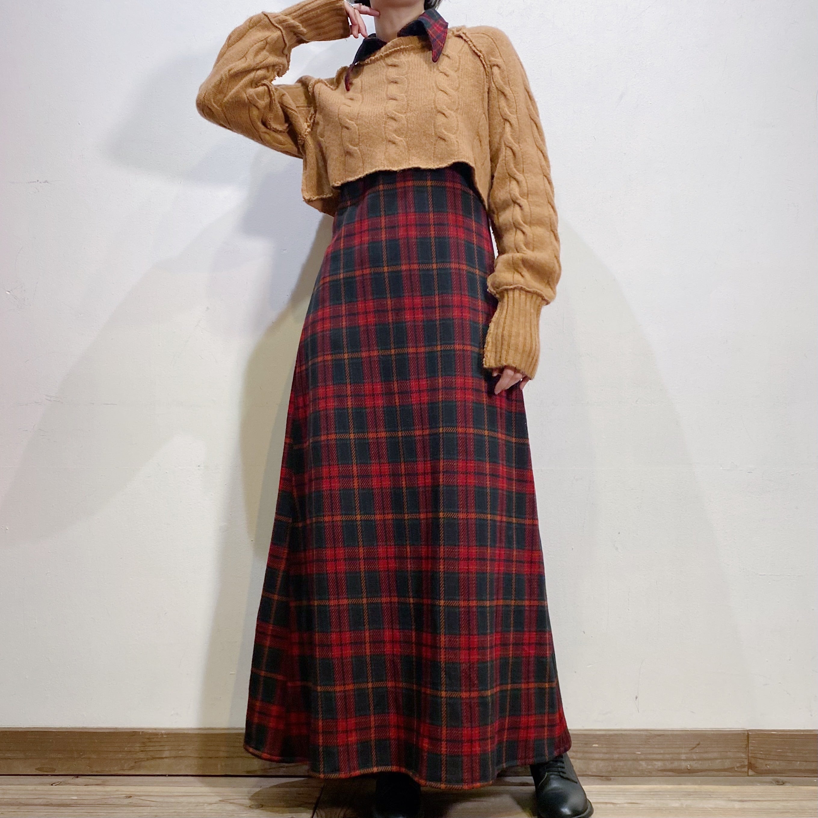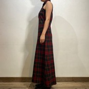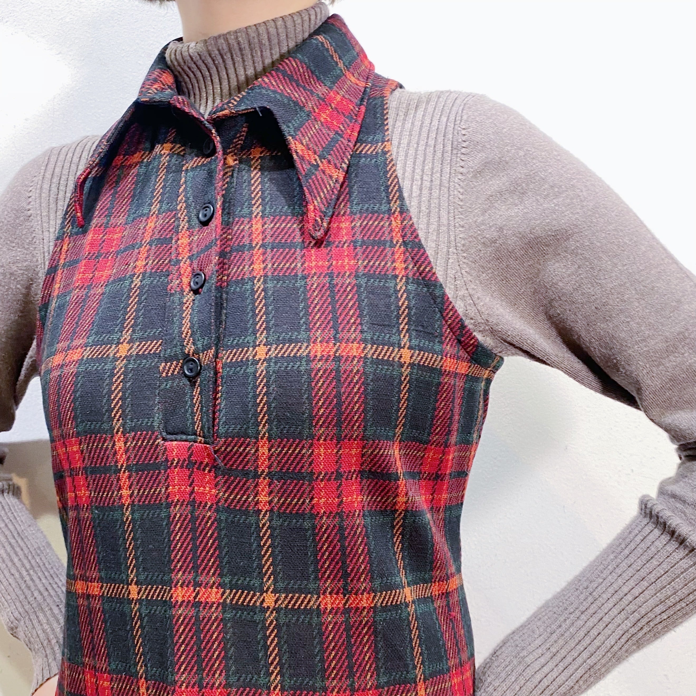 落ち着いたトーンの赤チェックで着こなしやすい、70年代のワンピースです。