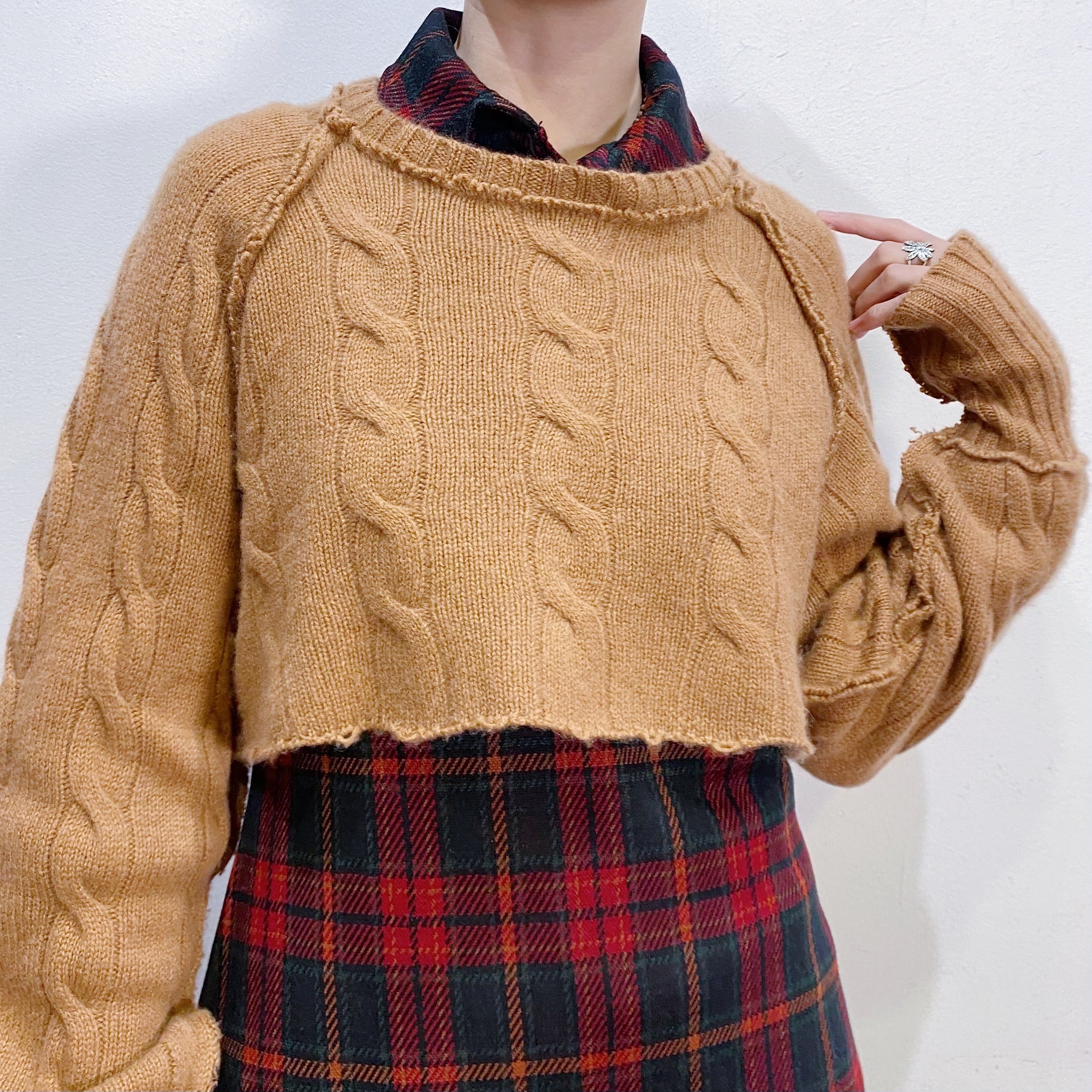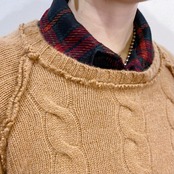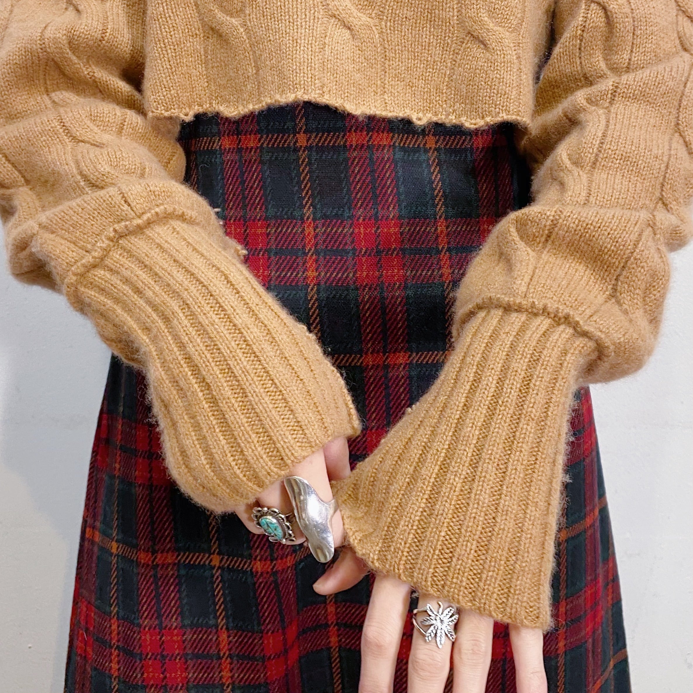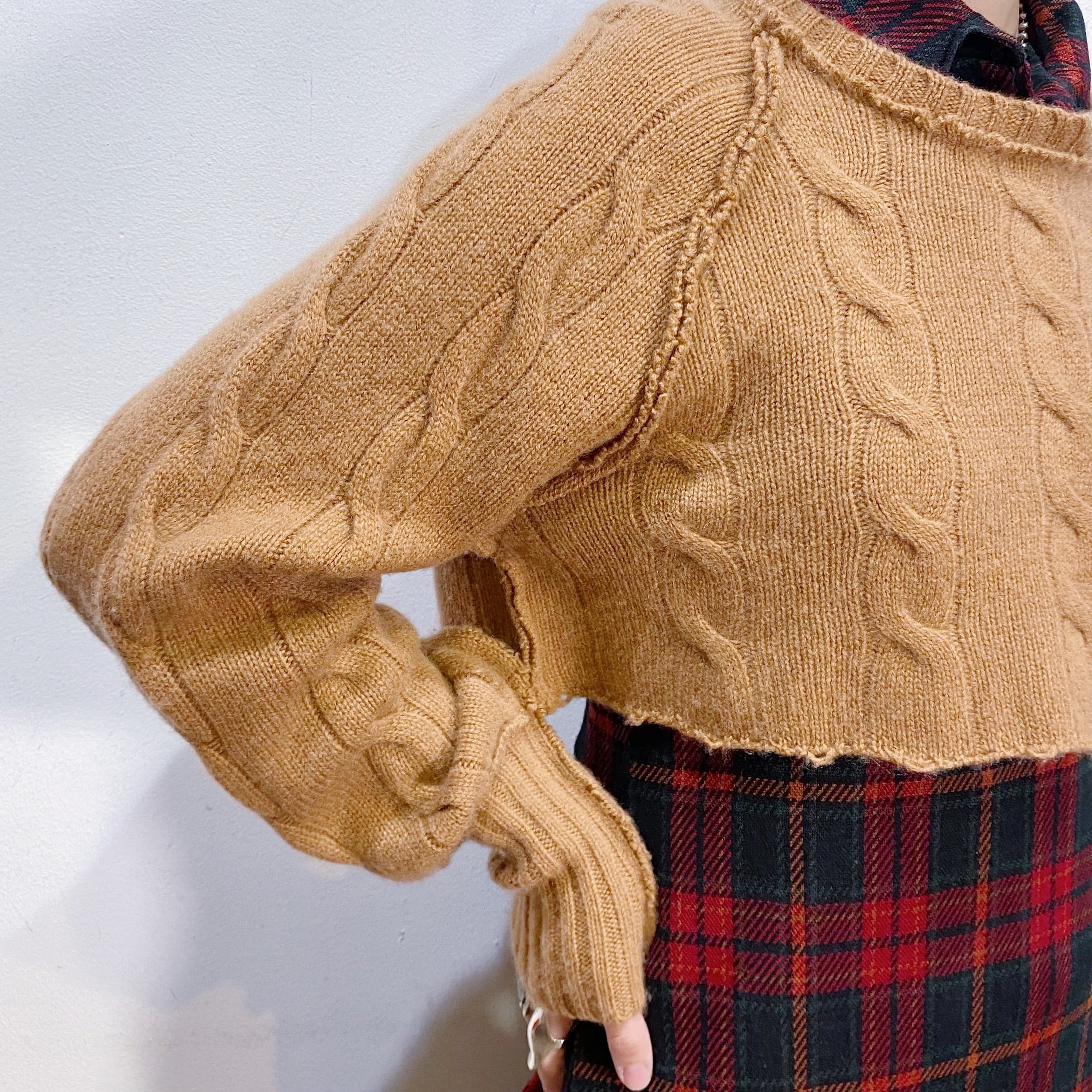全体はケーブル編みなのに袖口だけ長めのリブ、そして敢えて切りっぱなしのようなデザインがとってもキュート。
