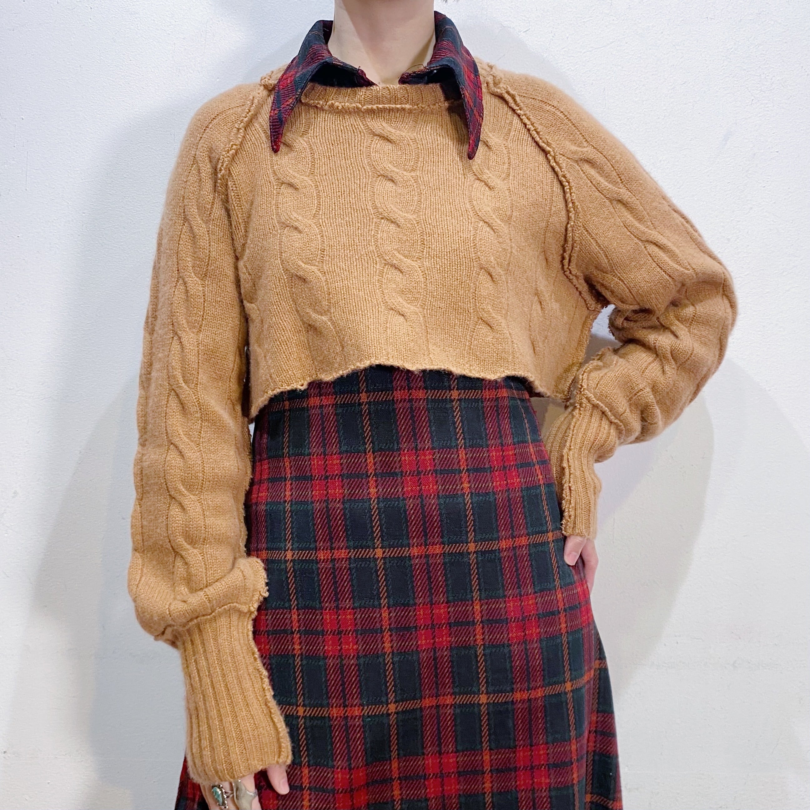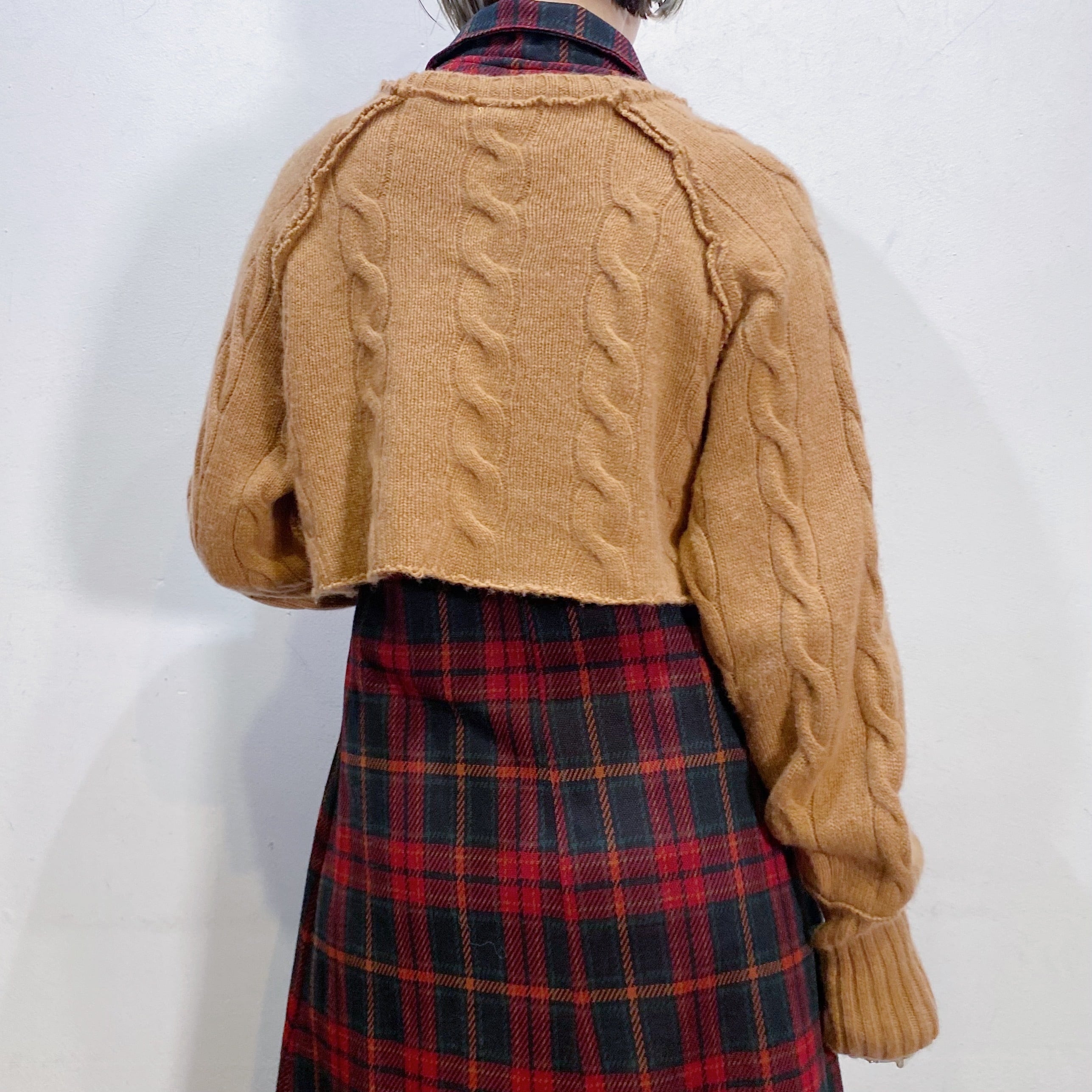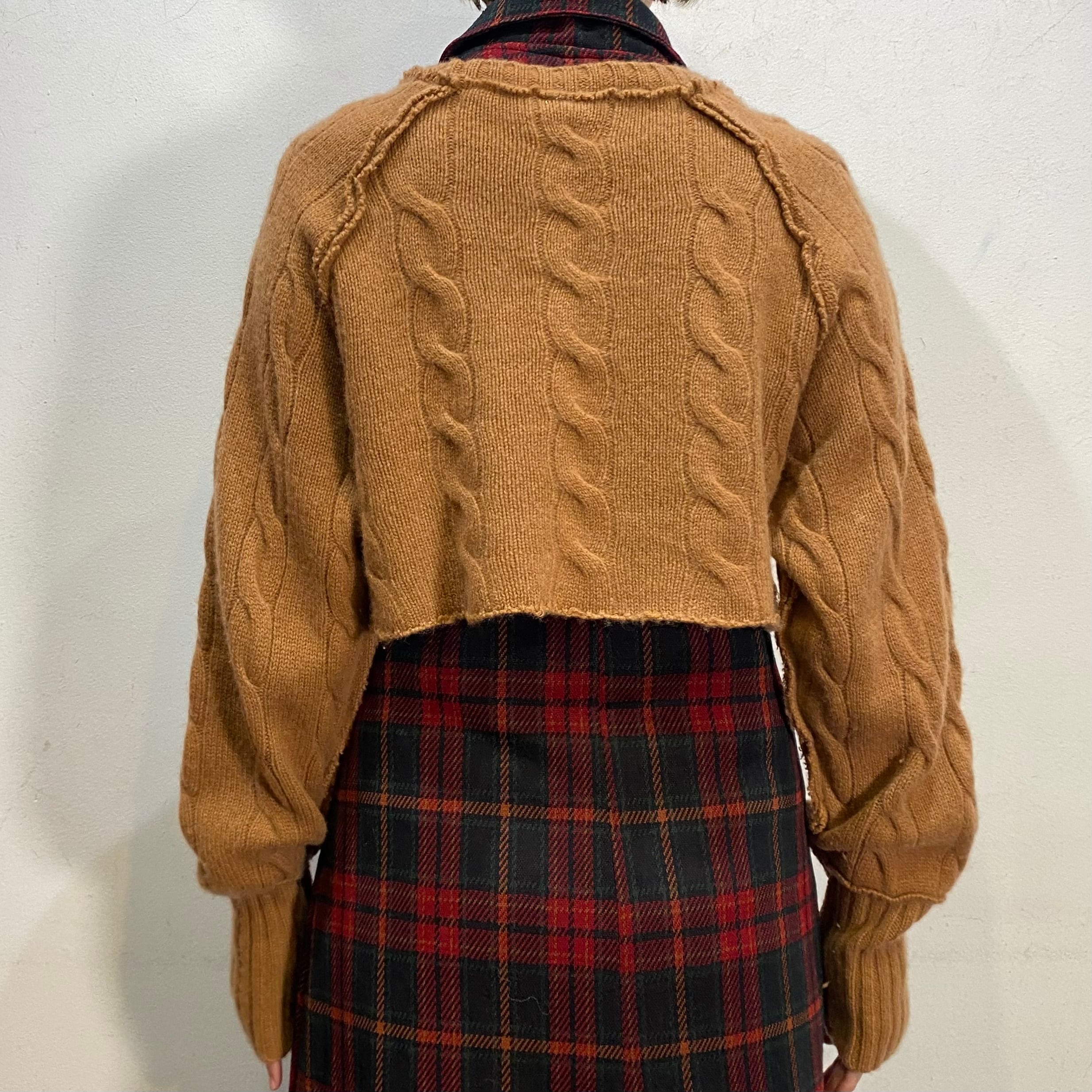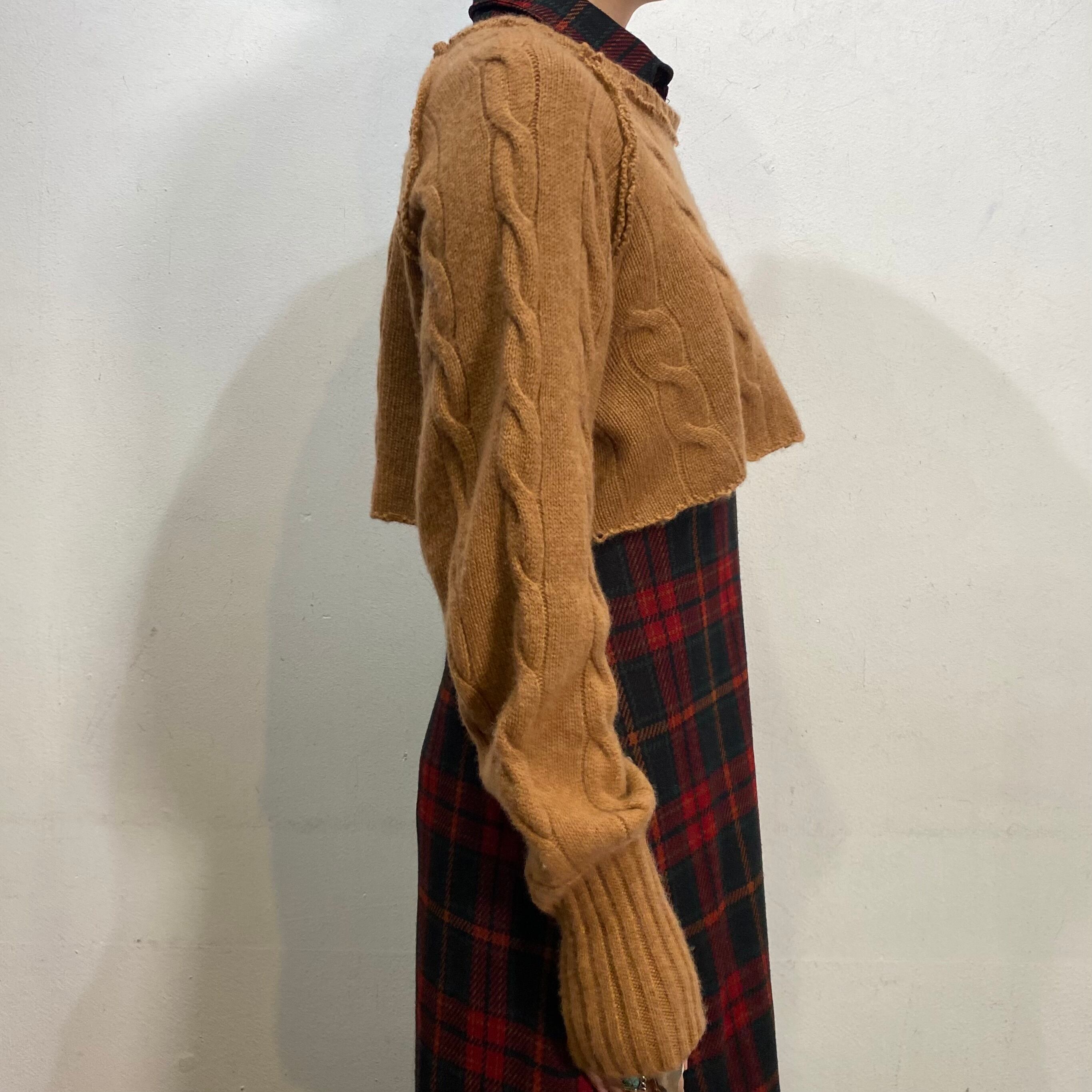 全体はケーブル編みなのに袖口だけ長めのリブ、そして敢えて切りっぱなしのようなデザインがとってもキュート。