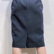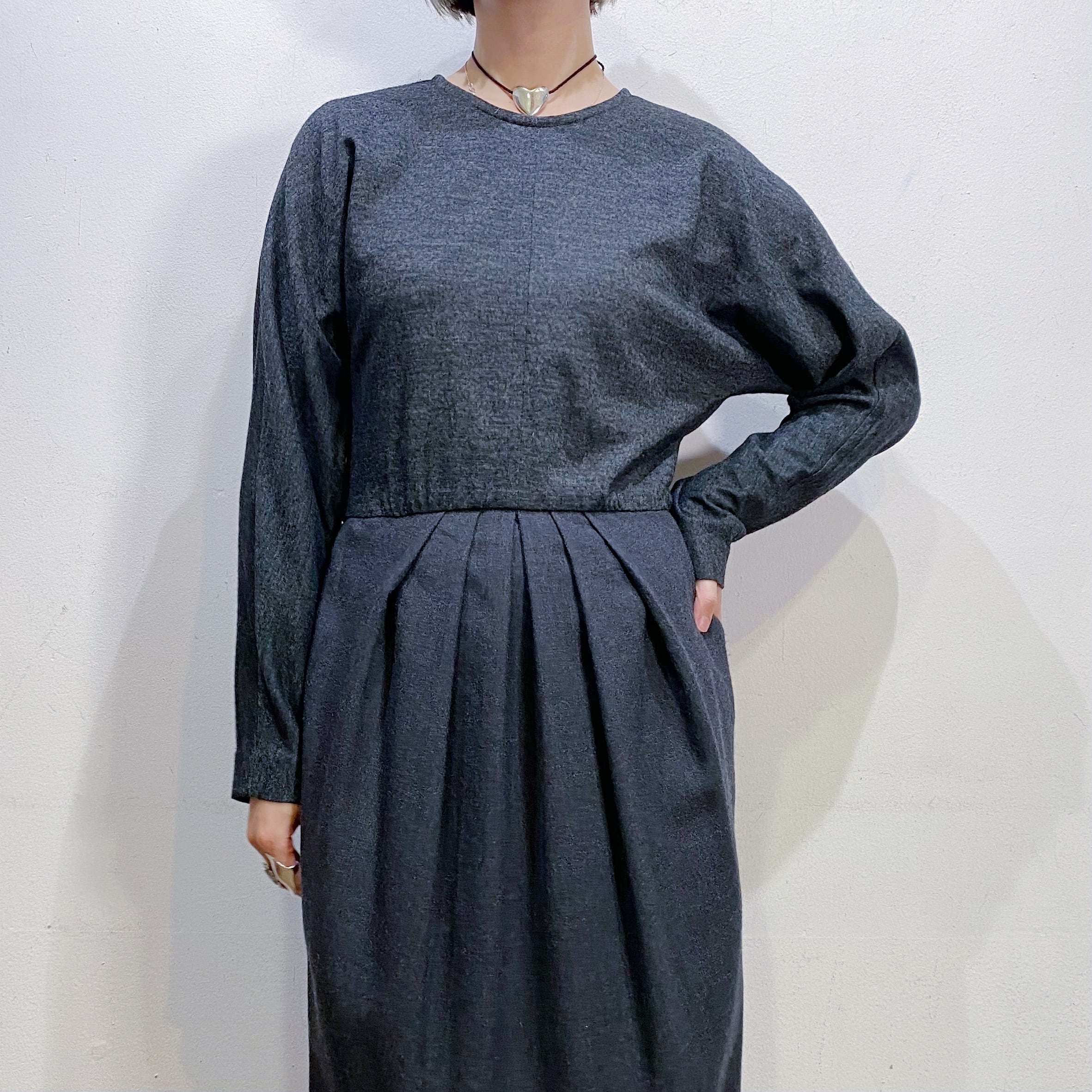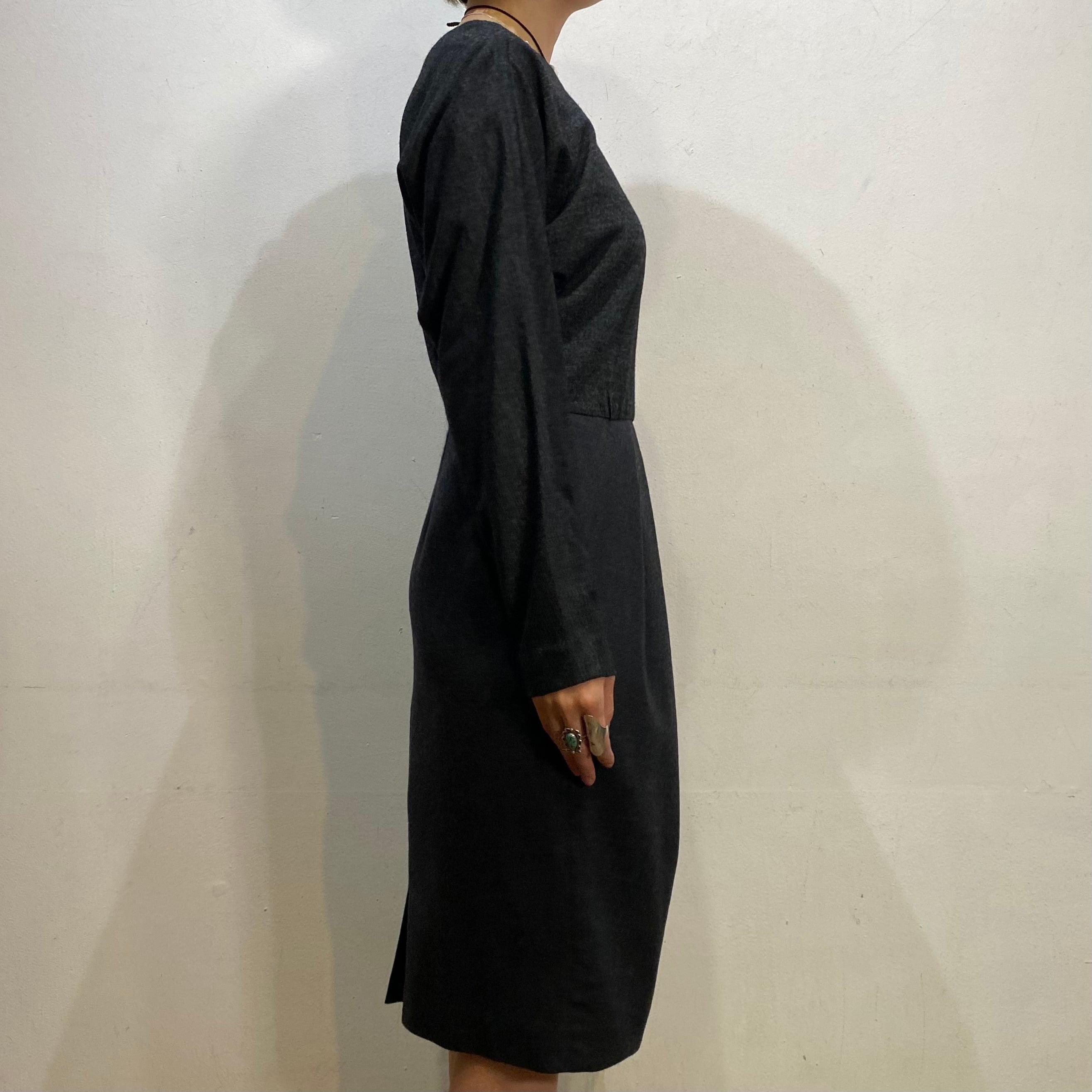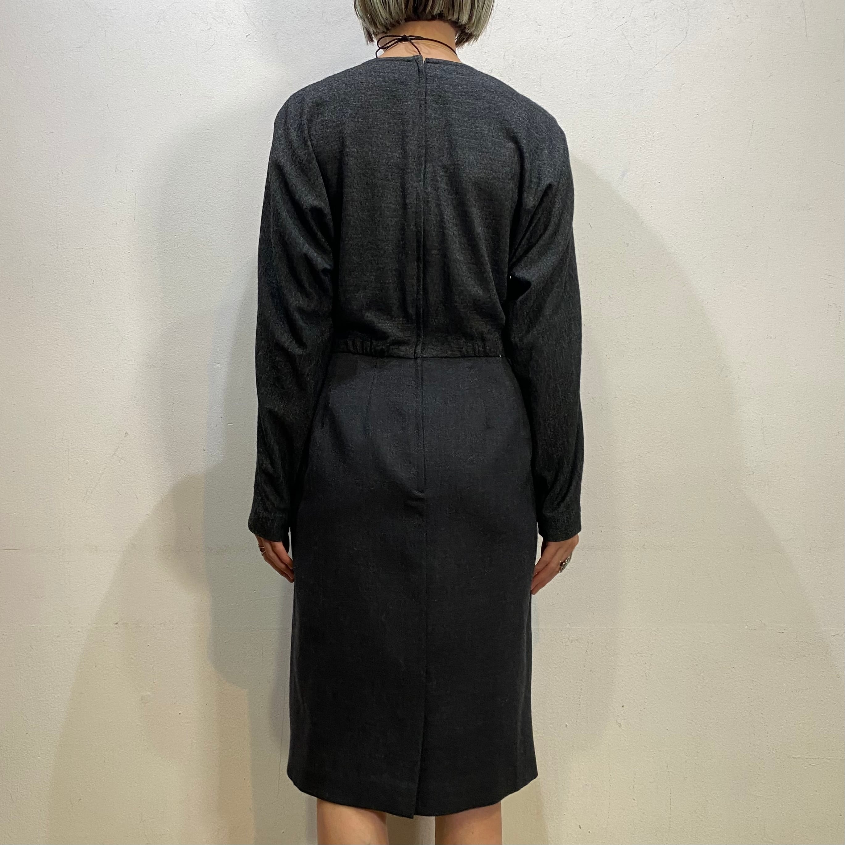 チャコールグレーのシルエットがユニークなウール混紡ワンピースです。