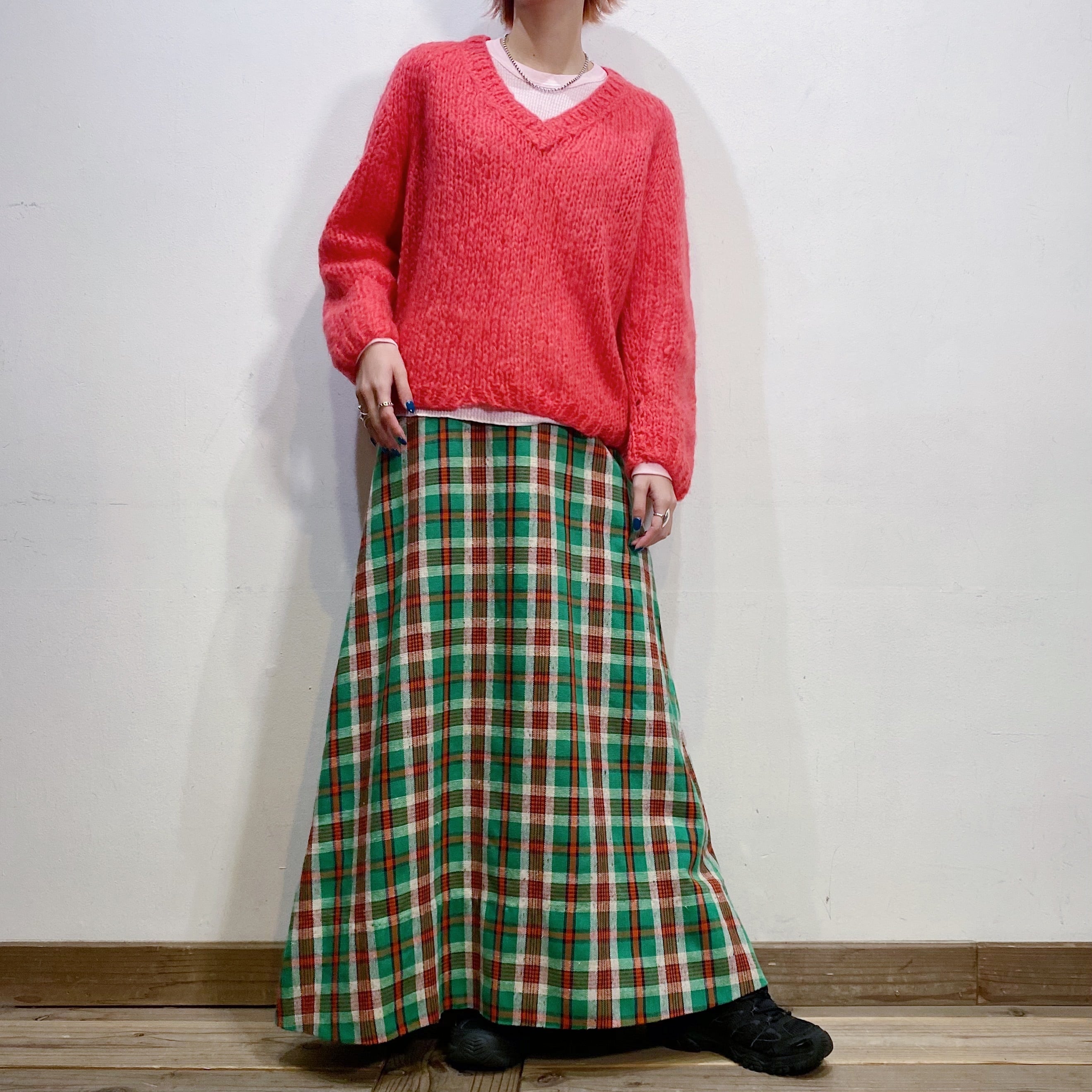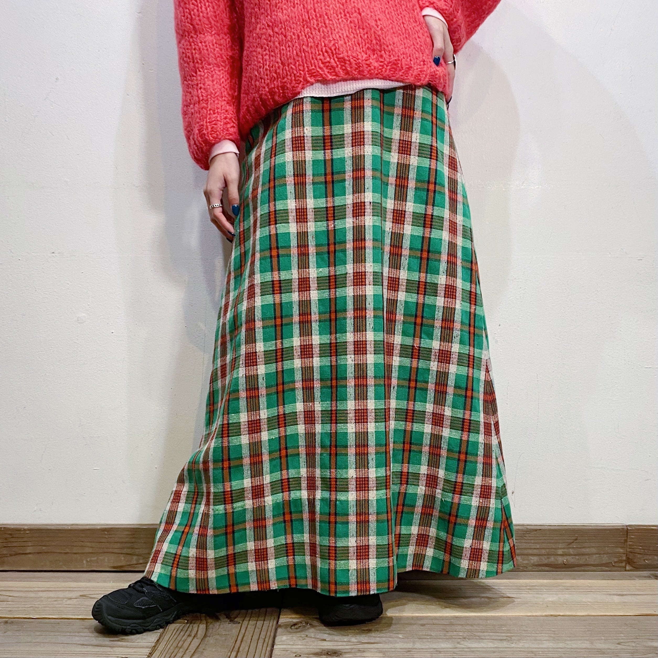 緑ベースのチェックが可愛い、70年代頃のロングスカートです。