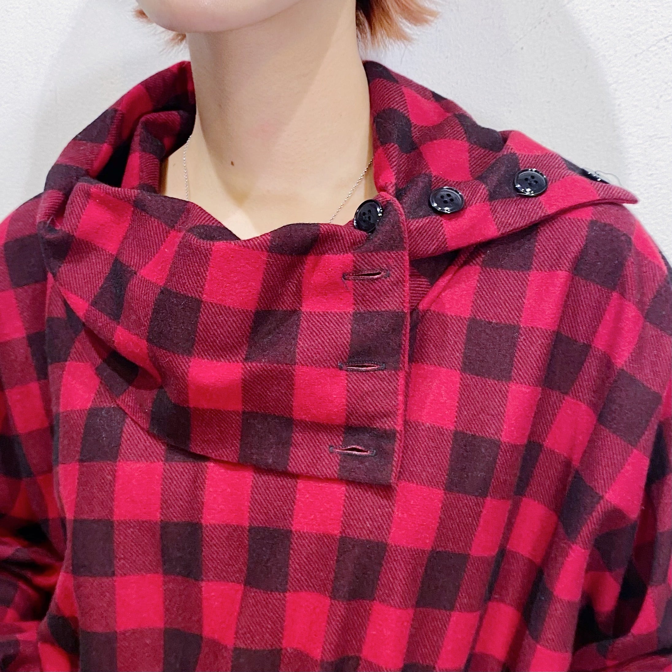 首元のボタンは閉じるとハイネックになりますが、お好みの開け具合によって印象を変えて楽しめますよ。