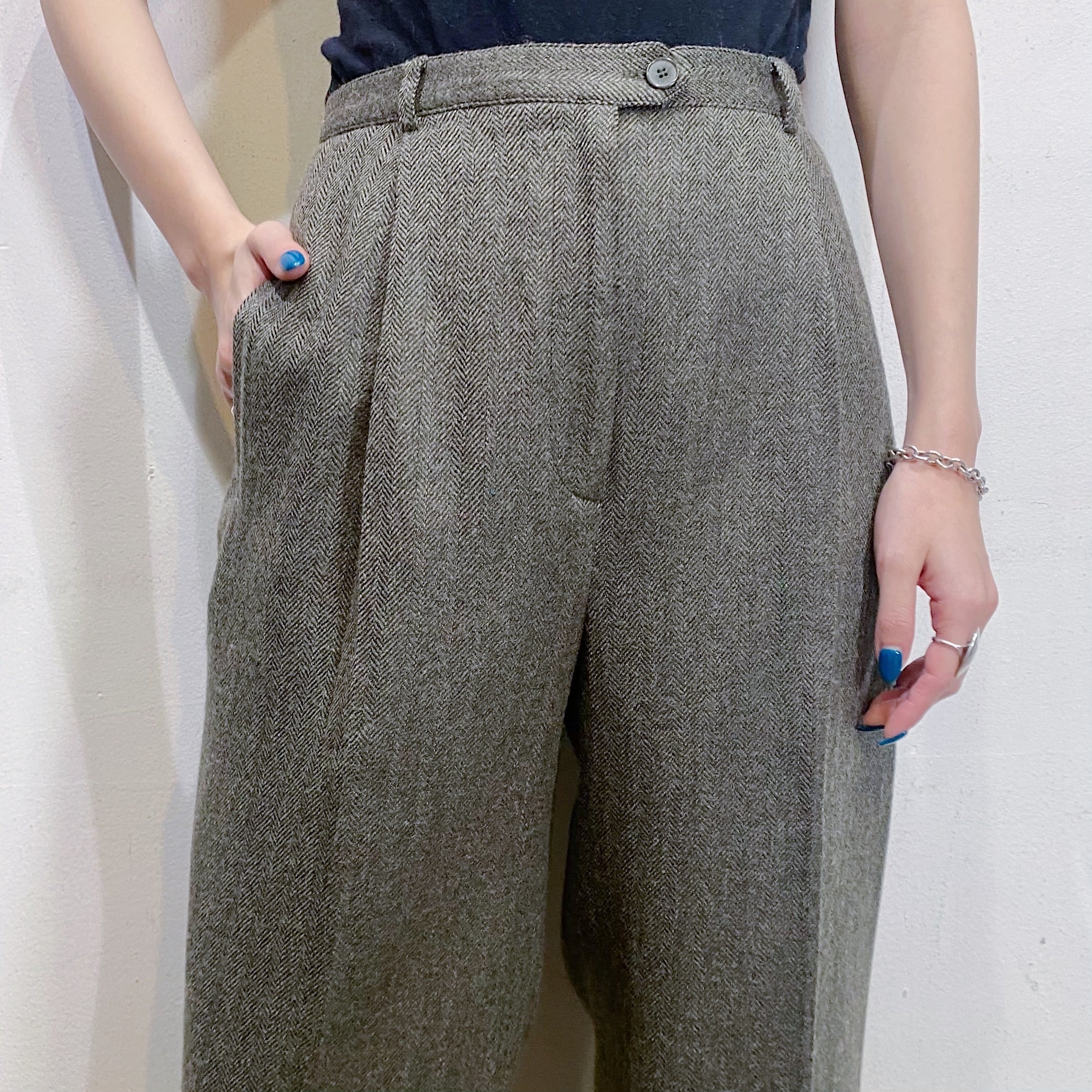 グリーンとグレーの中間のような色合いで着こなしやすい、スラックスです。