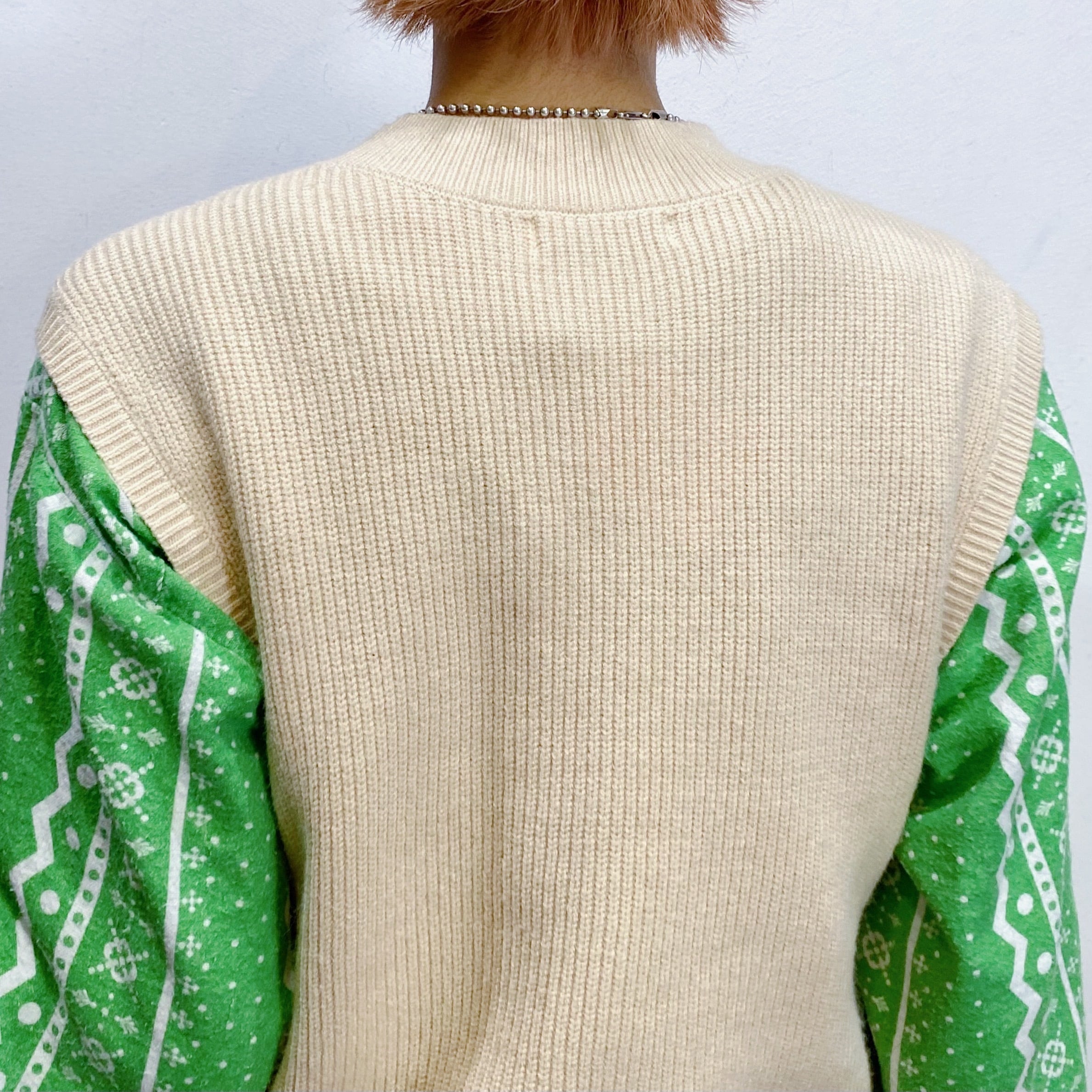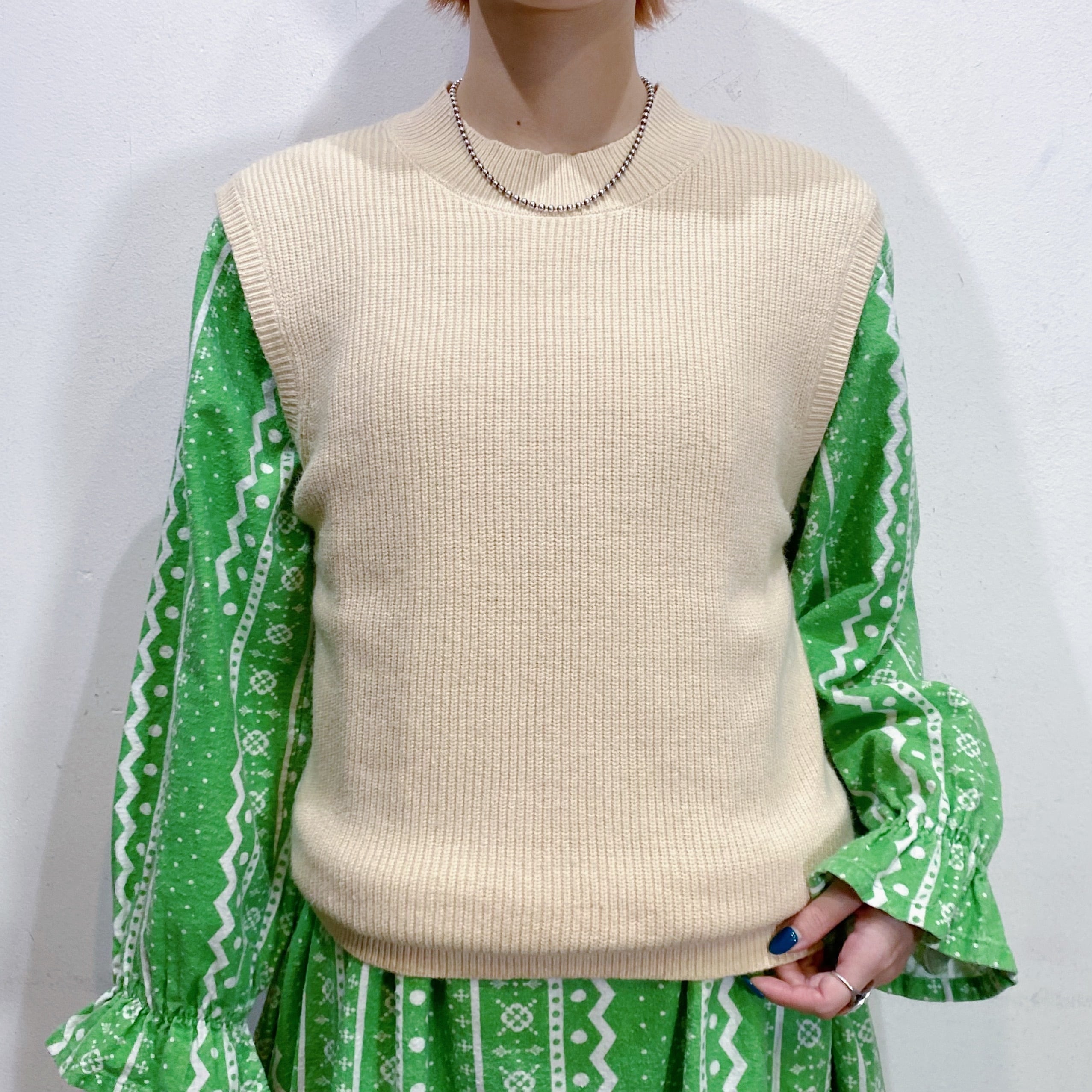 クリーム色でコーディネートに取り入れやすい、ニットベストです。