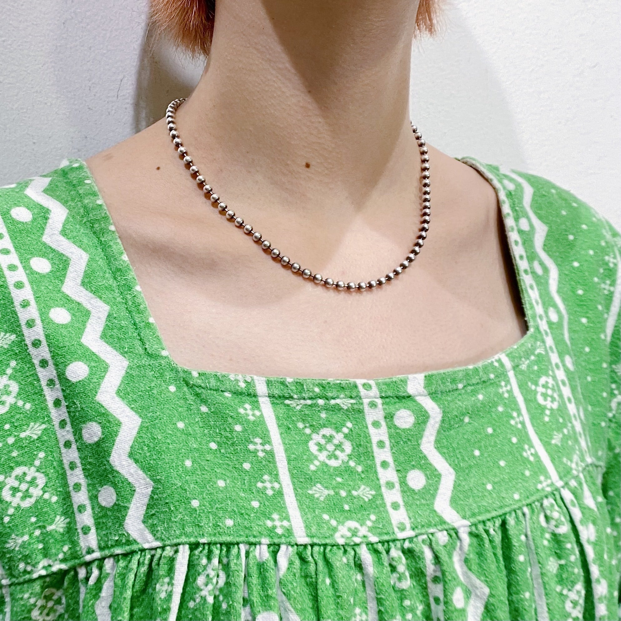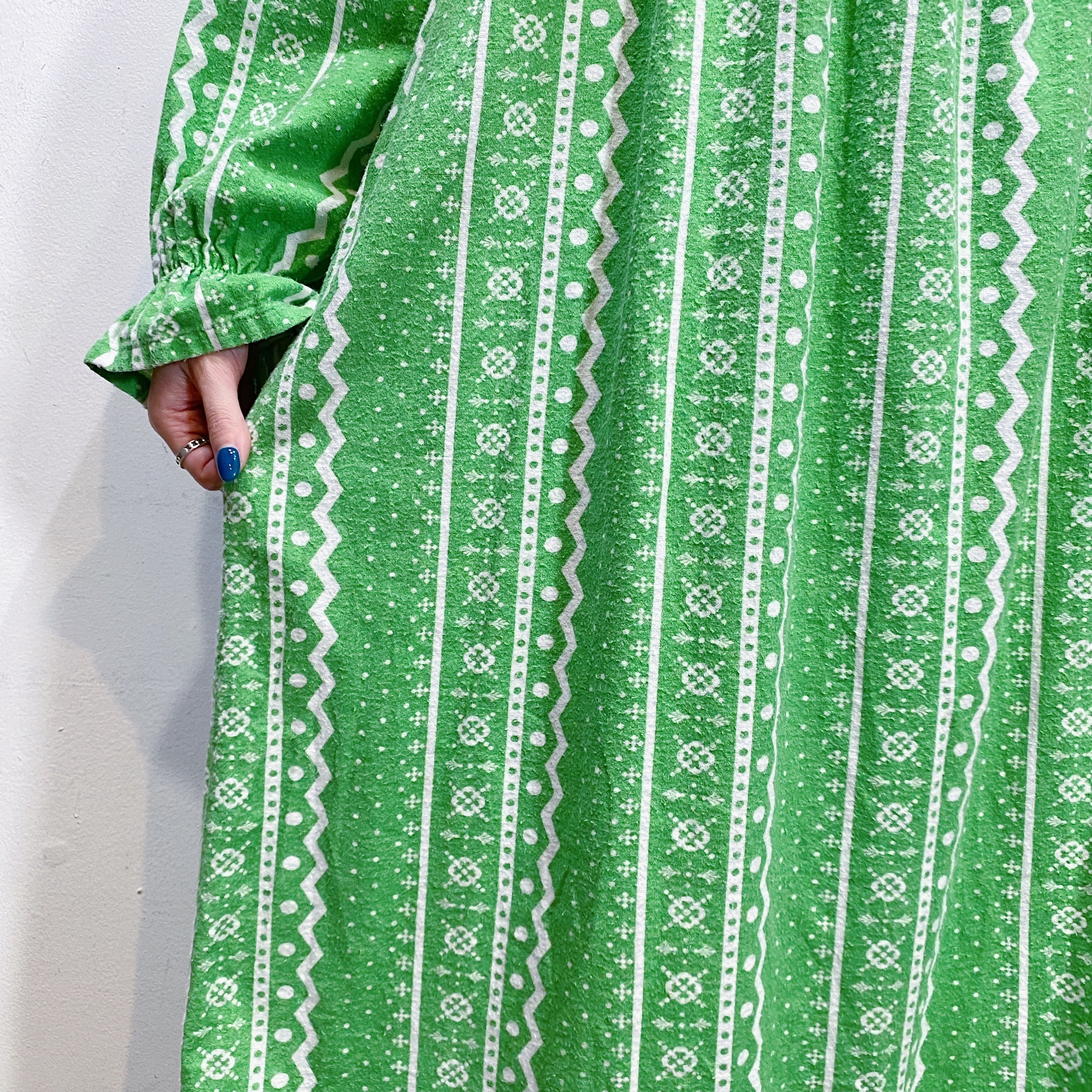 黄緑ベースにジグザグやドット、クローバーのような模様が可愛い、70~80年代のワンピースです。