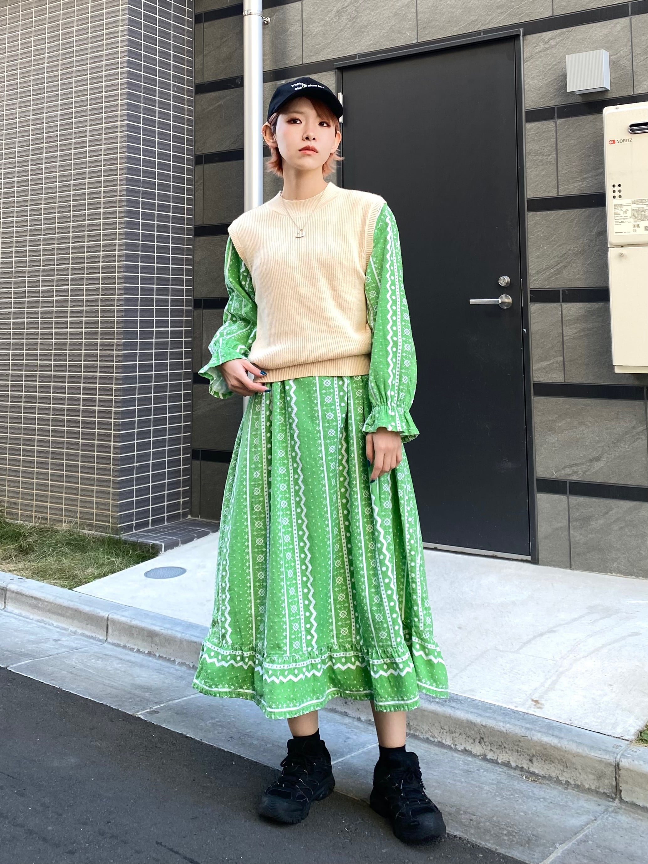 ロング丈なので単体で着ても十分に可愛いですが、着用写真のように上からベストを重ねたり、インナーにハイネックやブラウスなどを着てもまた違った印象で楽しめますよ。