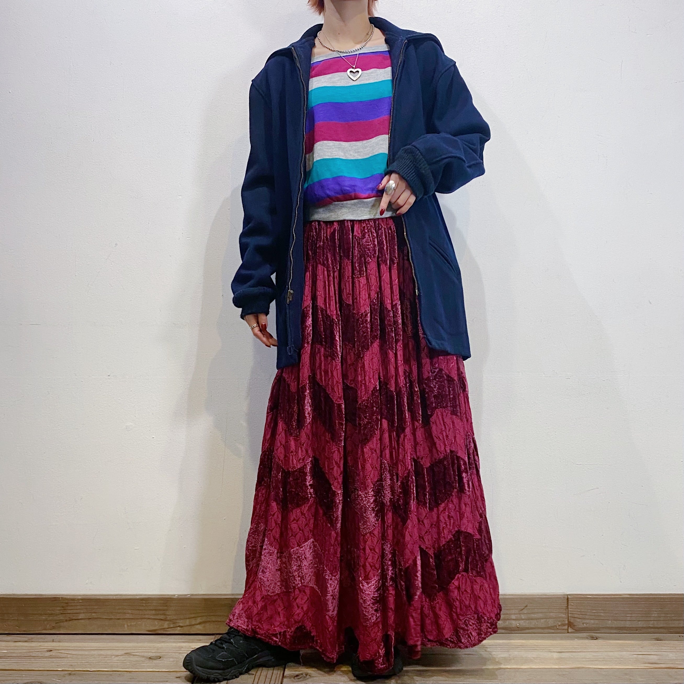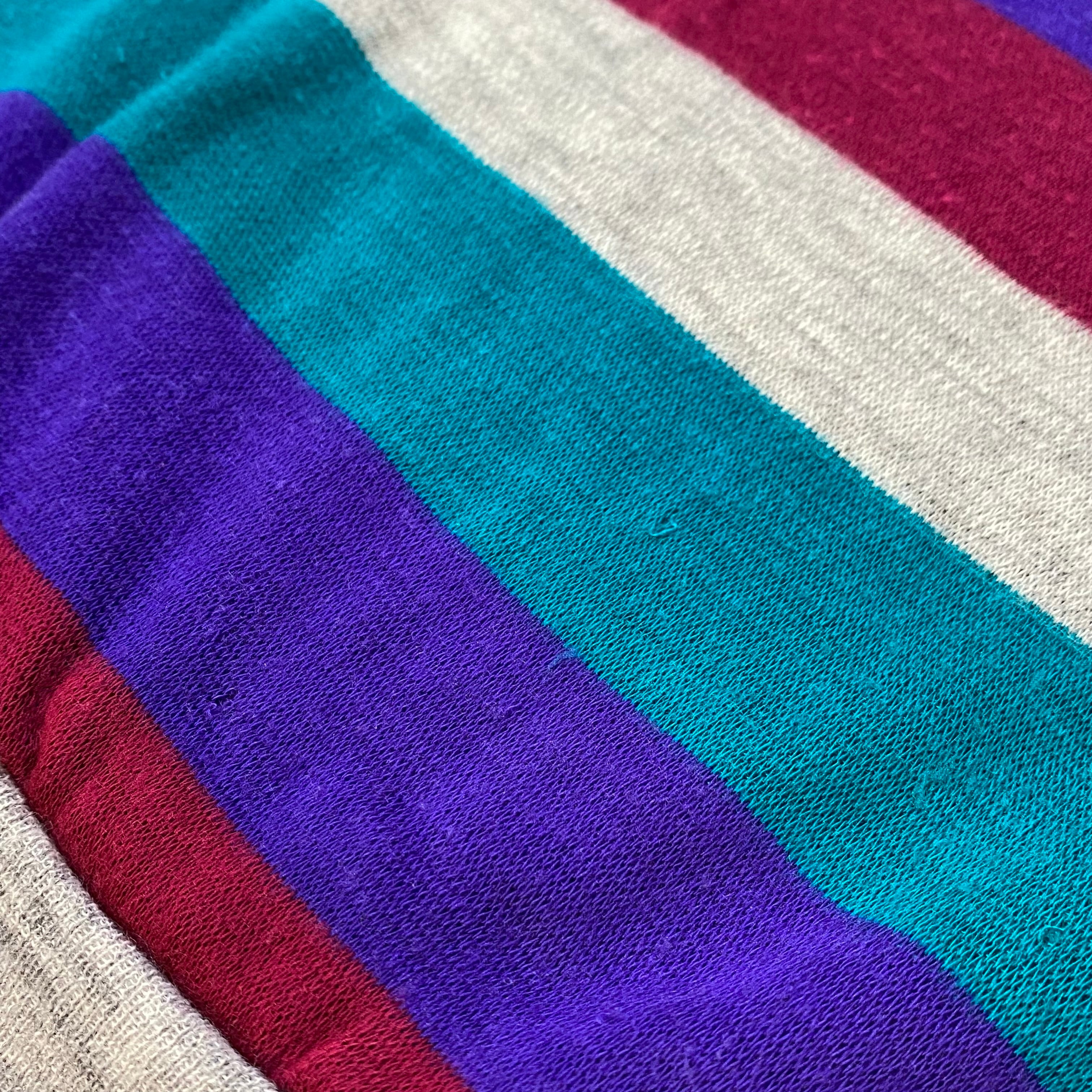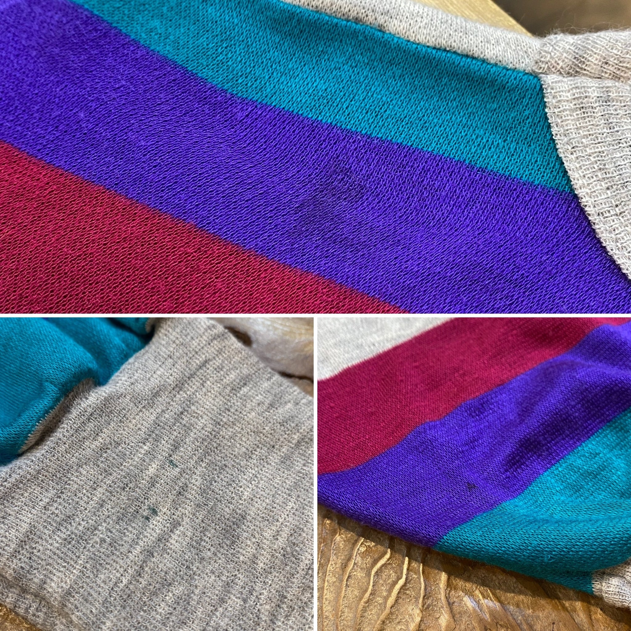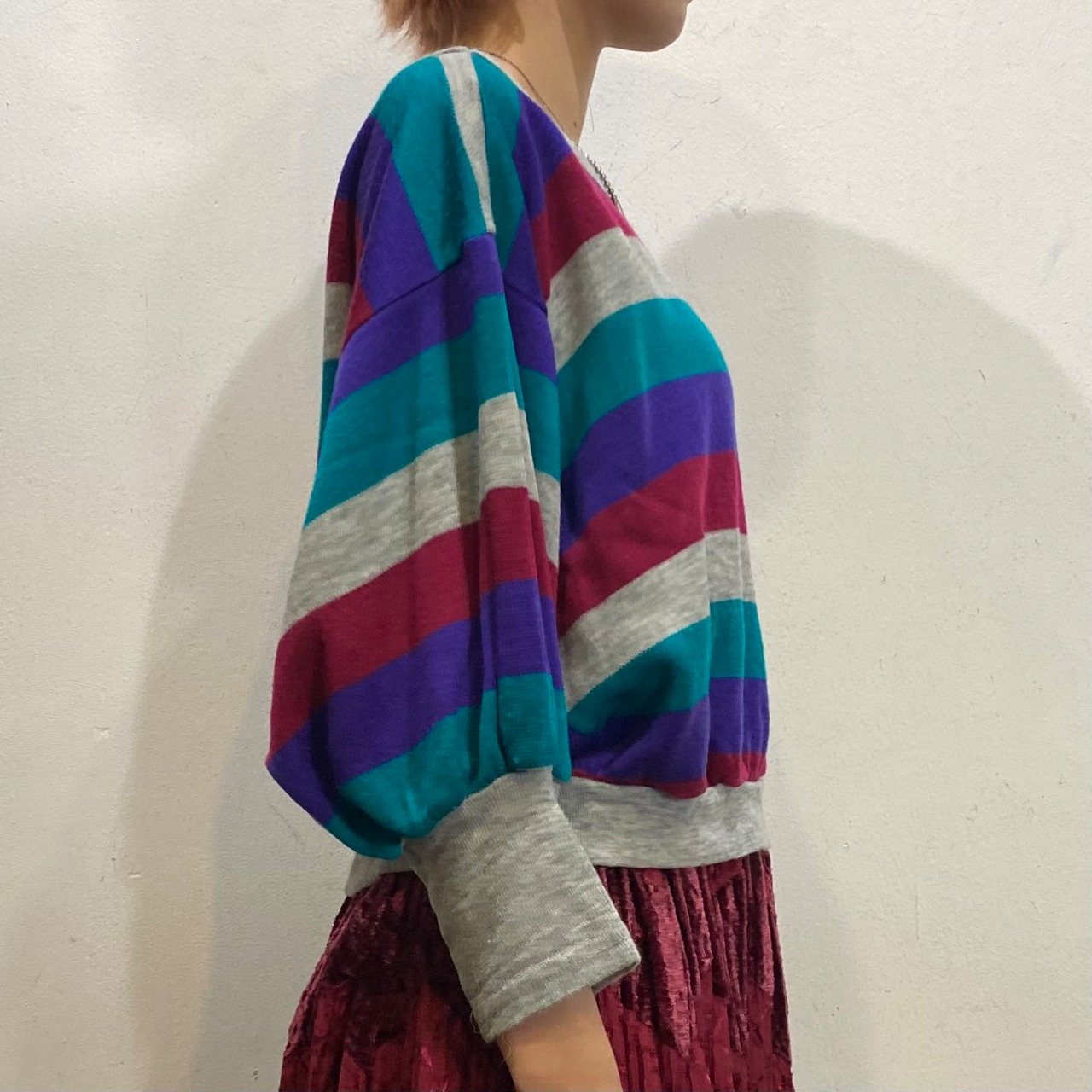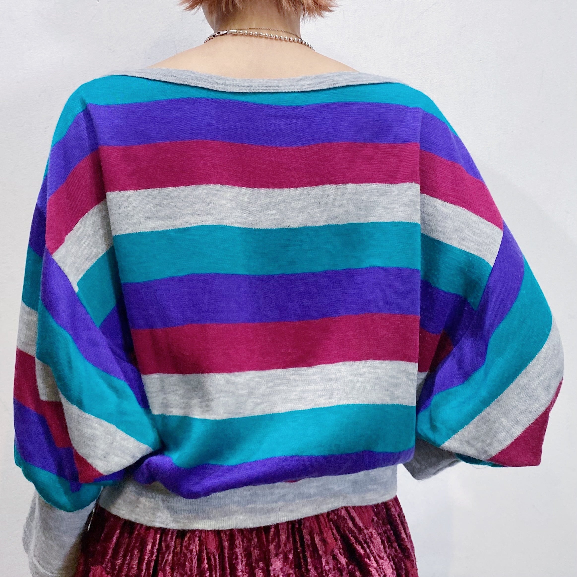 パープルやグレー、ピンクなどの色合わせが可愛い、80年代のストライプ柄のトップスです。