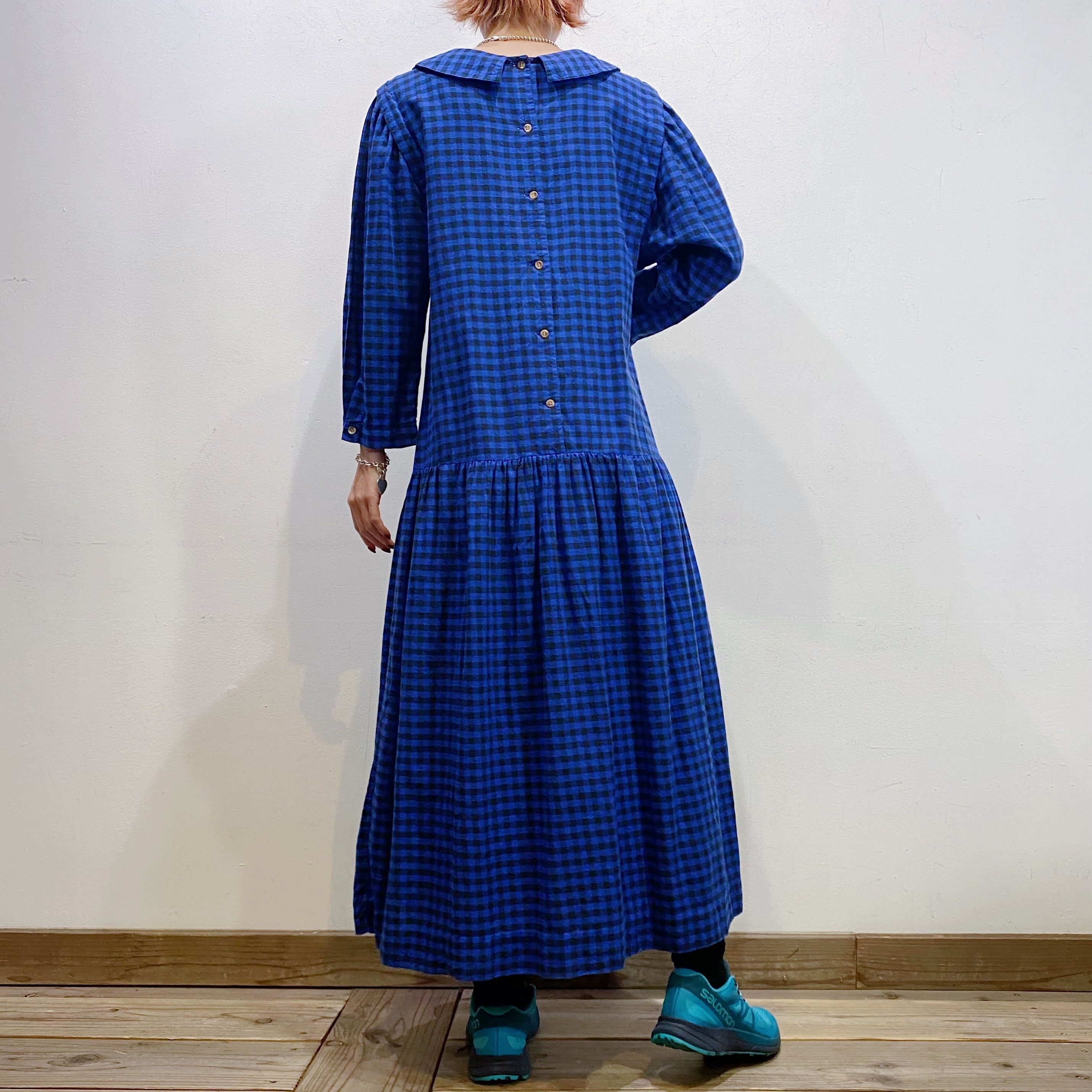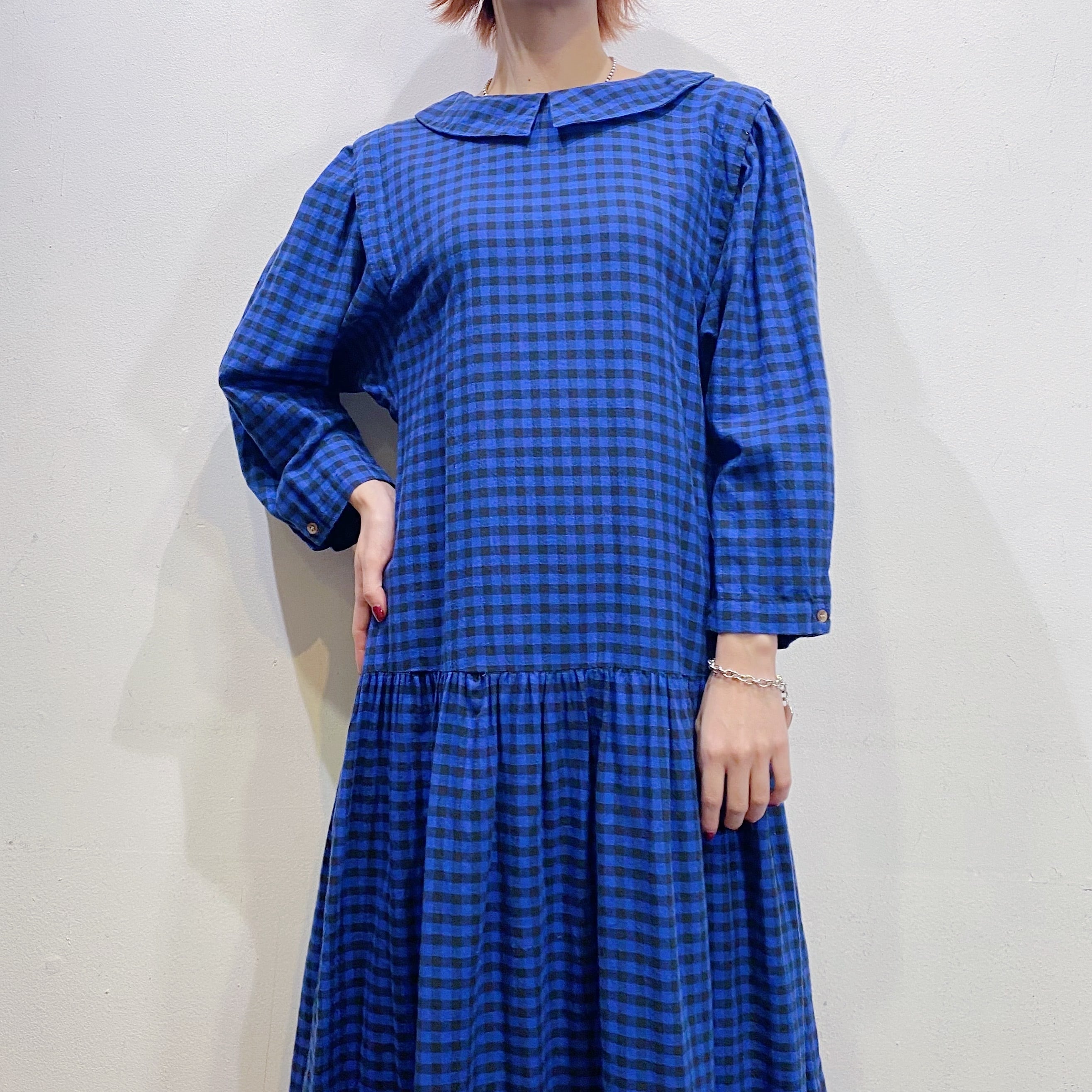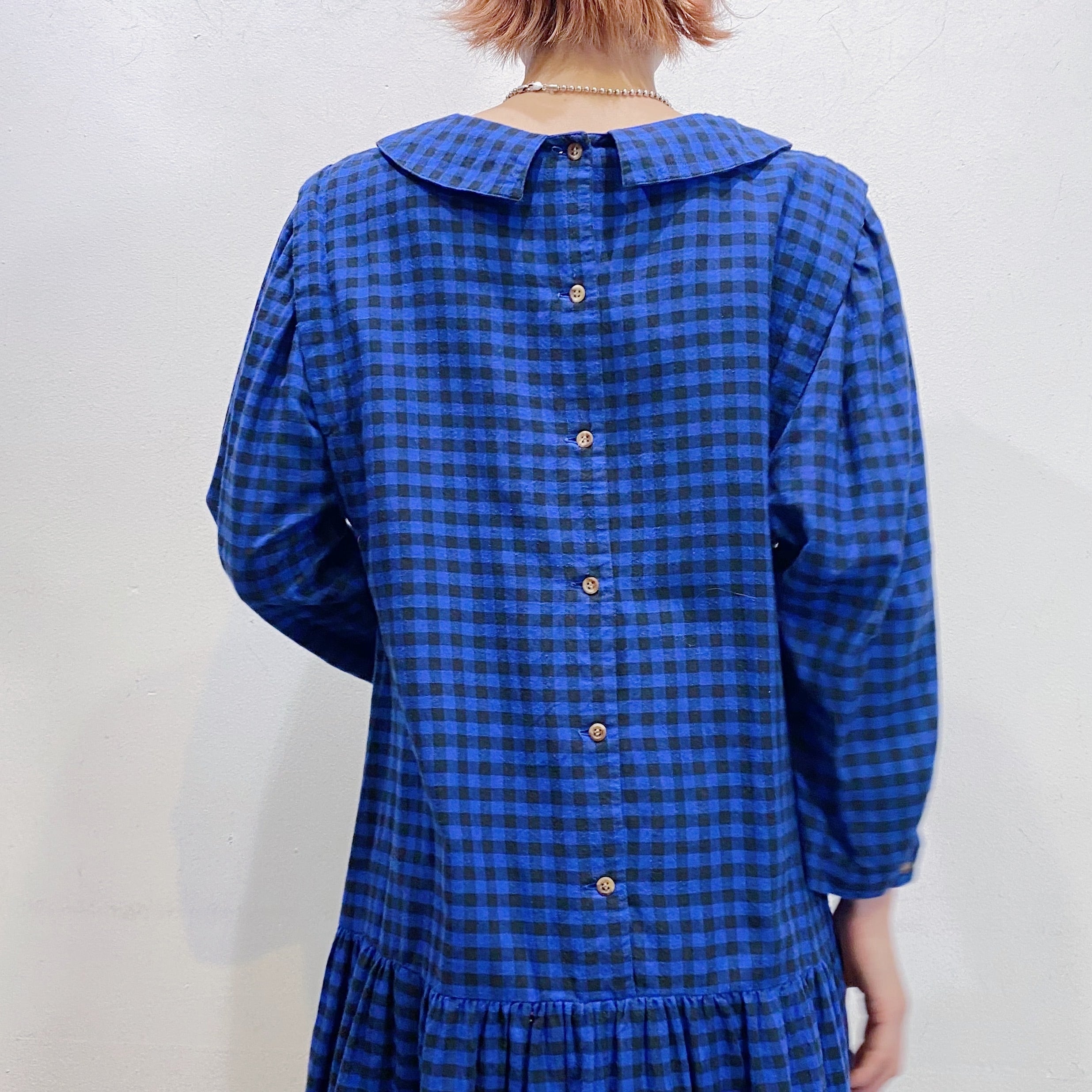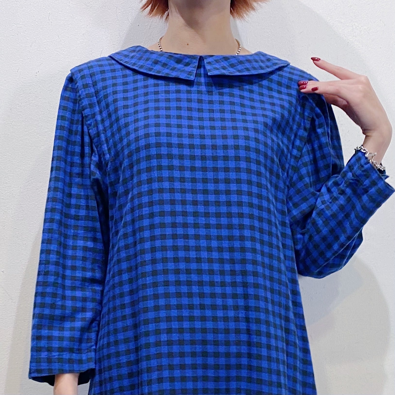 ネルシャル素材の、襟やローウエストが可愛いワンピースです。
