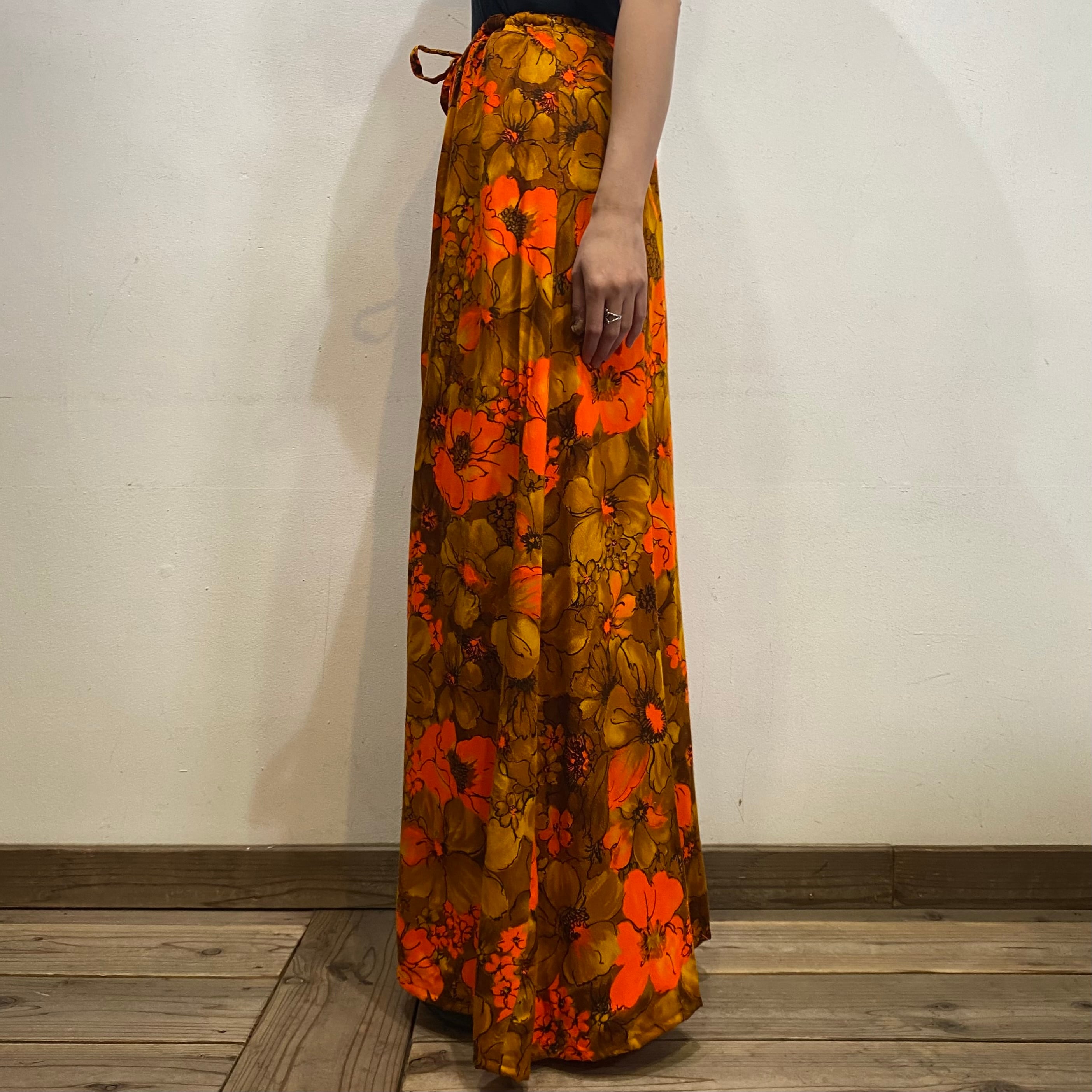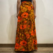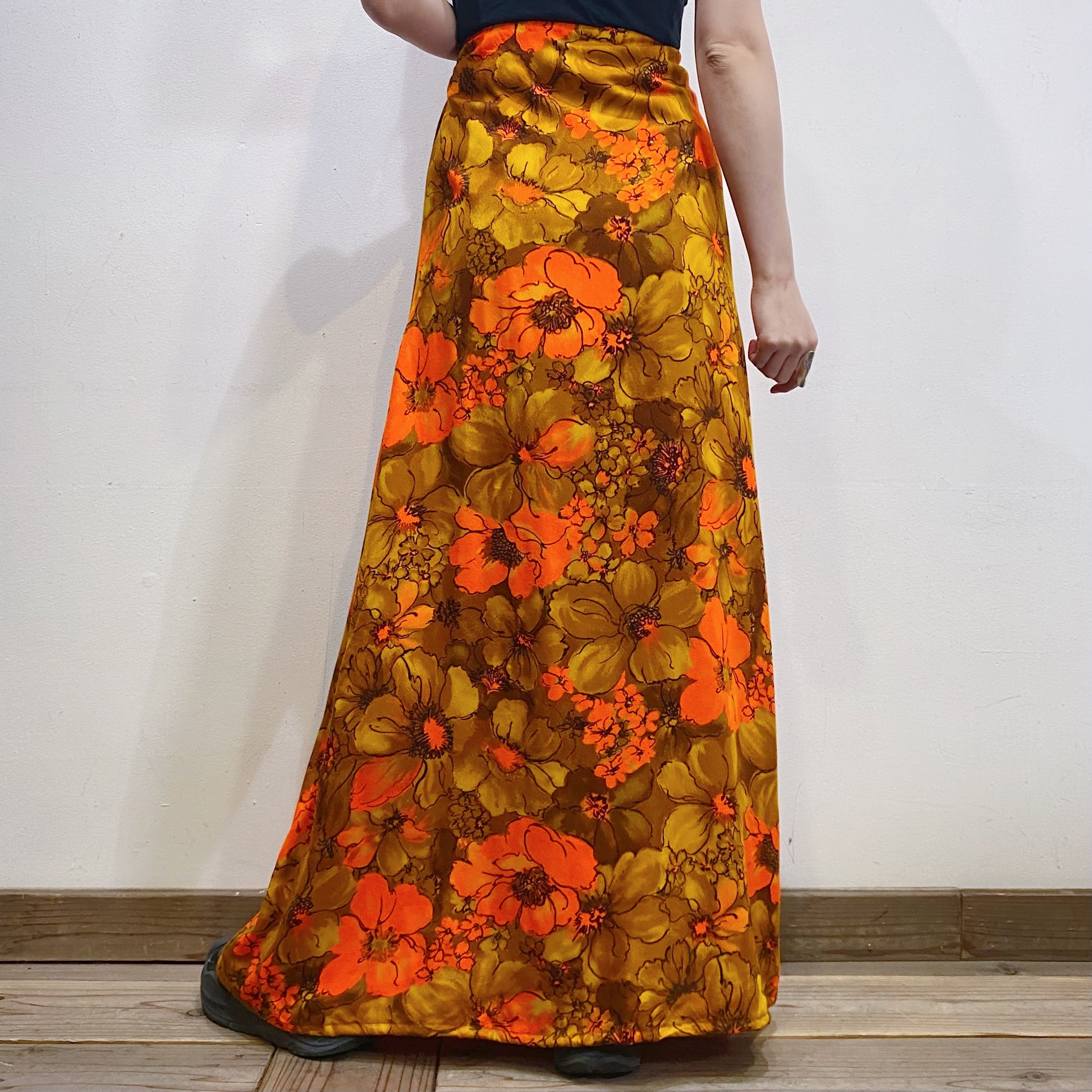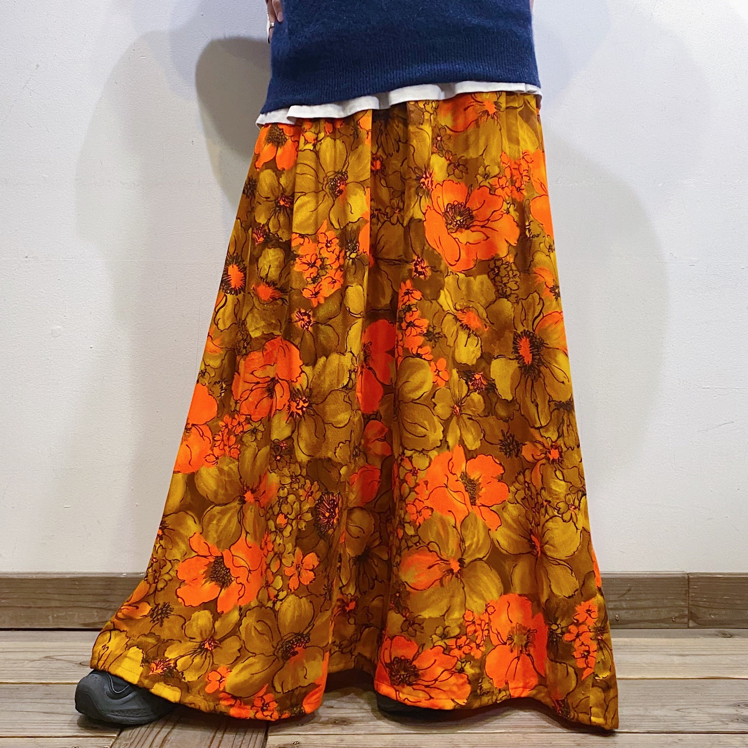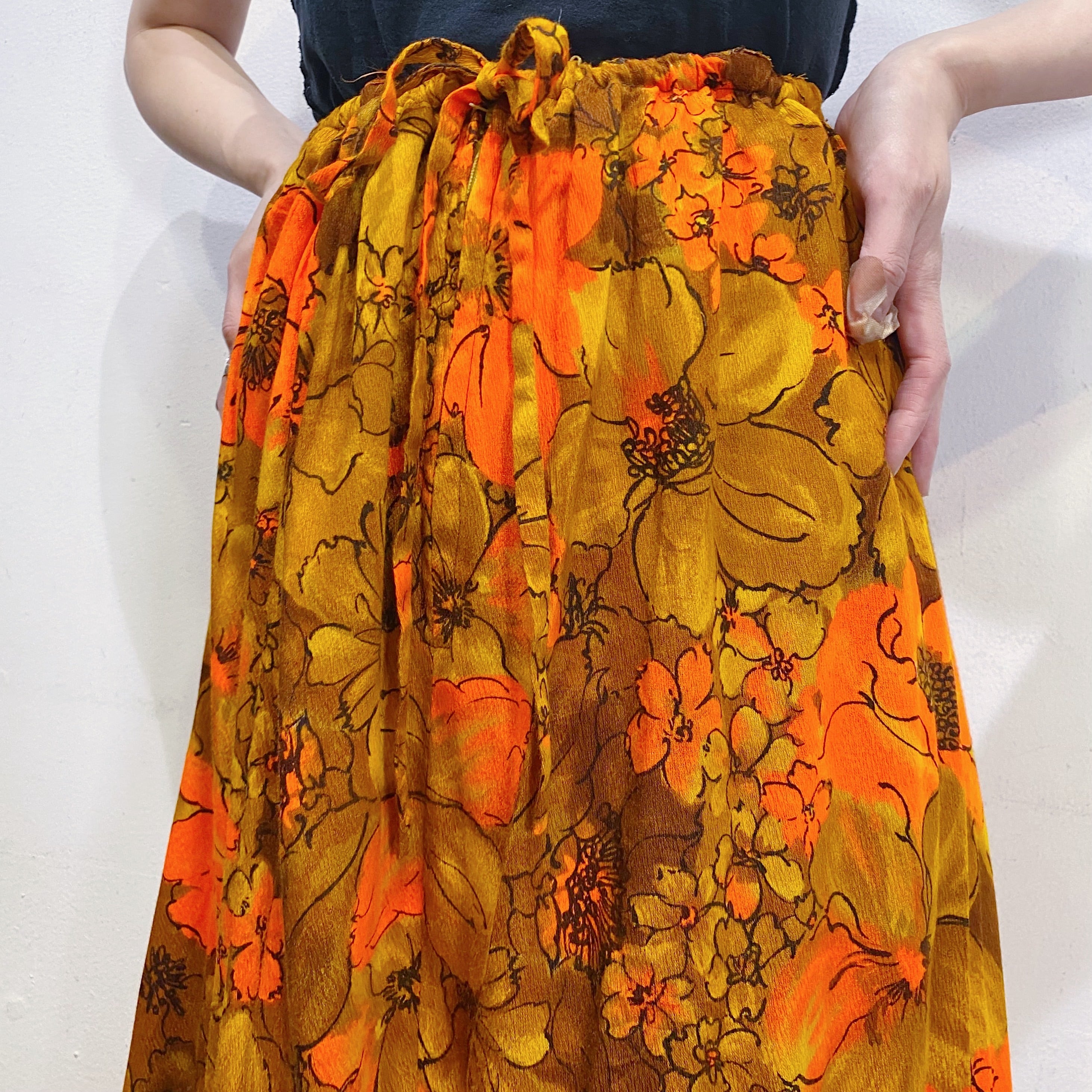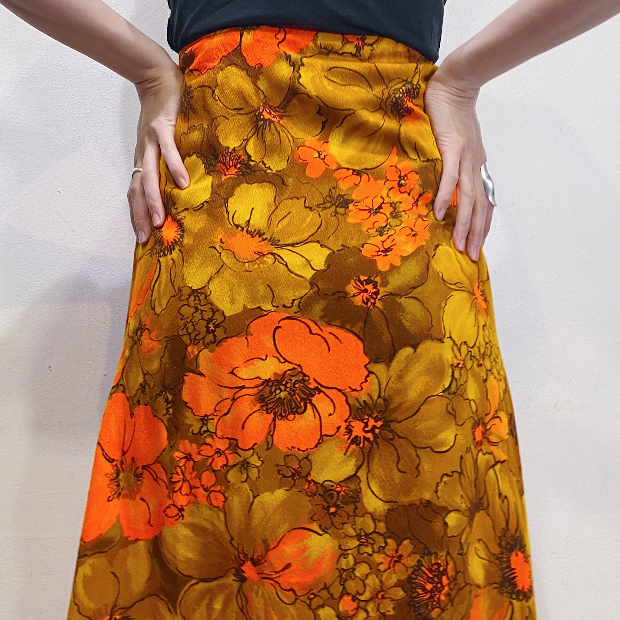 オレンジとブラウンの色合わせが可愛い、70年代の花柄スカートです。